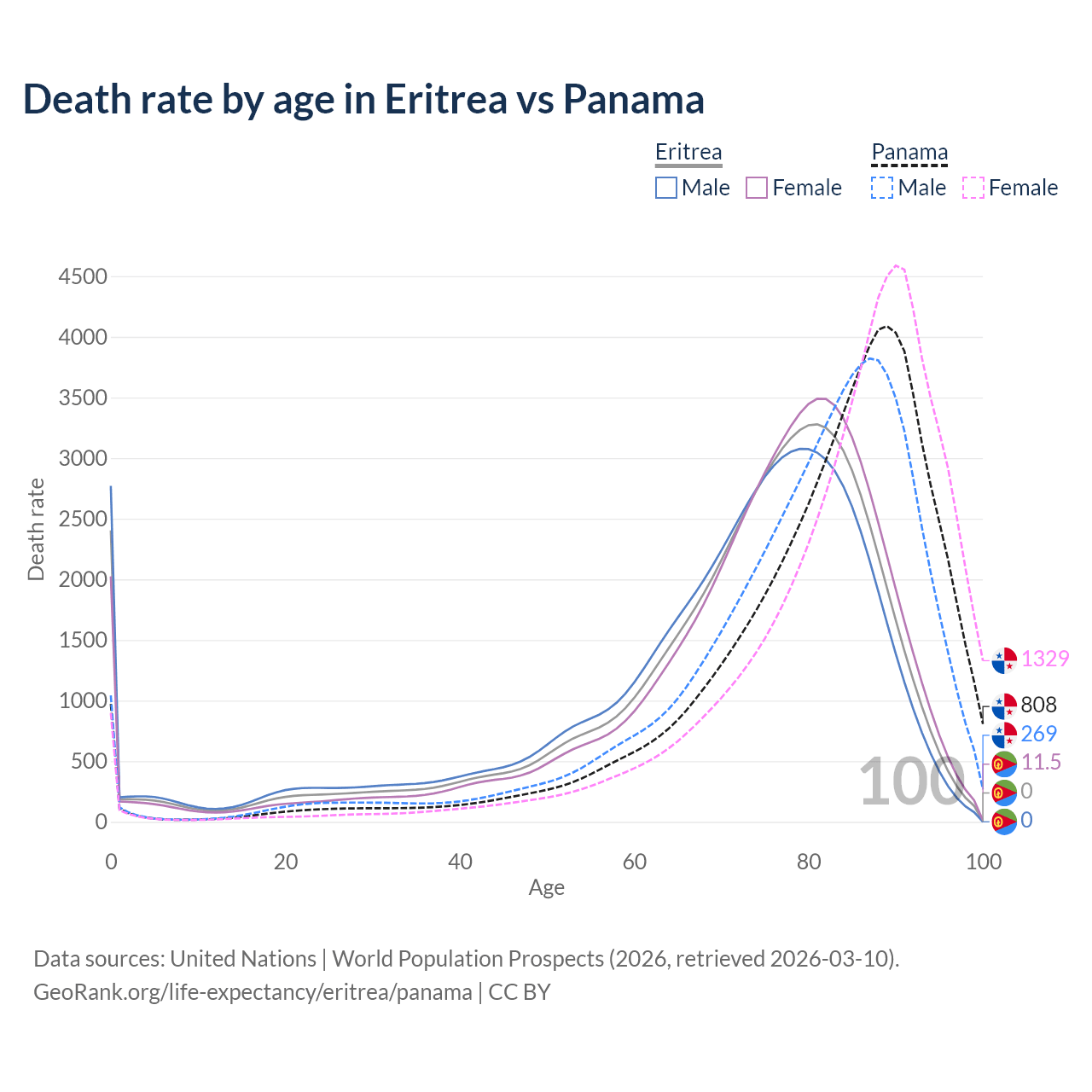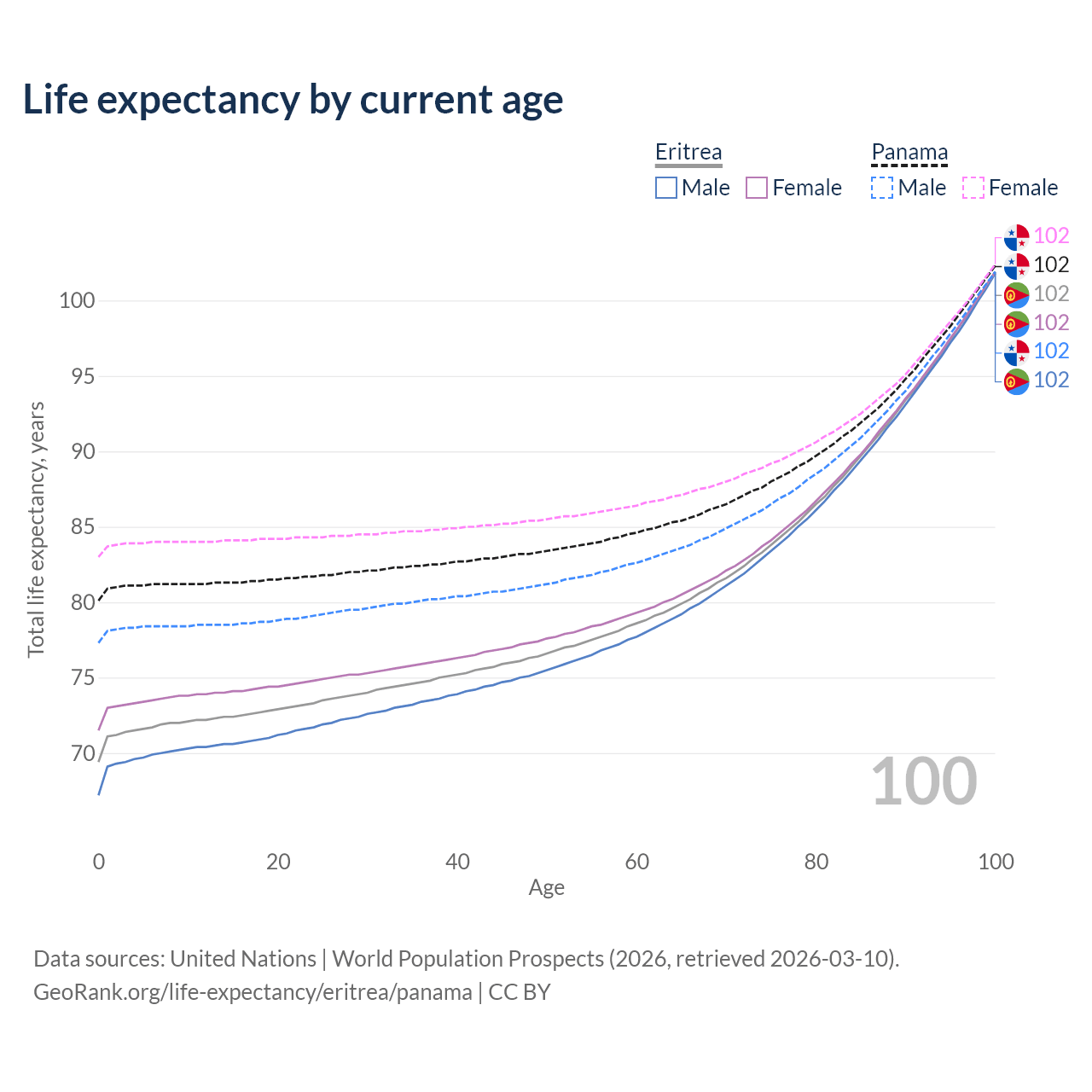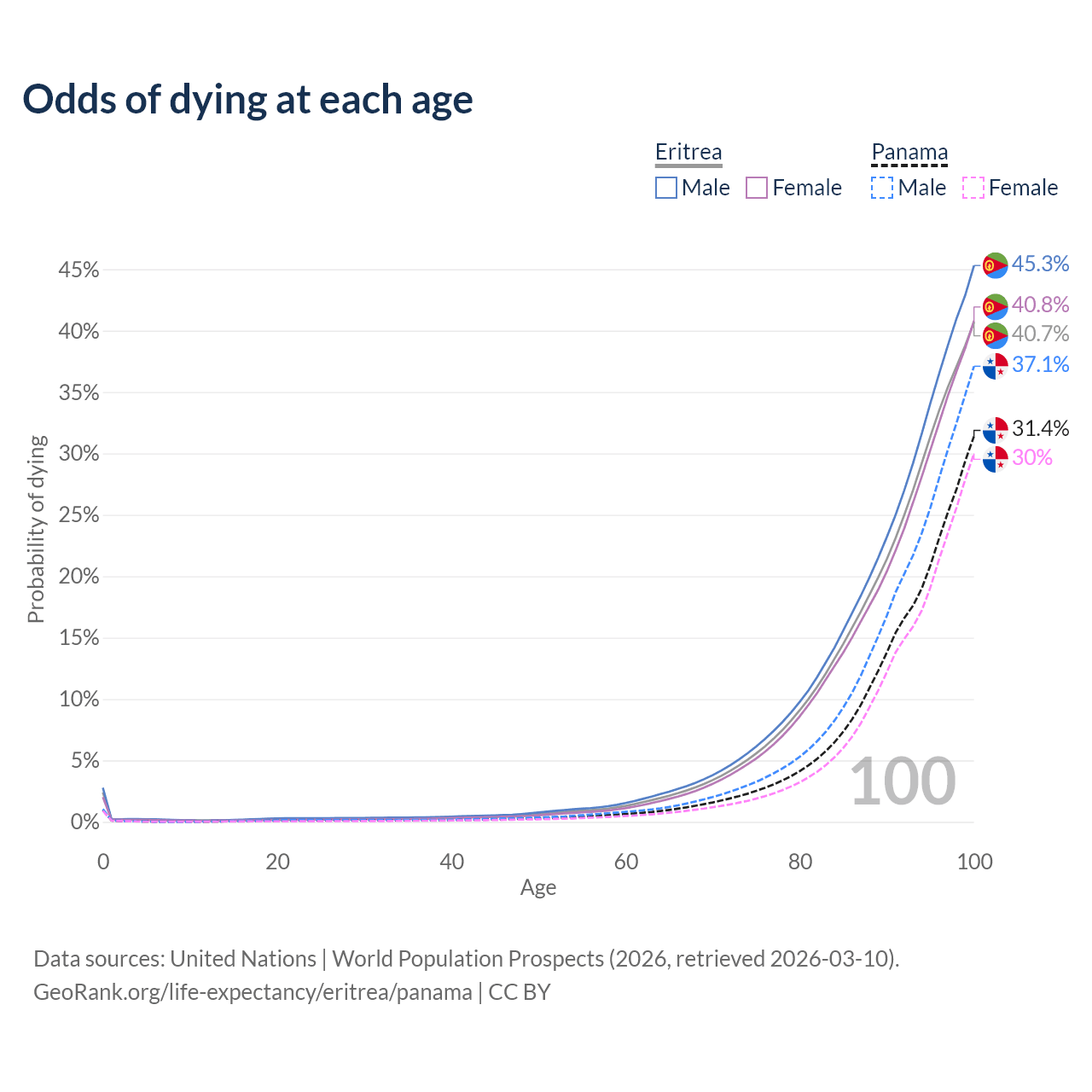 This life expectancy calculator shows the odds of living to 100, 95, 90, and below based on current age for both males and females in Eritrea and Panama, along with mean and median age of death. The calculations are based on the 2026 life tables (actuarial tables) from the UN World Population Prospects.