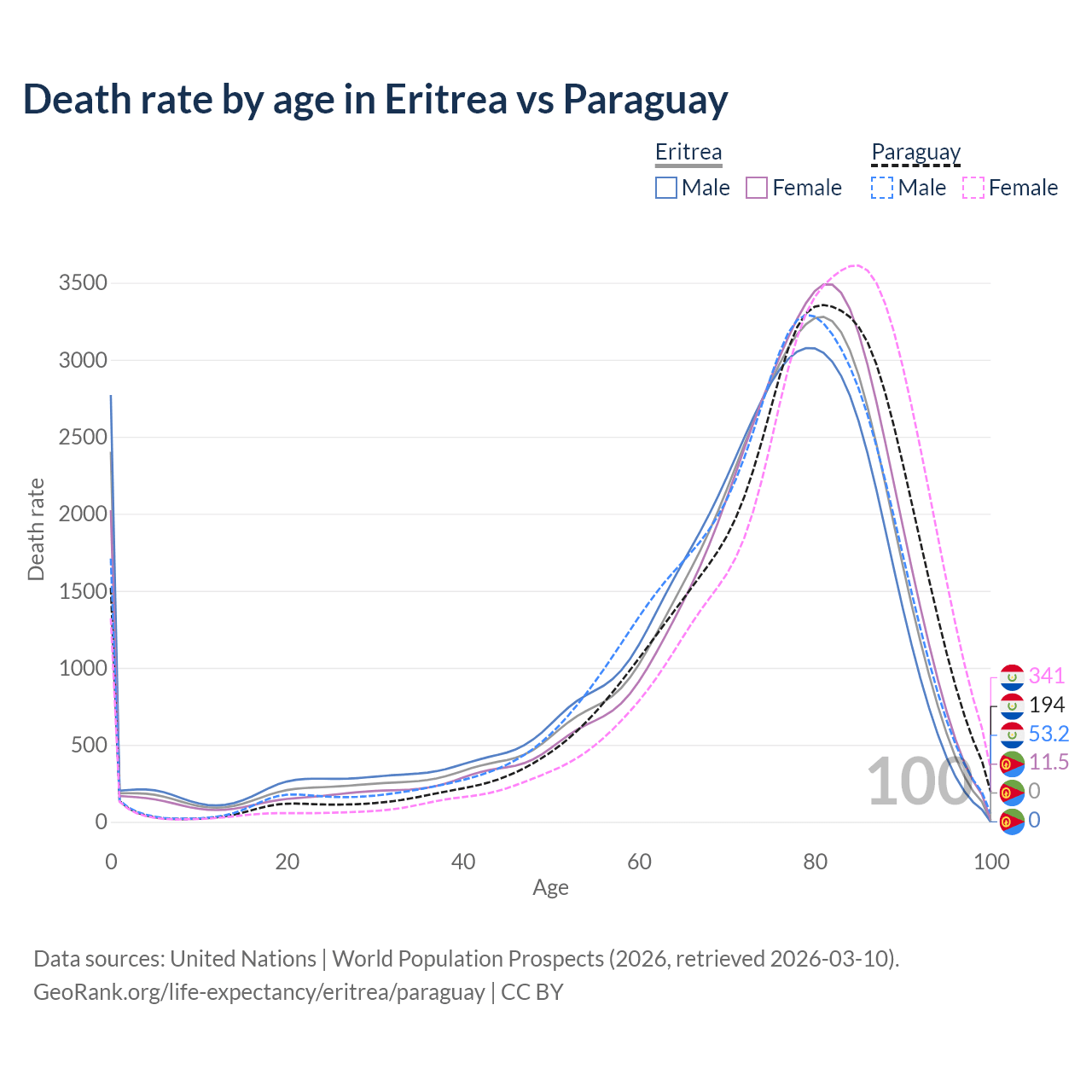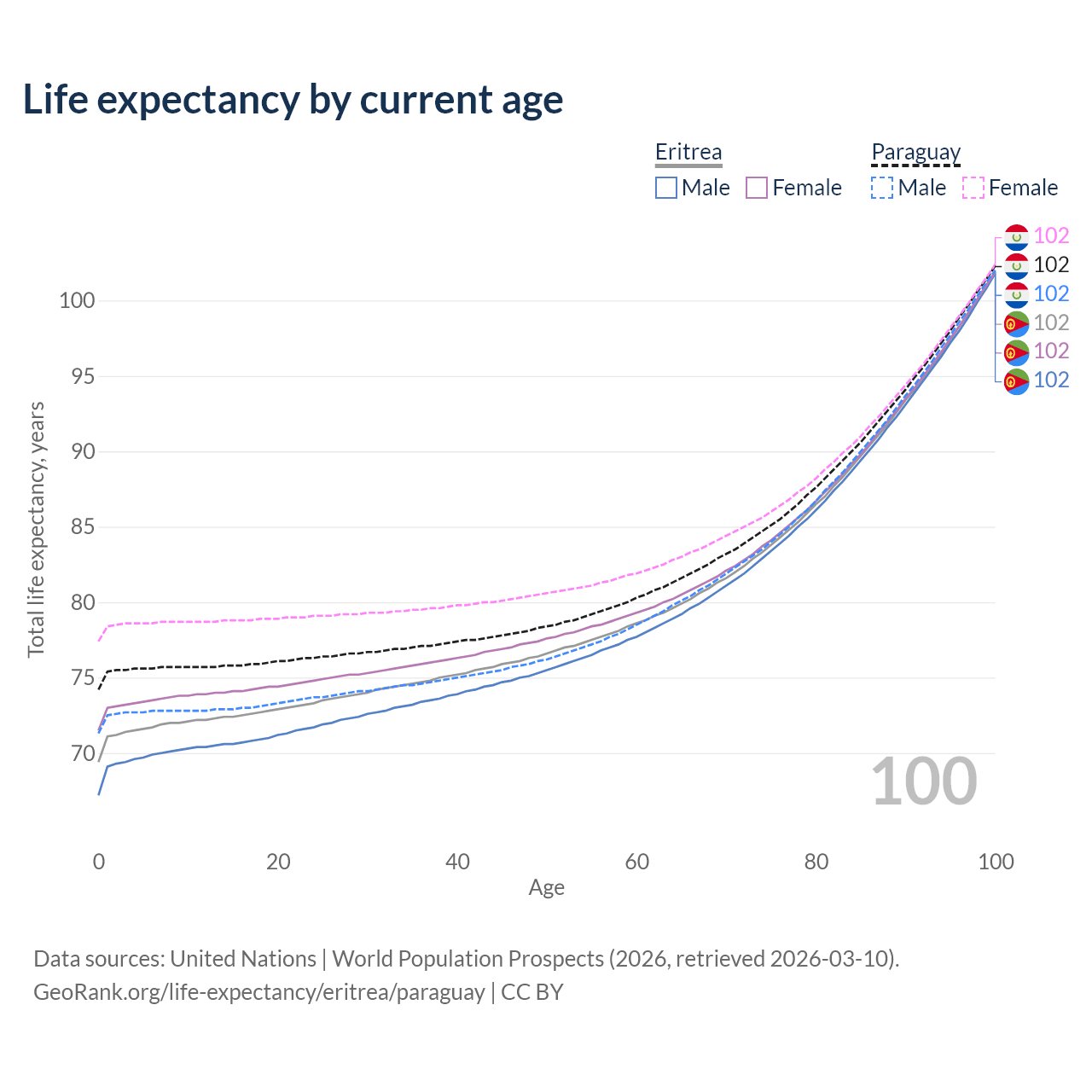 This life expectancy calculator shows the odds of living to 100, 95, 90, and below based on current age for both males and females in Eritrea and Paraguay, along with mean and median age of death. The calculations are based on the 2026 life tables (actuarial tables) from the UN World Population Prospects.