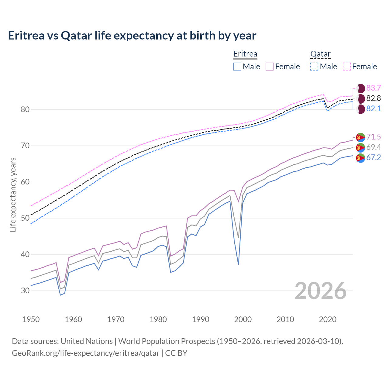 The average life expectancy at birth is 69.4 years in Eritrea vs 82.8 in Qatar. Eritrea is ranked 142/197 by life expectancy, and Qatar is 23/197. In Eritrea, the life expectancy is 67.2 years for males and 71.5 years for females. In Qatar, it's 82.1 years for males and 83.7 years for females.