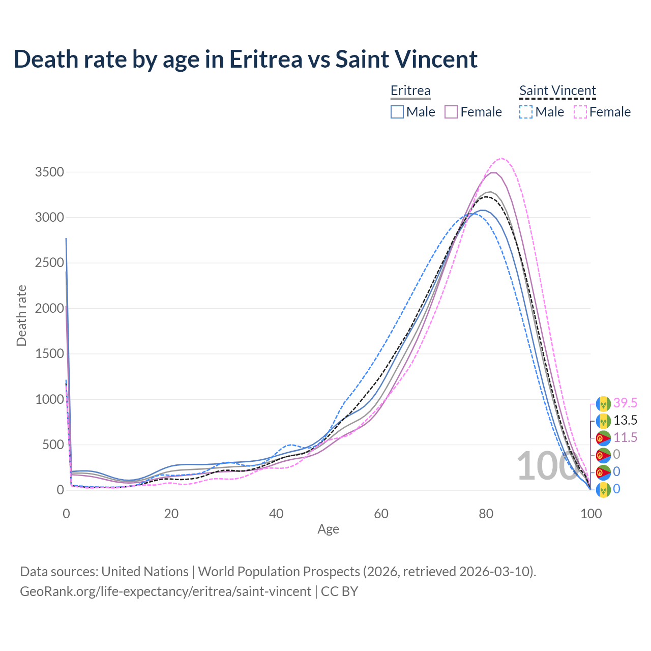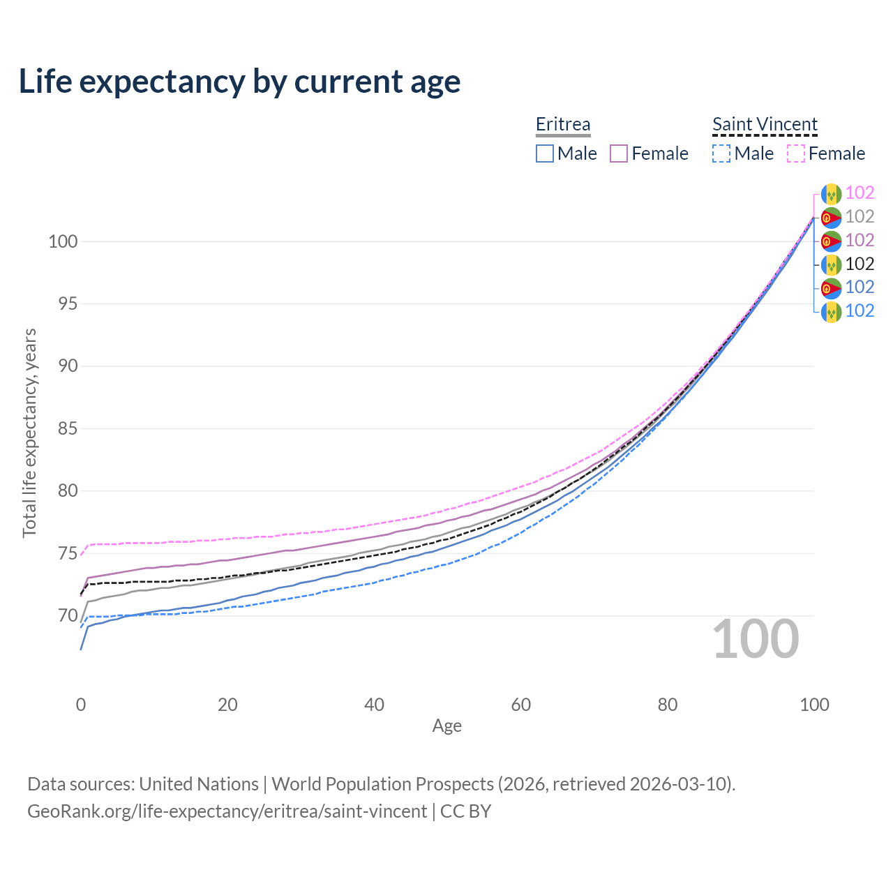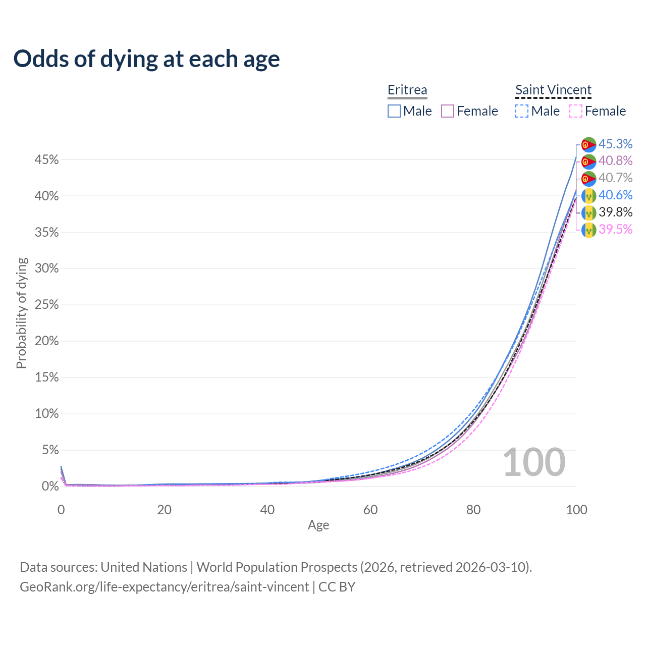 This life expectancy calculator shows the odds of living to 100, 95, 90, and below based on current age for both males and females in Eritrea and Saint Vincent, along with mean and median age of death. The calculations are based on the 2026 life tables (actuarial tables) from the UN World Population Prospects.