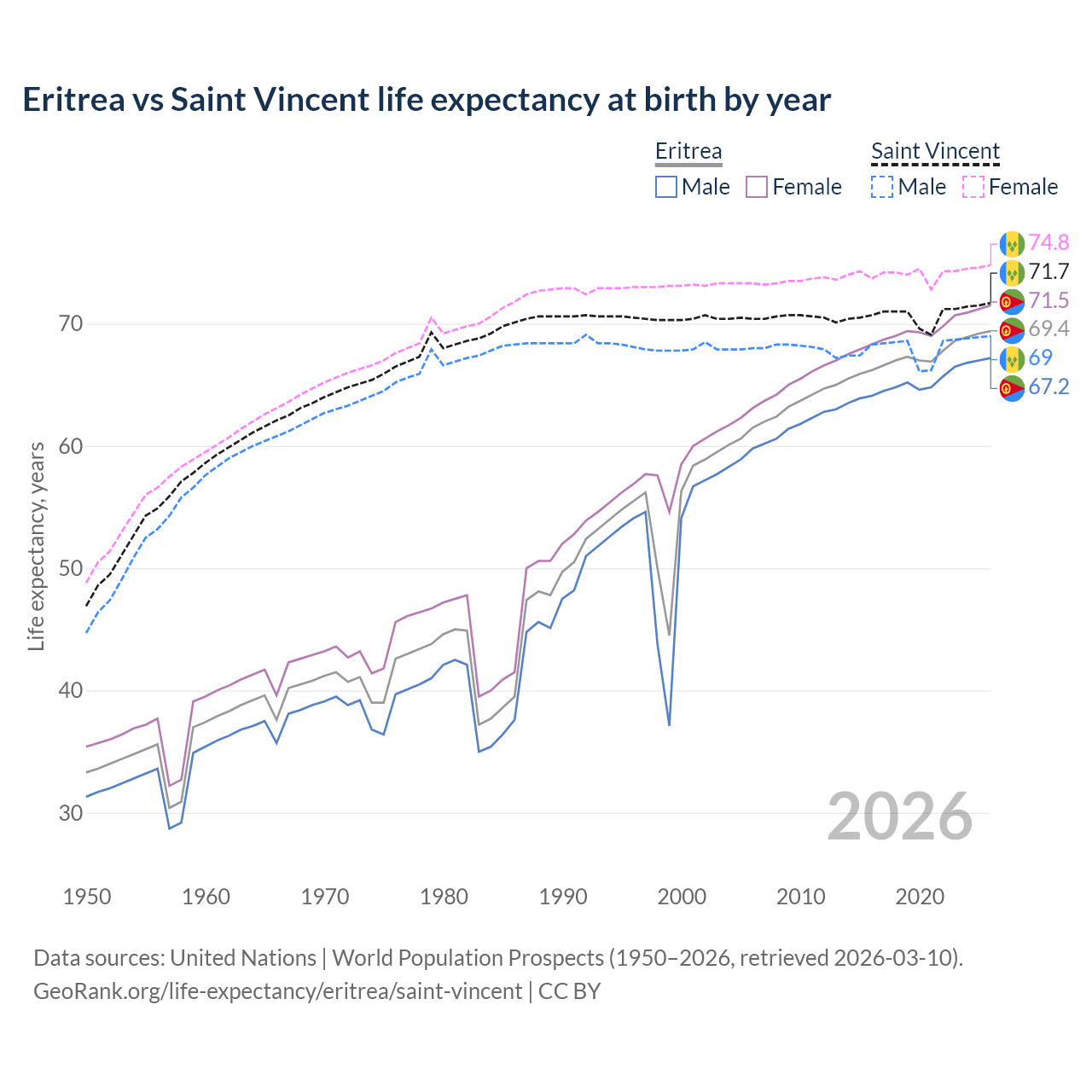 The average life expectancy at birth is 69.4 years in Eritrea vs 71.7 in Saint Vincent. Eritrea is ranked 142/197 by life expectancy, and Saint Vincent is 127/197. In Eritrea, the life expectancy is 67.2 years for males and 71.5 years for females. In Saint Vincent, it's 69 years for males and 74.8 years for females.