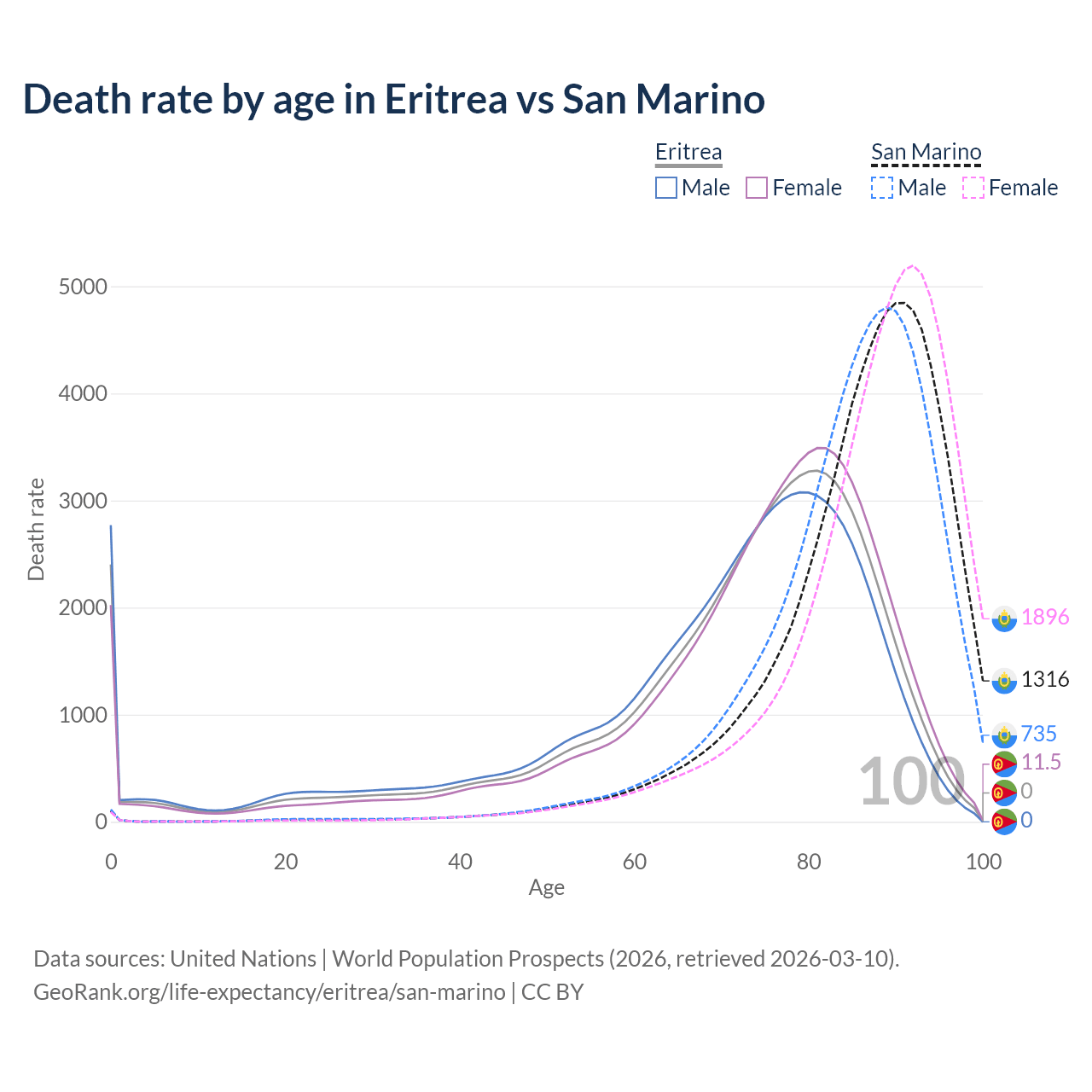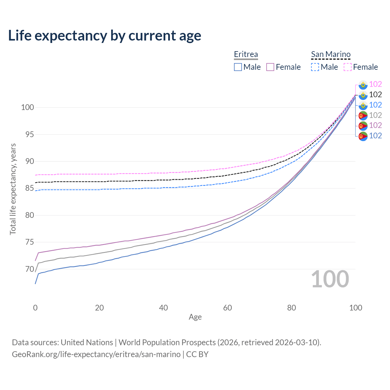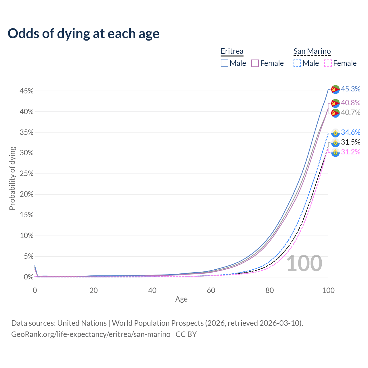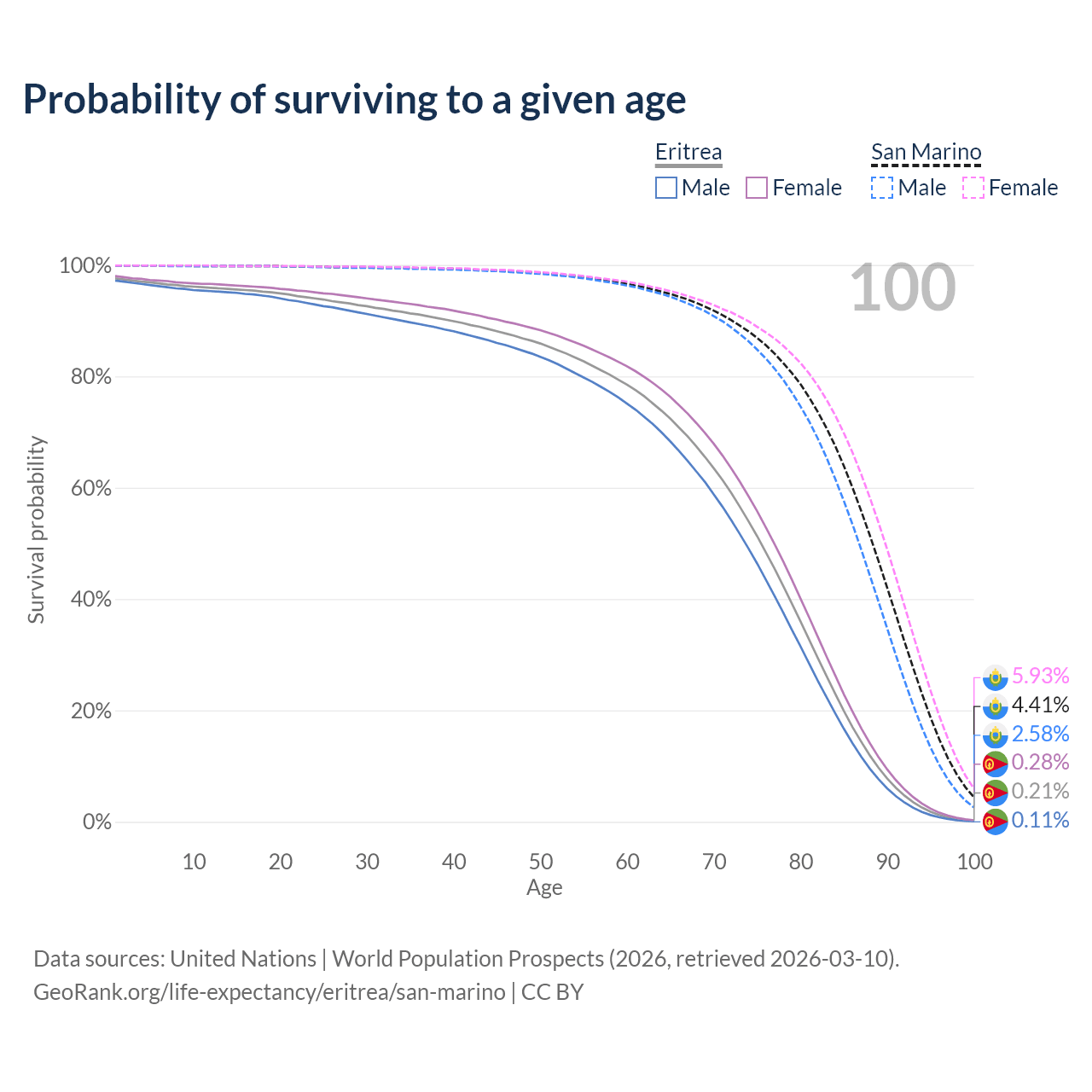 This life expectancy calculator shows the odds of living to 100, 95, 90, and below based on current age for both males and females in Eritrea and San Marino, along with mean and median age of death. The calculations are based on the 2026 life tables (actuarial tables) from the UN World Population Prospects.