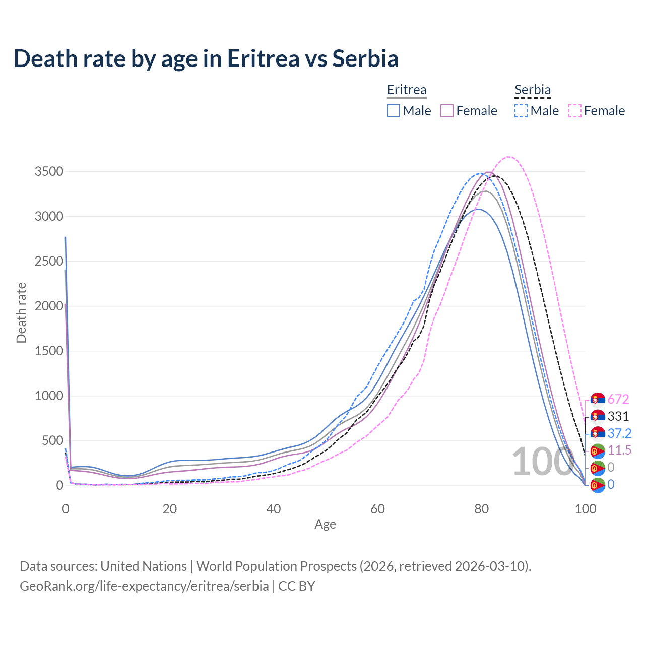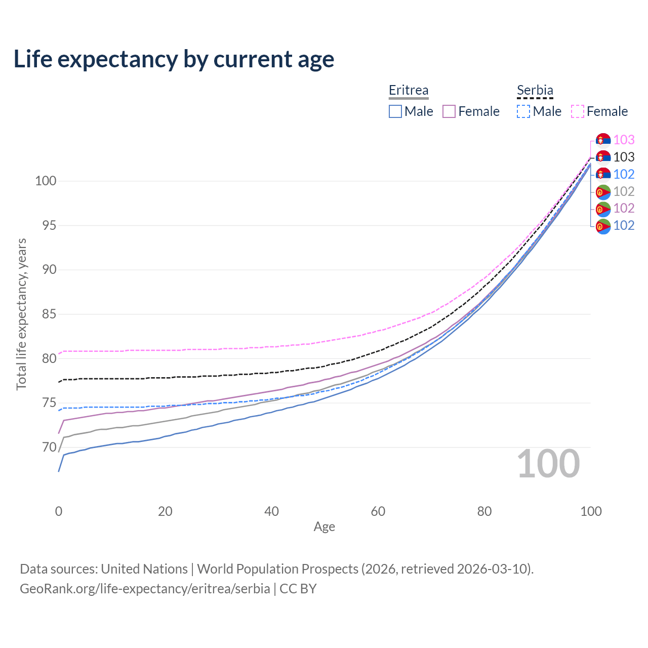 This life expectancy calculator shows the odds of living to 100, 95, 90, and below based on current age for both males and females in Eritrea and Serbia, along with mean and median age of death. The calculations are based on the 2026 life tables (actuarial tables) from the UN World Population Prospects.