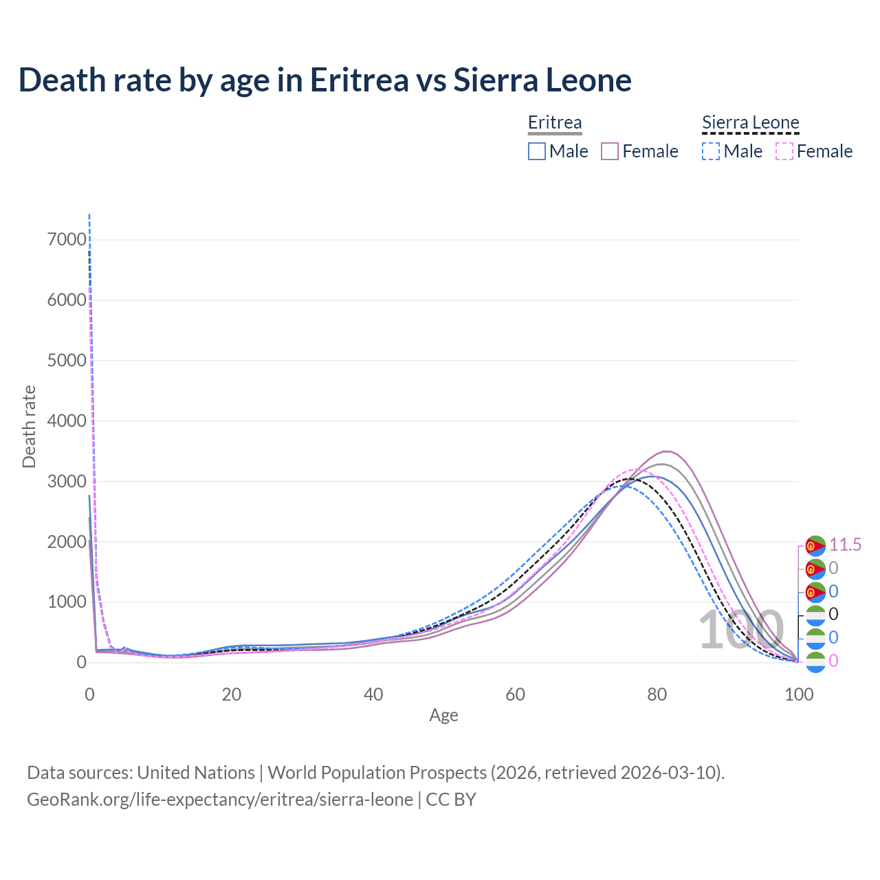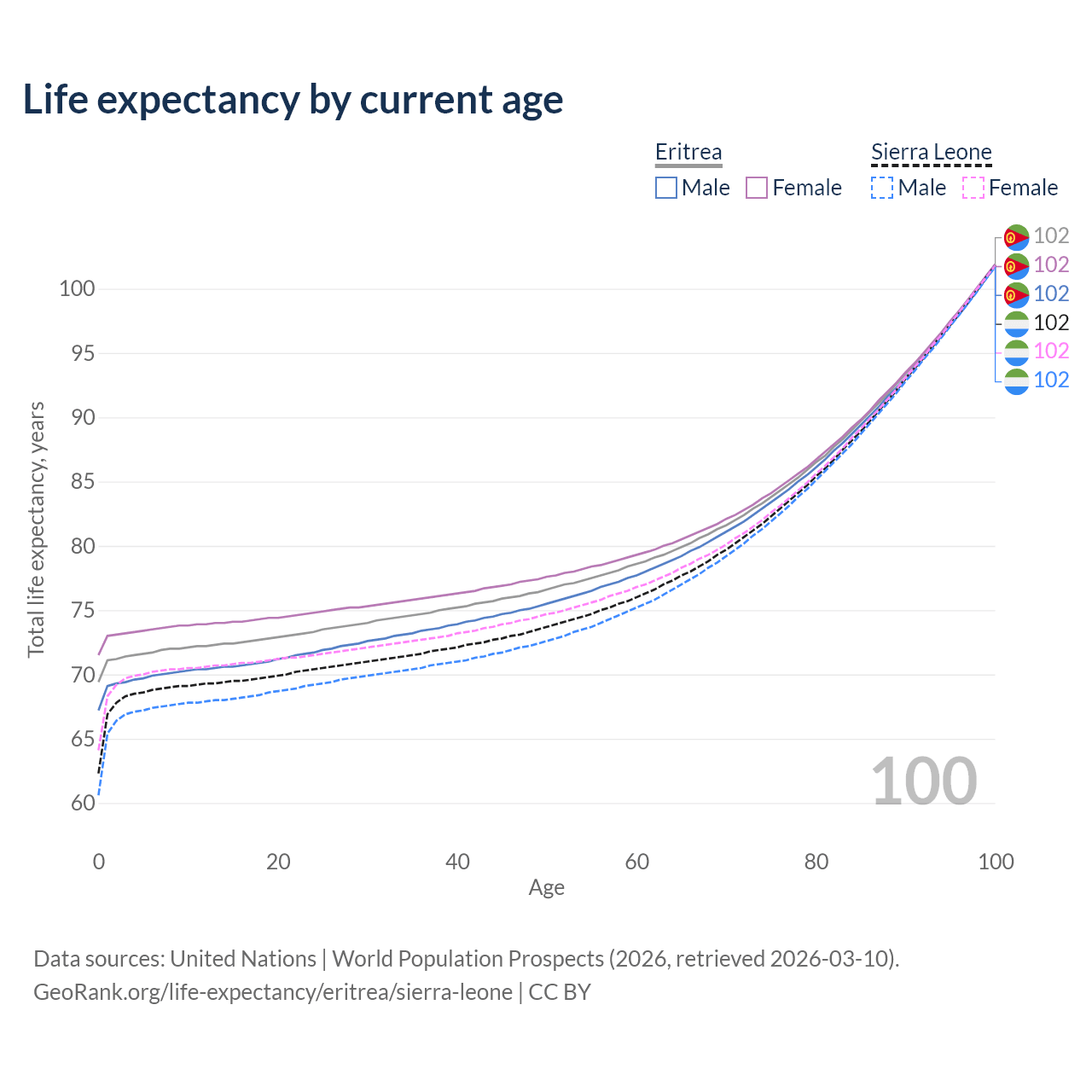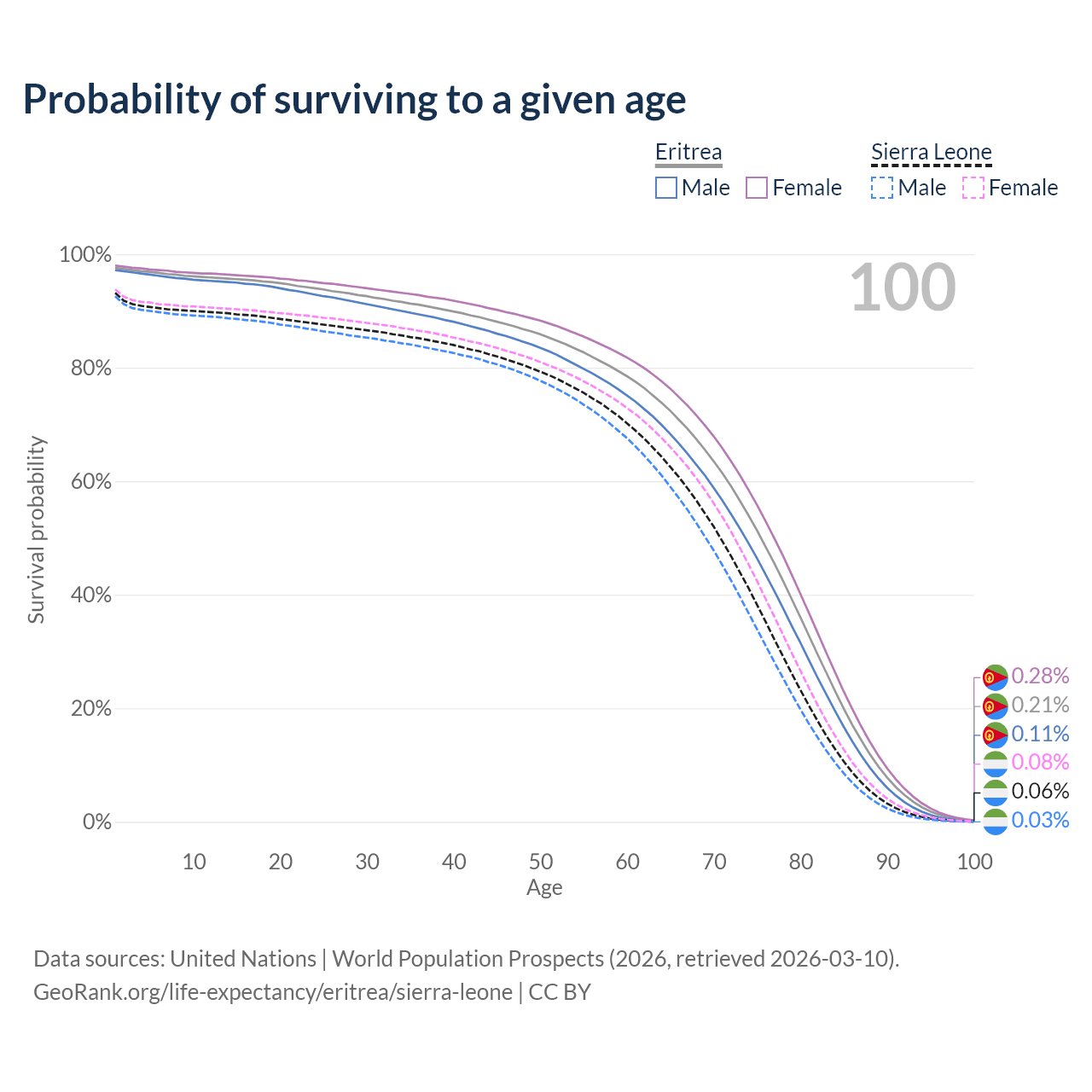 This life expectancy calculator shows the odds of living to 100, 95, 90, and below based on current age for both males and females in Eritrea and Sierra Leone, along with mean and median age of death. The calculations are based on the 2026 life tables (actuarial tables) from the UN World Population Prospects.