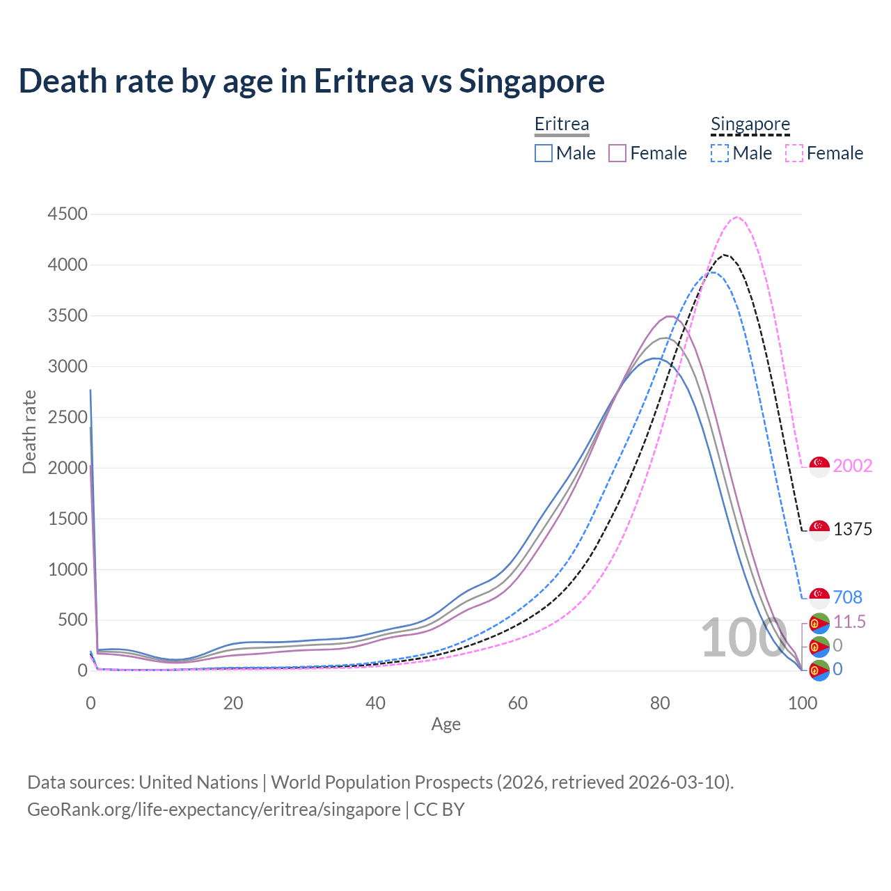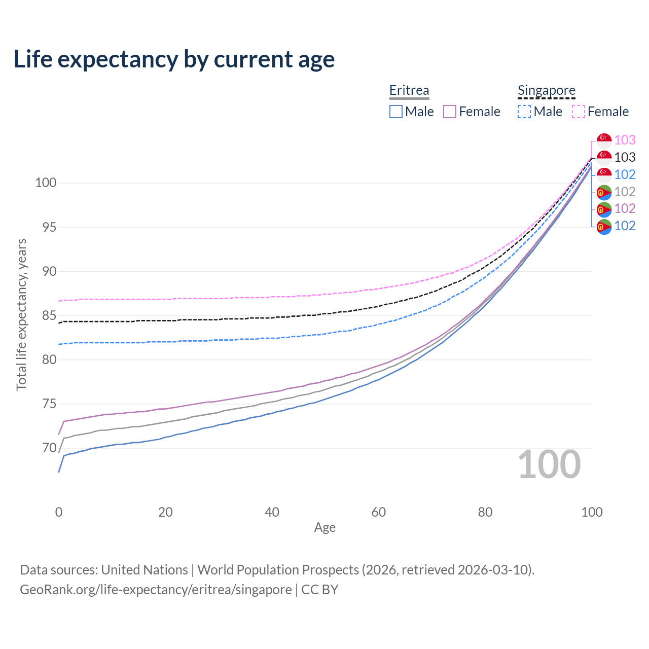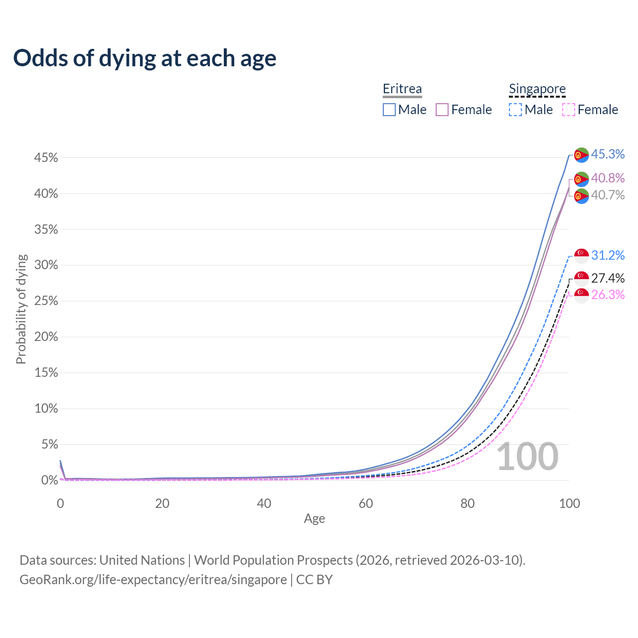 This life expectancy calculator shows the odds of living to 100, 95, 90, and below based on current age for both males and females in Eritrea and Singapore, along with mean and median age of death. The calculations are based on the 2026 life tables (actuarial tables) from the UN World Population Prospects.