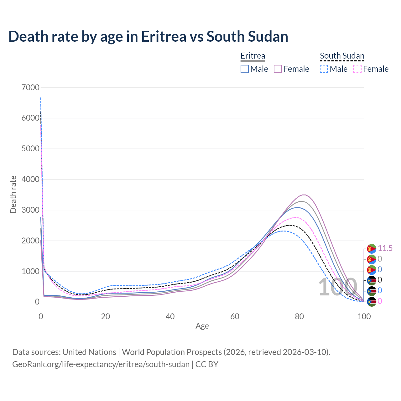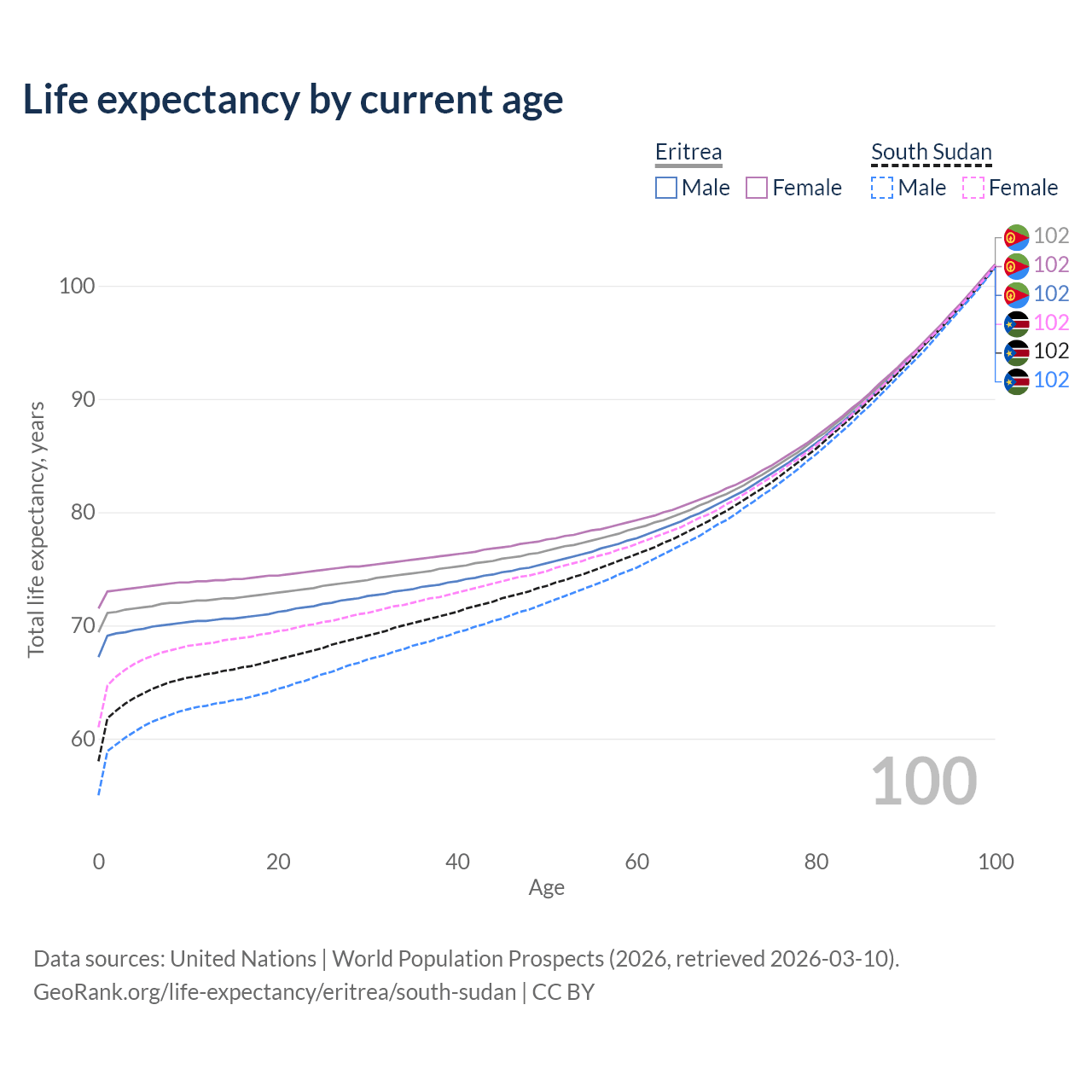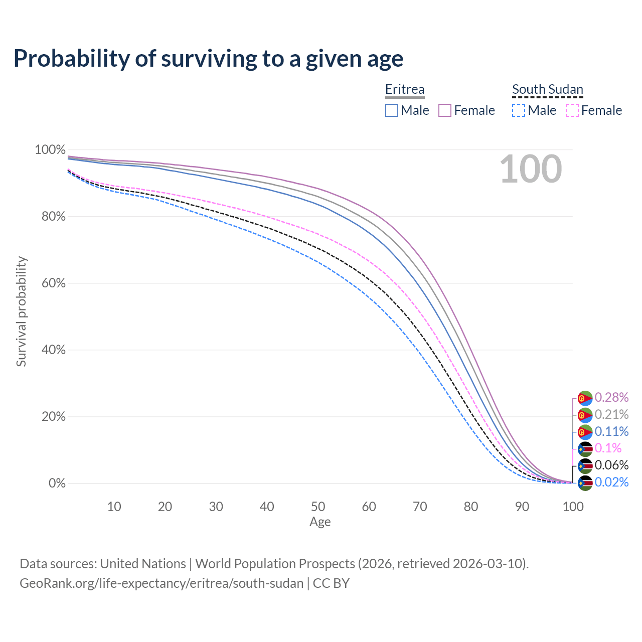 This life expectancy calculator shows the odds of living to 100, 95, 90, and below based on current age for both males and females in Eritrea and South Sudan, along with mean and median age of death. The calculations are based on the 2026 life tables (actuarial tables) from the UN World Population Prospects.