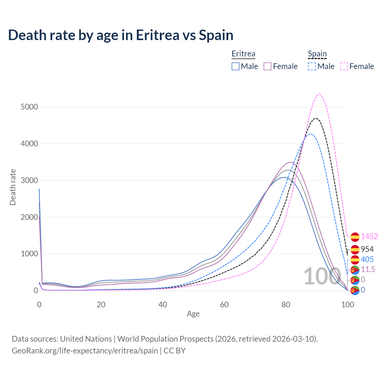 This life expectancy calculator shows the odds of living to 100, 95, 90, and below based on current age for both males and females in Eritrea and Spain, along with mean and median age of death. The calculations are based on the 2026 life tables (actuarial tables) from the UN World Population Prospects.