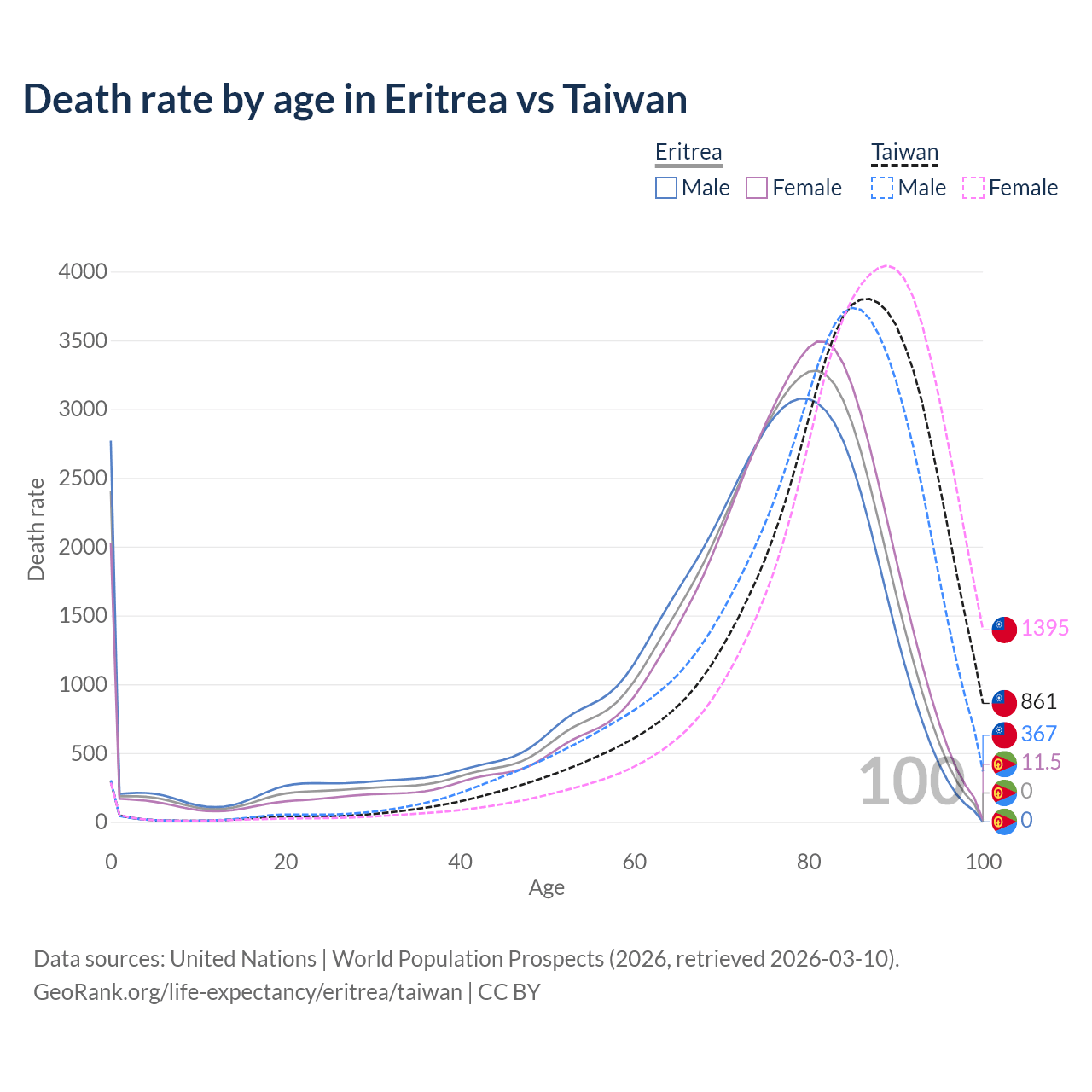 This life expectancy calculator shows the odds of living to 100, 95, 90, and below based on current age for both males and females in Eritrea and Taiwan, along with mean and median age of death. The calculations are based on the 2026 life tables (actuarial tables) from the UN World Population Prospects.