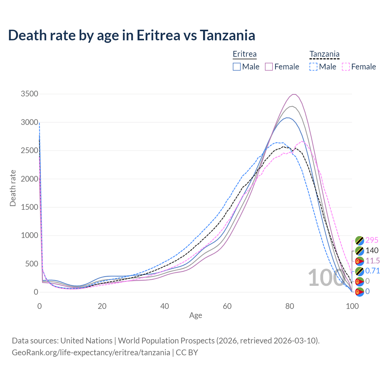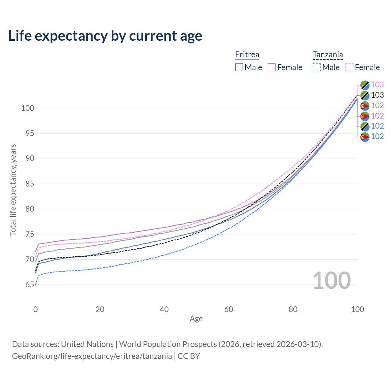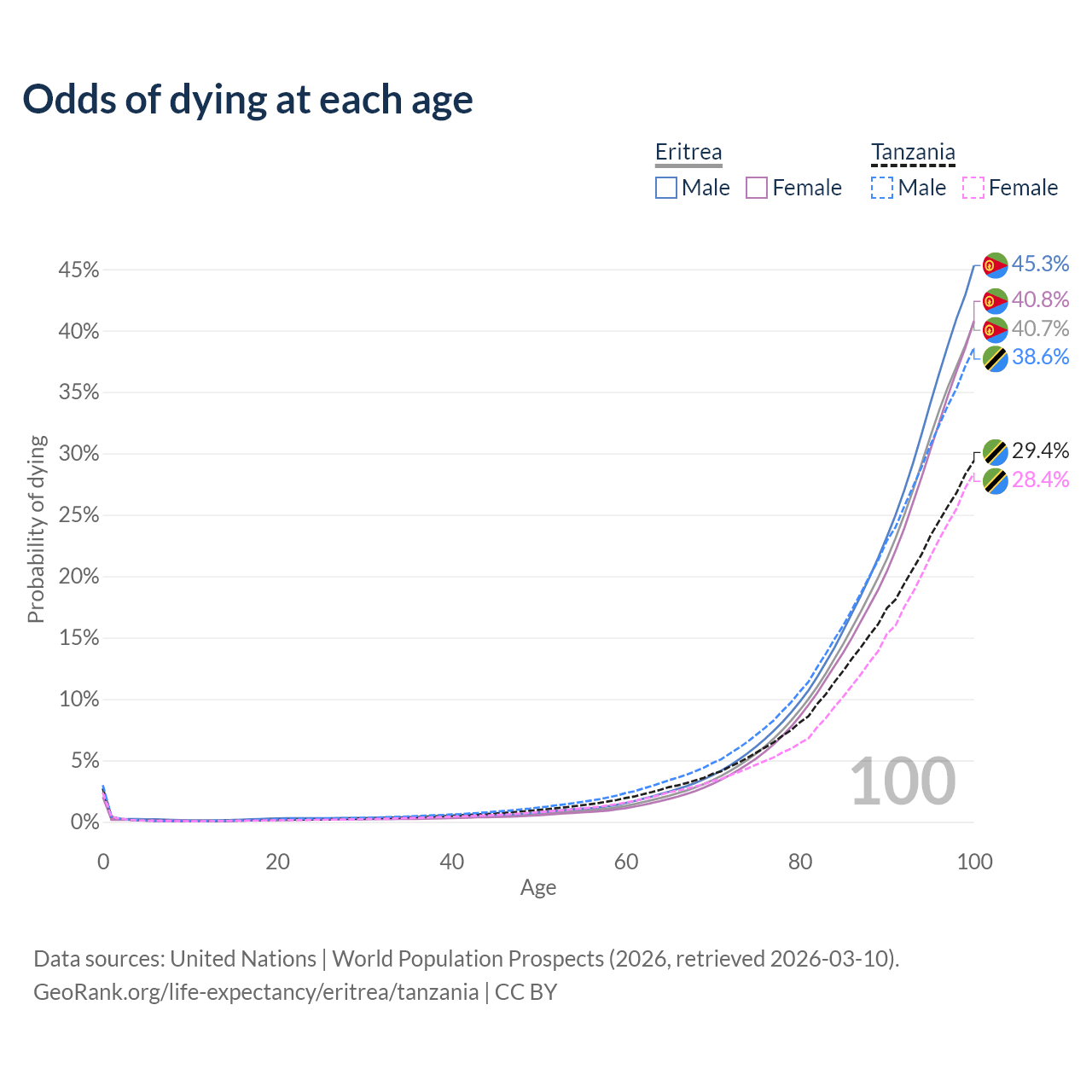 This life expectancy calculator shows the odds of living to 100, 95, 90, and below based on current age for both males and females in Eritrea and Tanzania, along with mean and median age of death. The calculations are based on the 2026 life tables (actuarial tables) from the UN World Population Prospects.