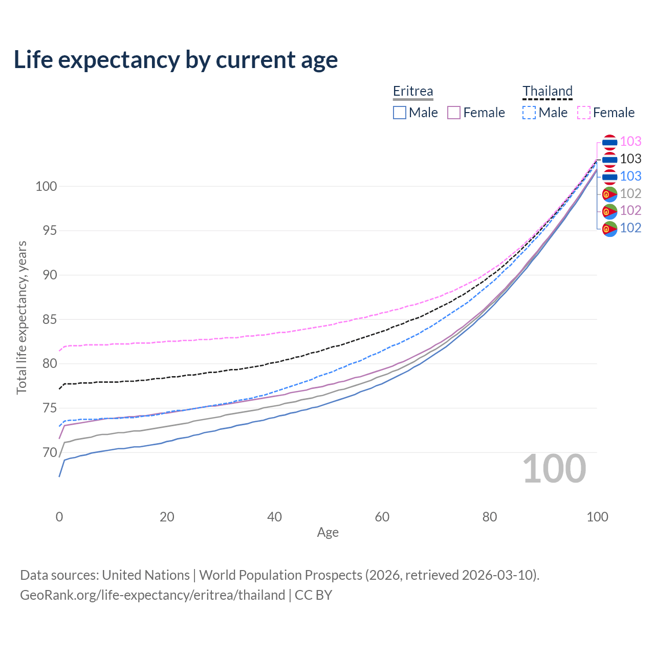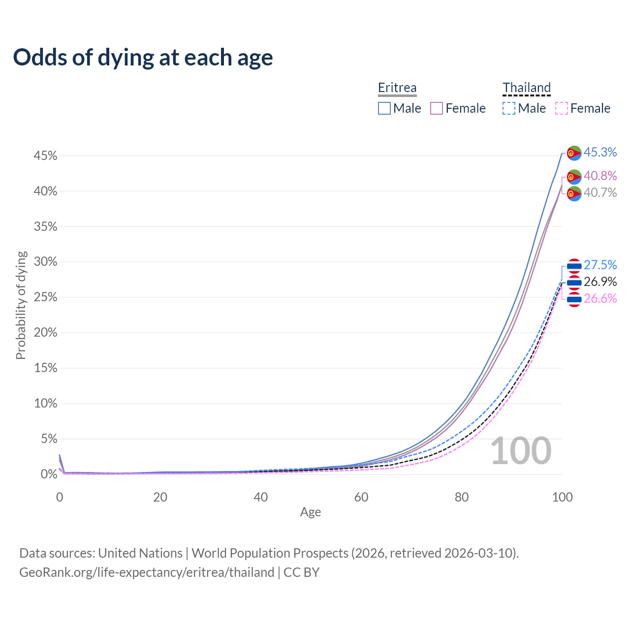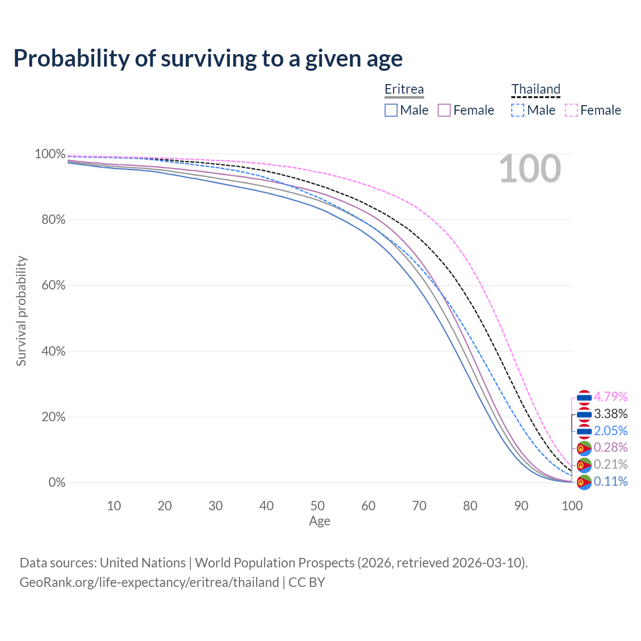 This life expectancy calculator shows the odds of living to 100, 95, 90, and below based on current age for both males and females in Eritrea and Thailand, along with mean and median age of death. The calculations are based on the 2026 life tables (actuarial tables) from the UN World Population Prospects.