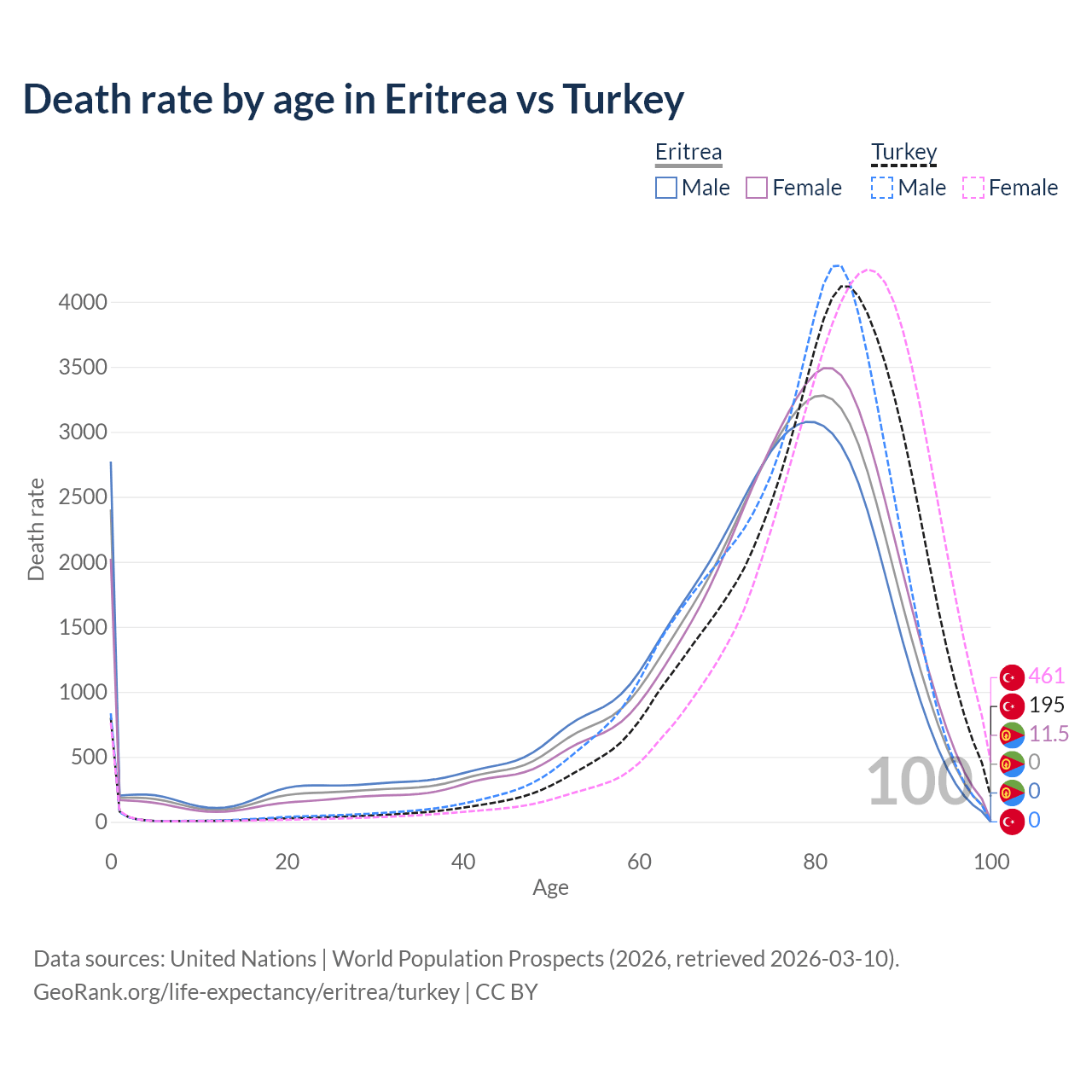 This life expectancy calculator shows the odds of living to 100, 95, 90, and below based on current age for both males and females in Eritrea and Turkey, along with mean and median age of death. The calculations are based on the 2026 life tables (actuarial tables) from the UN World Population Prospects.