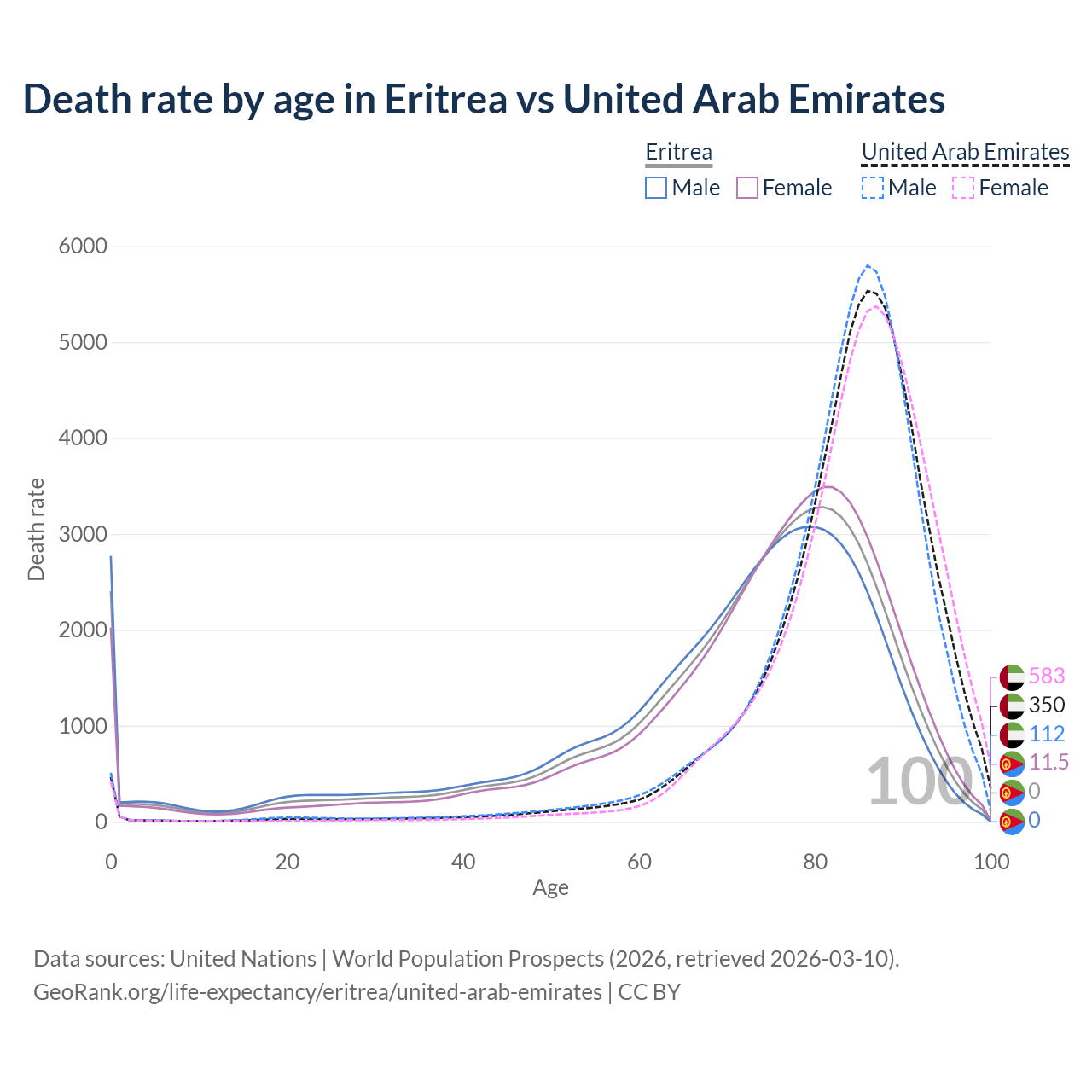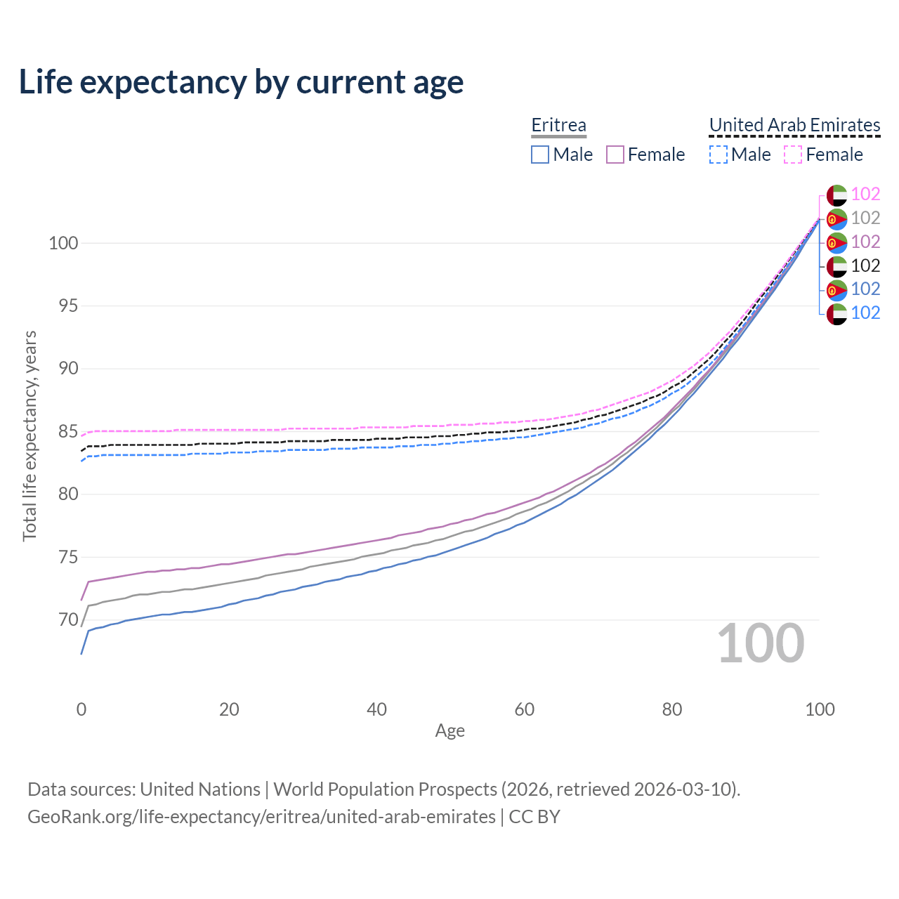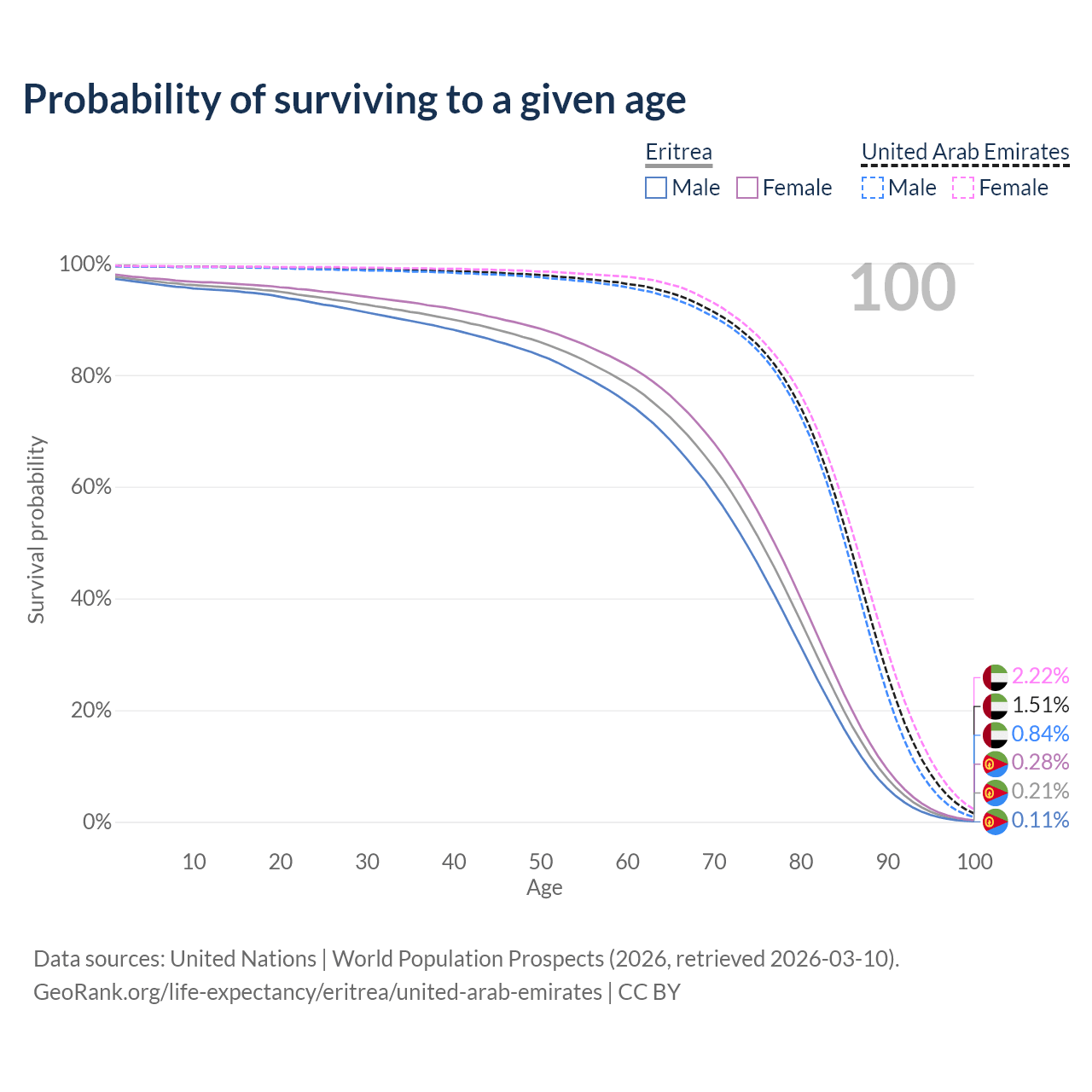 This life expectancy calculator shows the odds of living to 100, 95, 90, and below based on current age for both males and females in Eritrea and the United Arab Emirates, along with mean and median age of death. The calculations are based on the 2026 life tables (actuarial tables) from the UN World Population Prospects.