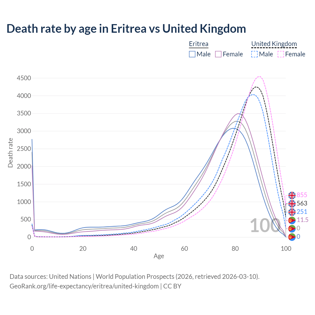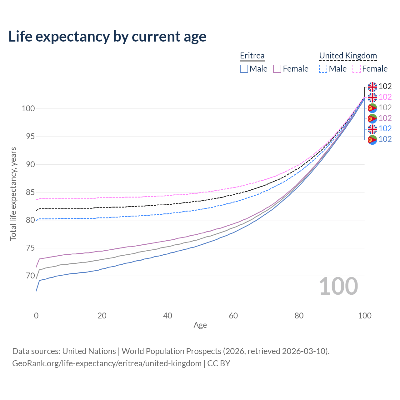 This life expectancy calculator shows the odds of living to 100, 95, 90, and below based on current age for both males and females in Eritrea and the United Kingdom, along with mean and median age of death. The calculations are based on the 2026 life tables (actuarial tables) from the UN World Population Prospects.
