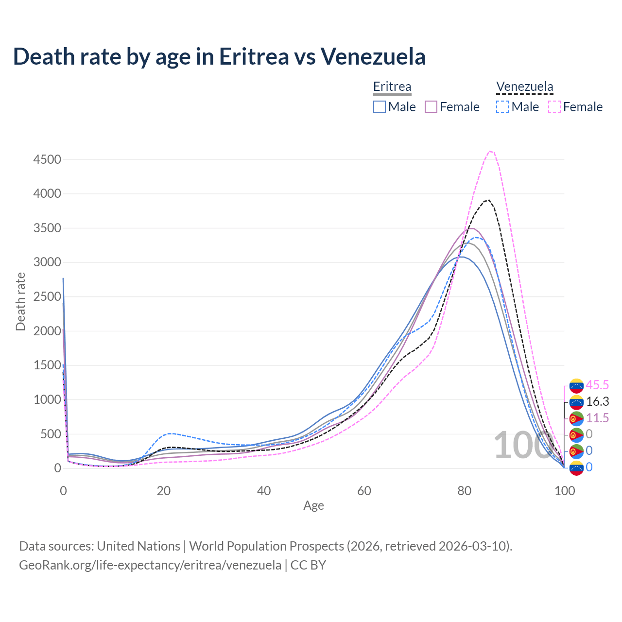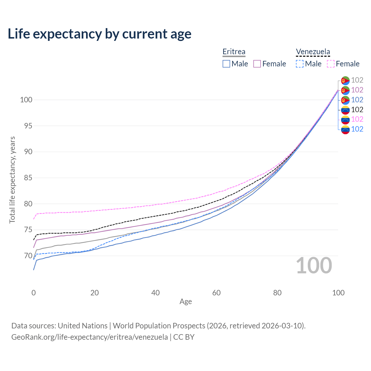 This life expectancy calculator shows the odds of living to 100, 95, 90, and below based on current age for both males and females in Eritrea and Venezuela, along with mean and median age of death. The calculations are based on the 2026 life tables (actuarial tables) from the UN World Population Prospects.