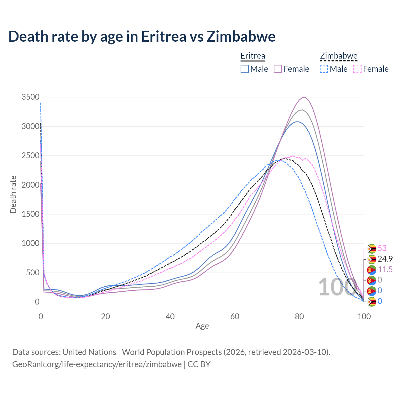This life expectancy calculator shows the odds of living to 100, 95, 90, and below based on current age for both males and females in Eritrea and Zimbabwe, along with mean and median age of death. The calculations are based on the 2026 life tables (actuarial tables) from the UN World Population Prospects.