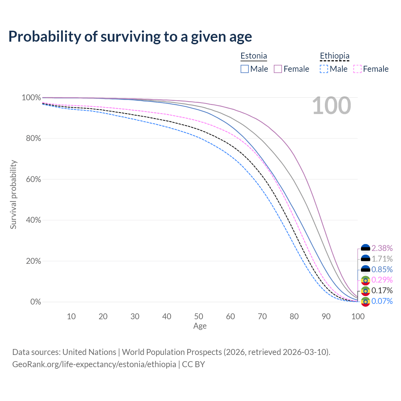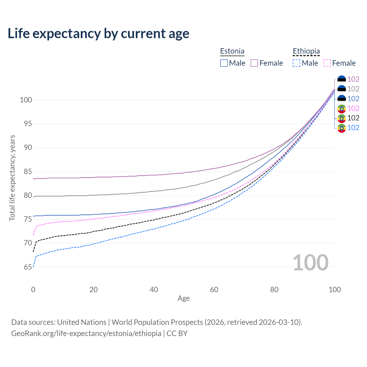 This life expectancy calculator shows the odds of living to 100, 95, 90, and below based on current age for both males and females in Estonia and Ethiopia, along with mean and median age of death. The calculations are based on the 2026 life tables (actuarial tables) from the UN World Population Prospects.