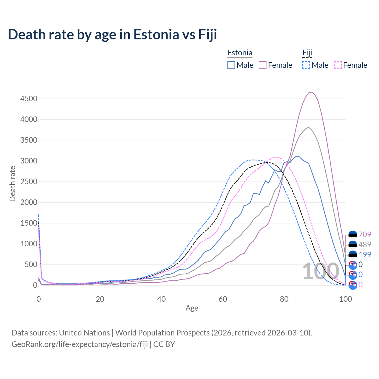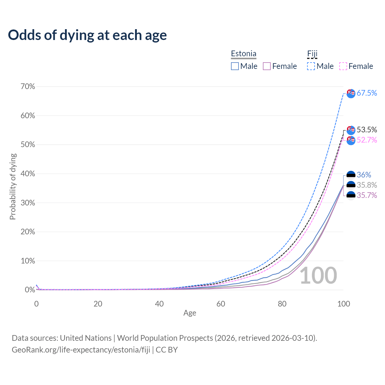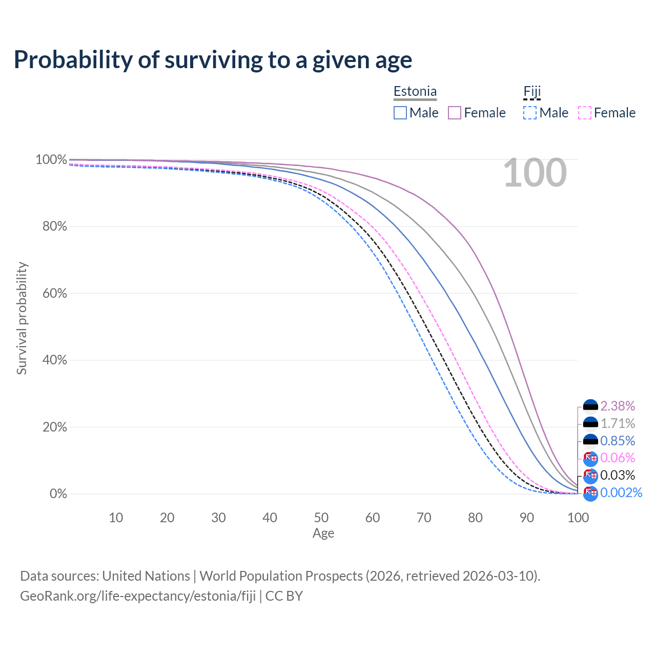 This life expectancy calculator shows the odds of living to 100, 95, 90, and below based on current age for both males and females in Estonia and Fiji, along with mean and median age of death. The calculations are based on the 2026 life tables (actuarial tables) from the UN World Population Prospects.