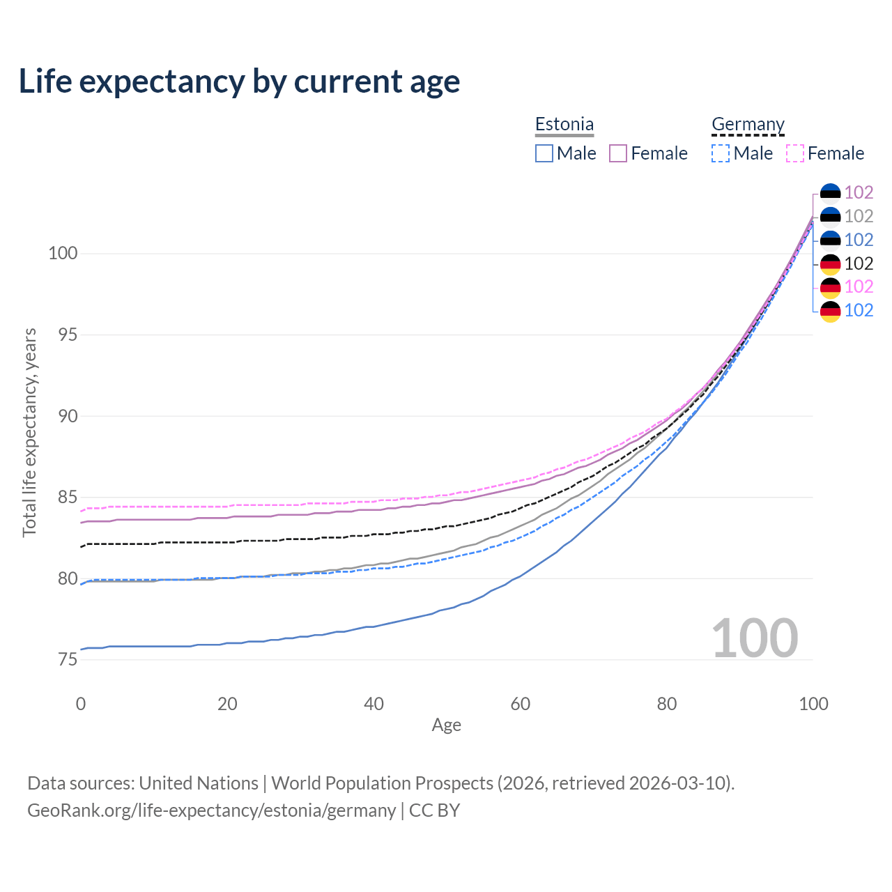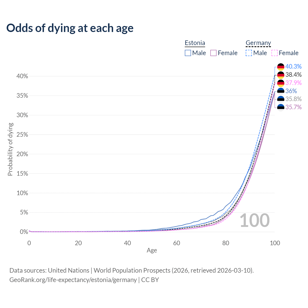 This life expectancy calculator shows the odds of living to 100, 95, 90, and below based on current age for both males and females in Estonia and Germany, along with mean and median age of death. The calculations are based on the 2026 life tables (actuarial tables) from the UN World Population Prospects.