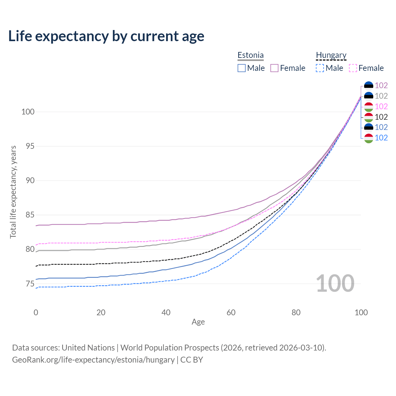 This life expectancy calculator shows the odds of living to 100, 95, 90, and below based on current age for both males and females in Estonia and Hungary, along with mean and median age of death. The calculations are based on the 2026 life tables (actuarial tables) from the UN World Population Prospects.