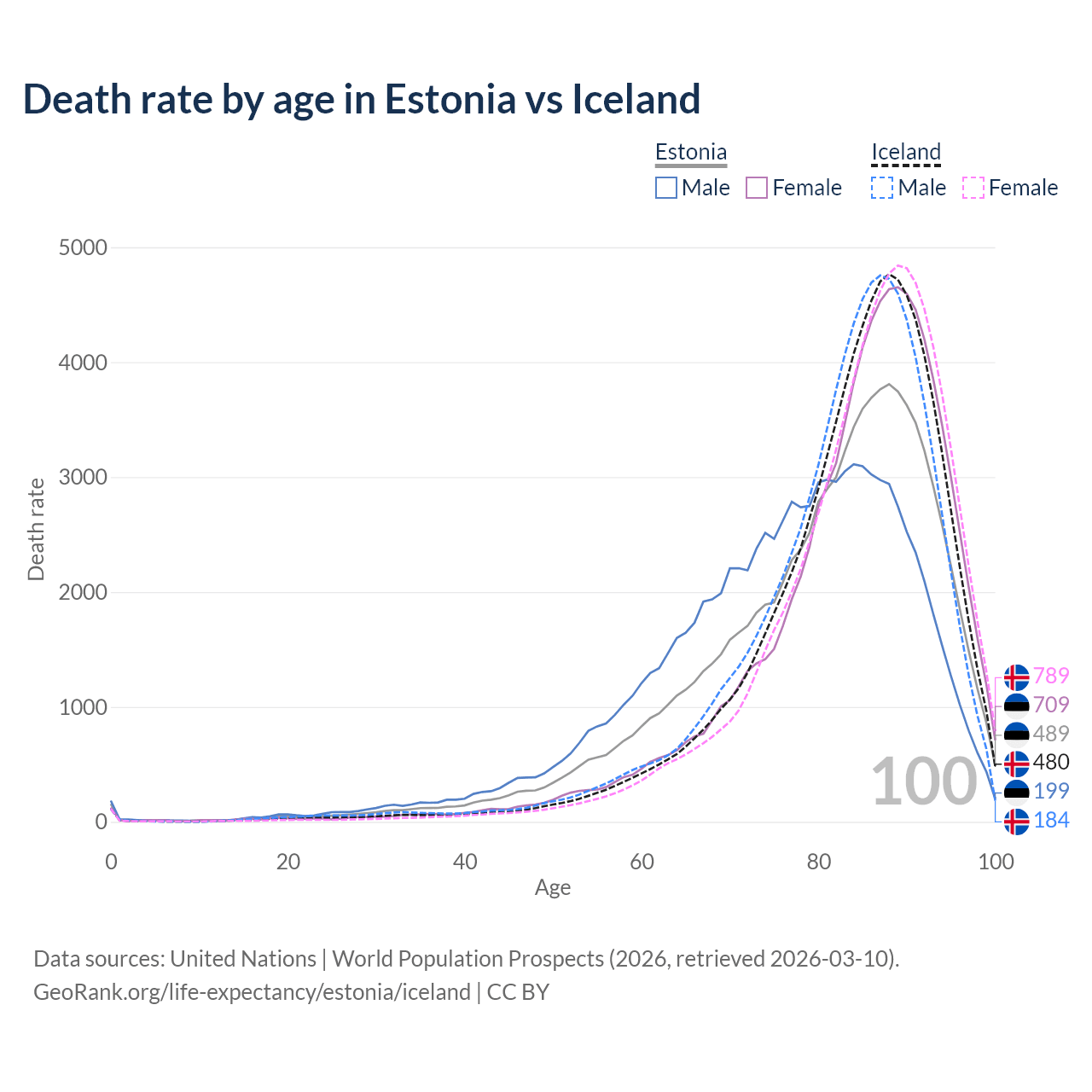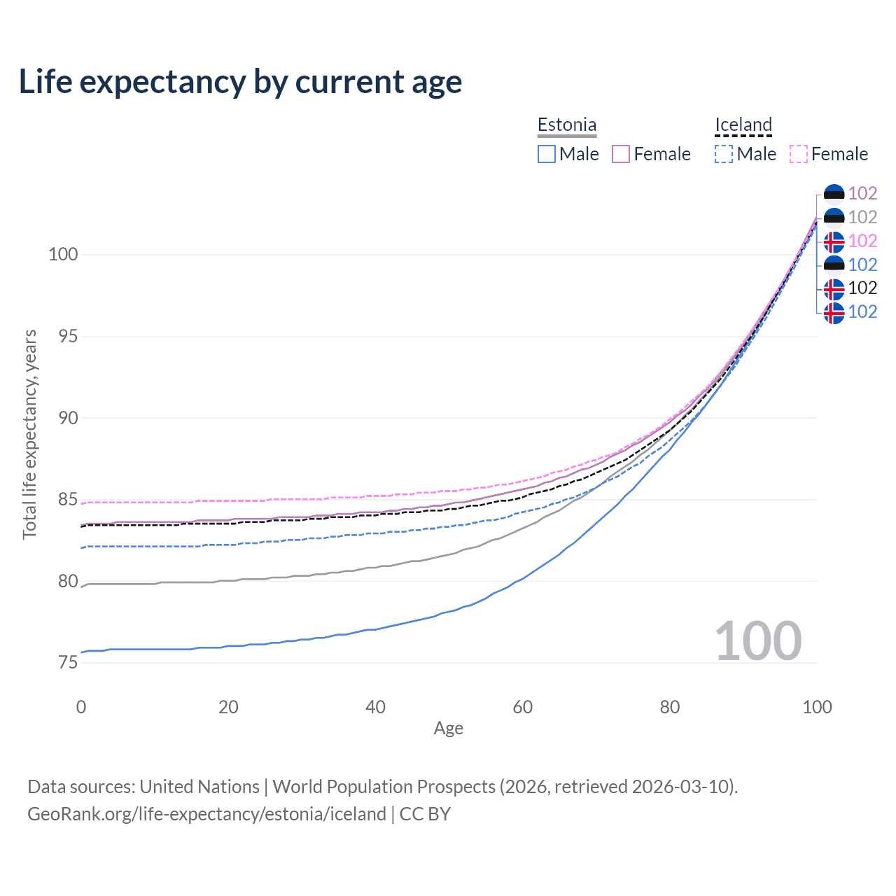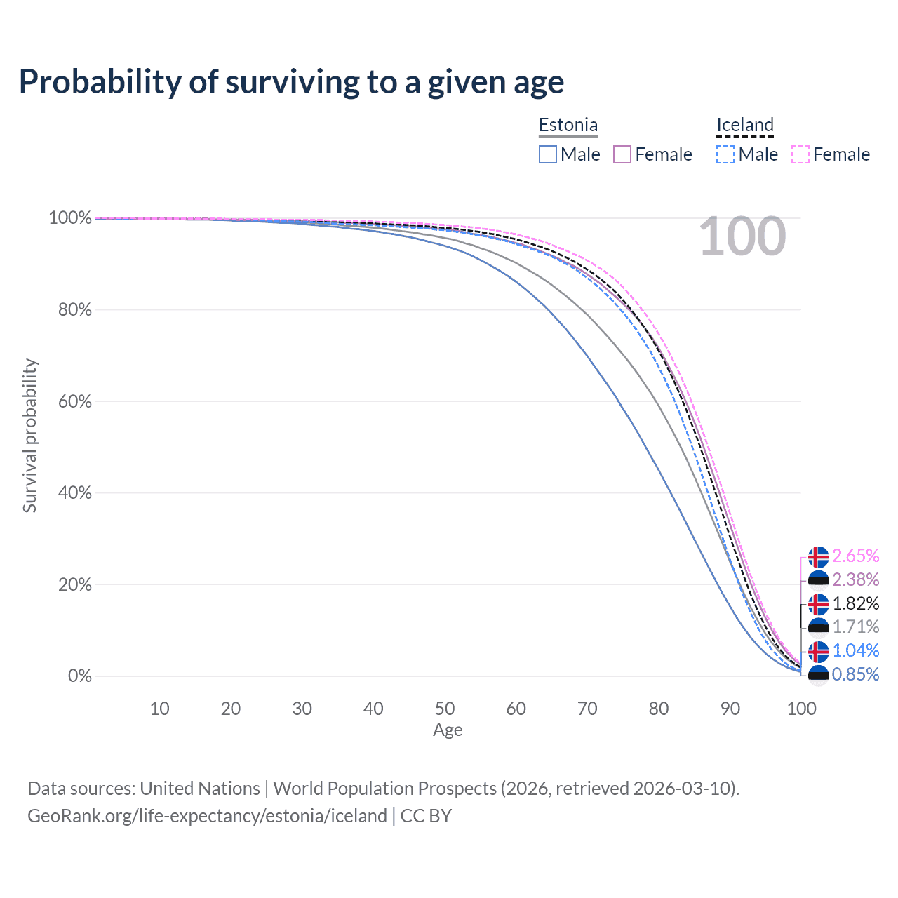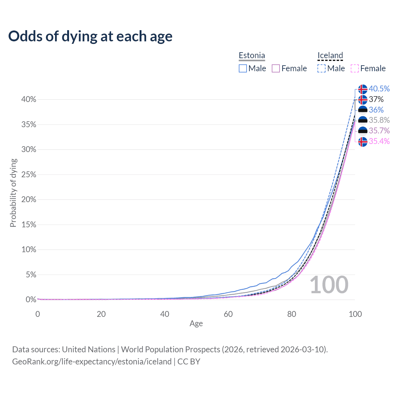 This life expectancy calculator shows the odds of living to 100, 95, 90, and below based on current age for both males and females in Estonia and Iceland, along with mean and median age of death. The calculations are based on the 2026 life tables (actuarial tables) from the UN World Population Prospects.