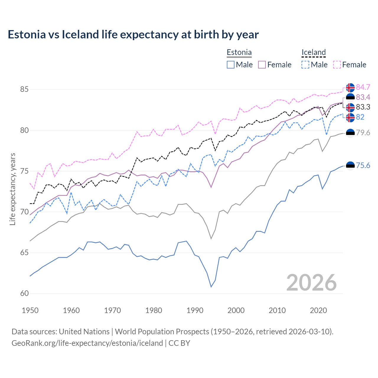 The average life expectancy at birth is 79.6 years in Estonia vs 83.3 in Iceland. Estonia is ranked 48/197 by life expectancy, and Iceland is 18/197. In Estonia, the life expectancy is 75.6 years for males and 83.4 years for females. In Iceland, it's 82 years for males and 84.7 years for females.