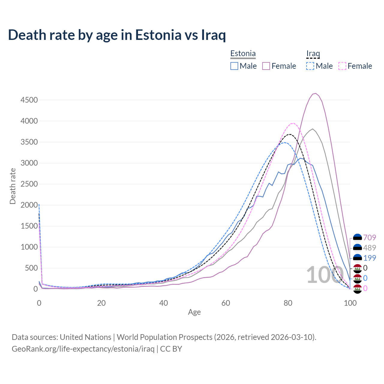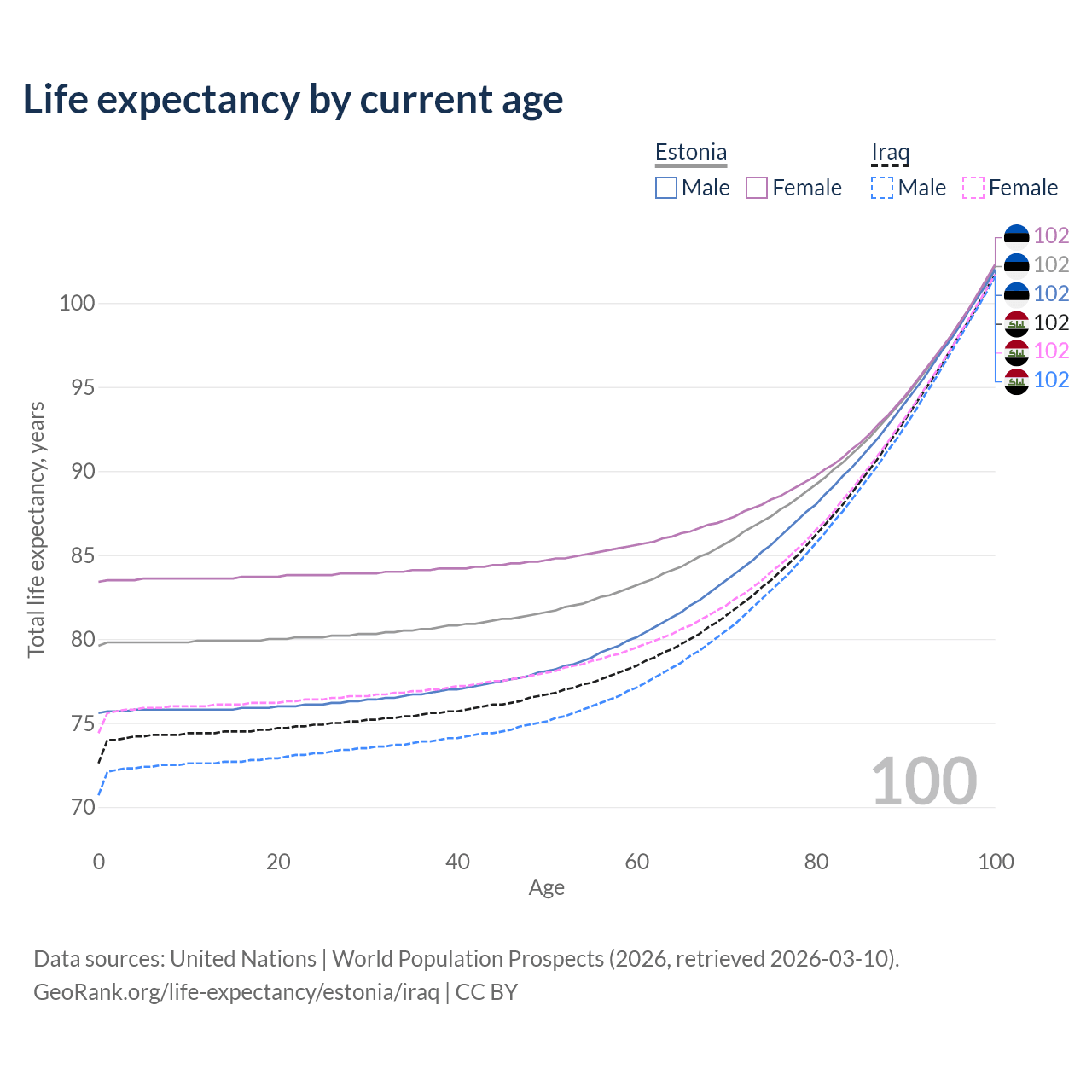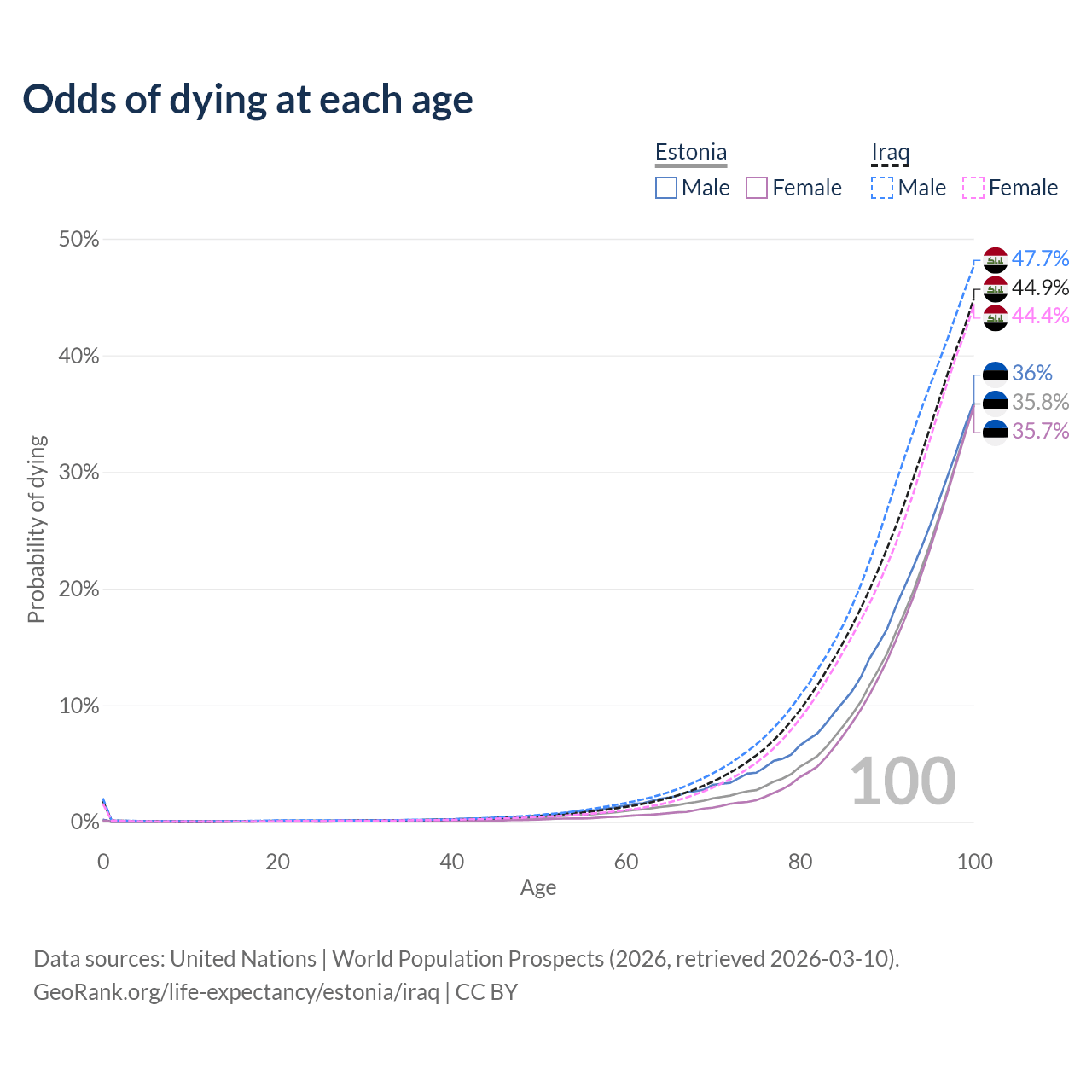 This life expectancy calculator shows the odds of living to 100, 95, 90, and below based on current age for both males and females in Estonia and Iraq, along with mean and median age of death. The calculations are based on the 2026 life tables (actuarial tables) from the UN World Population Prospects.