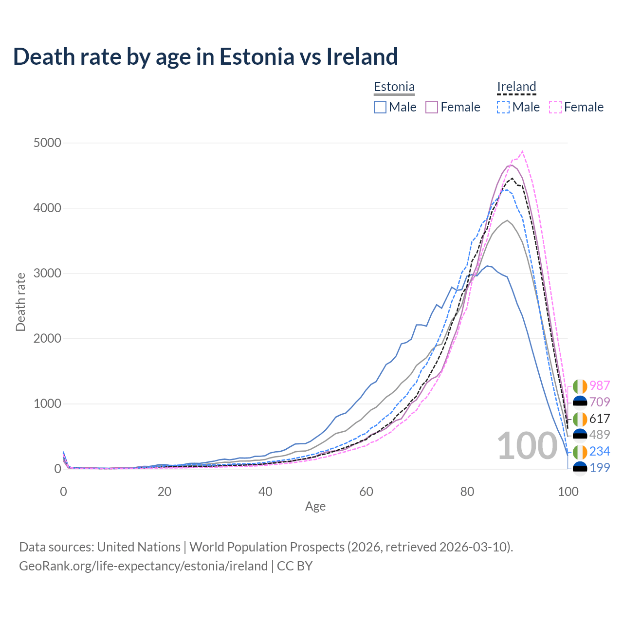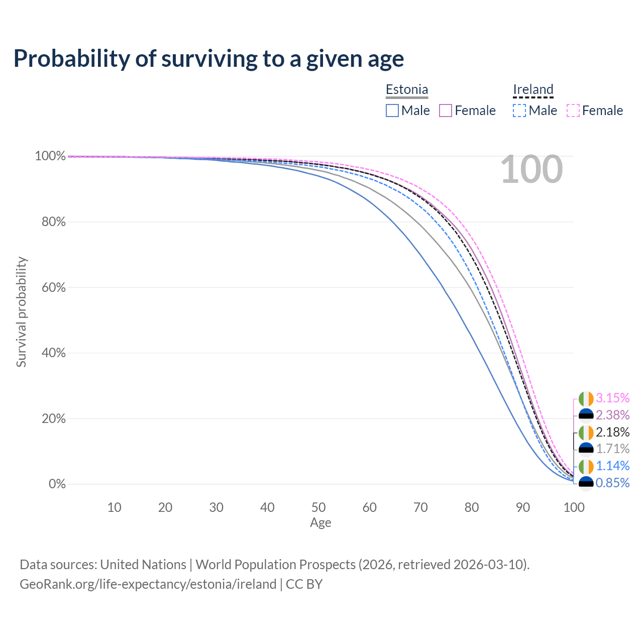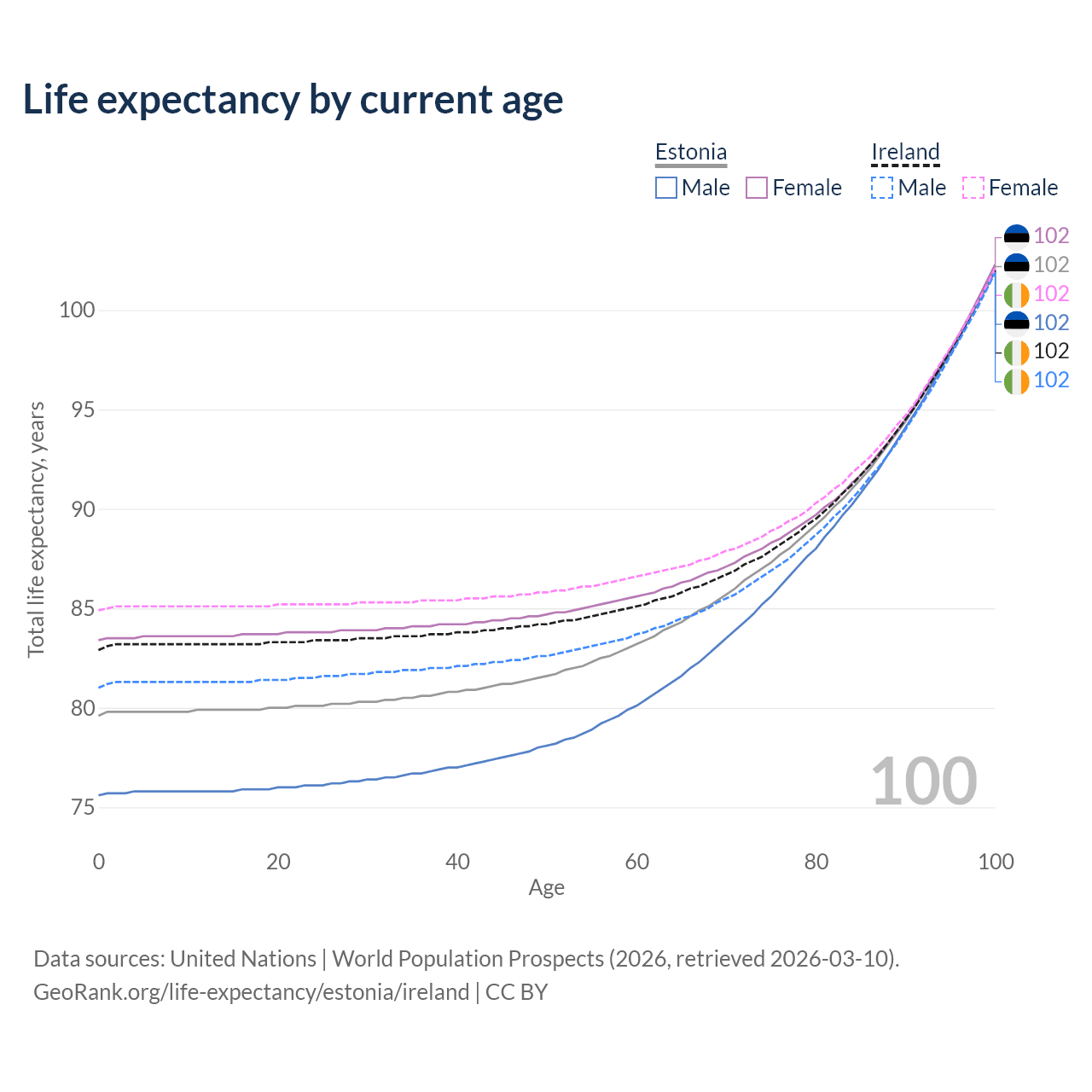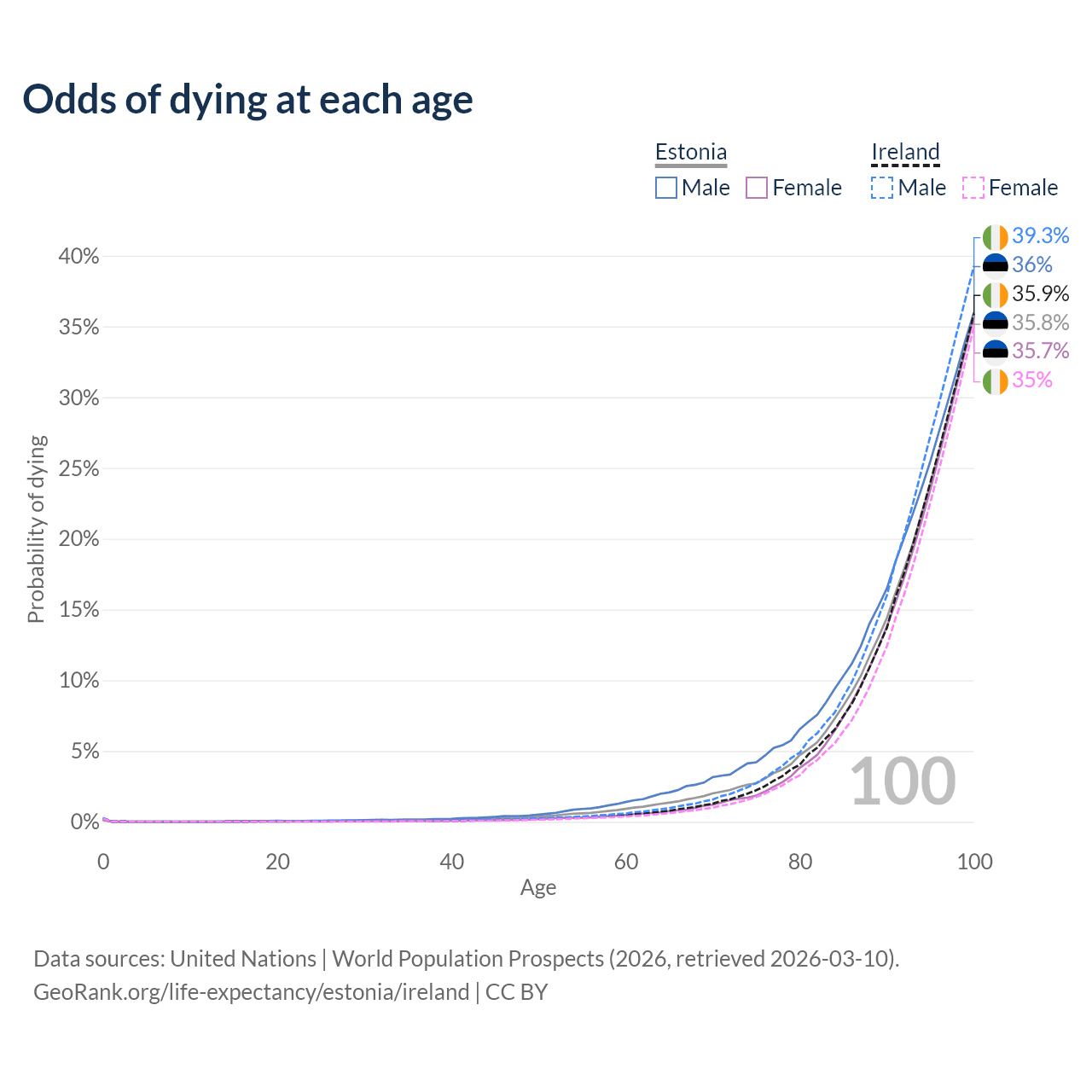This life expectancy calculator shows the odds of living to 100, 95, 90, and below based on current age for both males and females in Estonia and Ireland, along with mean and median age of death. The calculations are based on the 2026 life tables (actuarial tables) from the UN World Population Prospects.