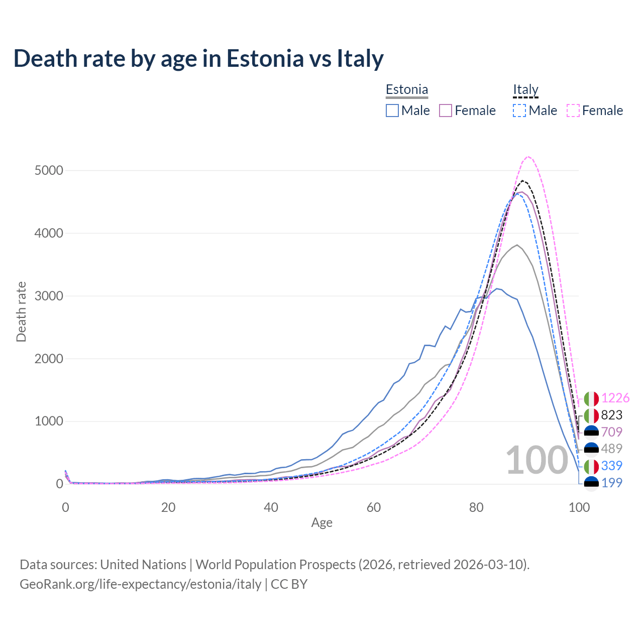 In Estonia, the most common age of death is 88, compared to 89 in Italy. The median age of death is 83.1 in Estonia and 86.9 in Italy, meaning only half of each cohort is expected to live past that age.