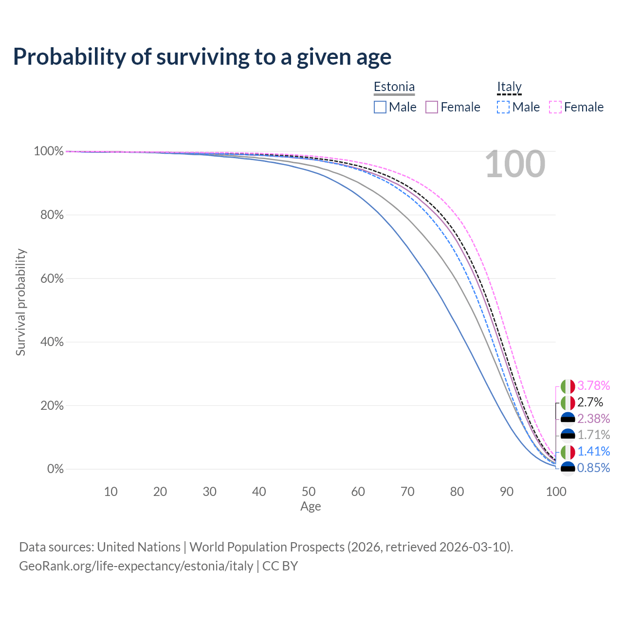 This life expectancy calculator shows the odds of living to 100, 95, 90, and below based on current age for both males and females in Estonia and Italy, along with mean and median age of death. The calculations are based on the 2026 life tables (actuarial tables) from the UN World Population Prospects.