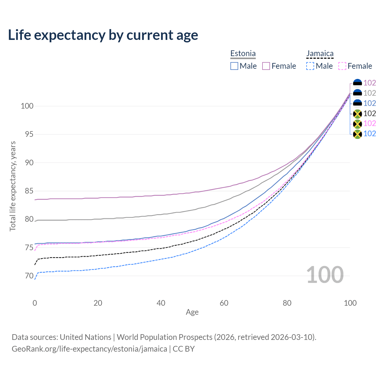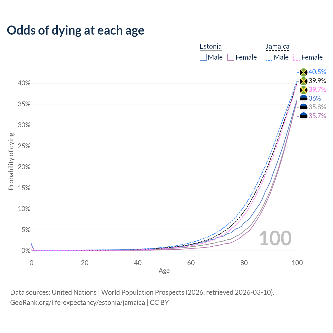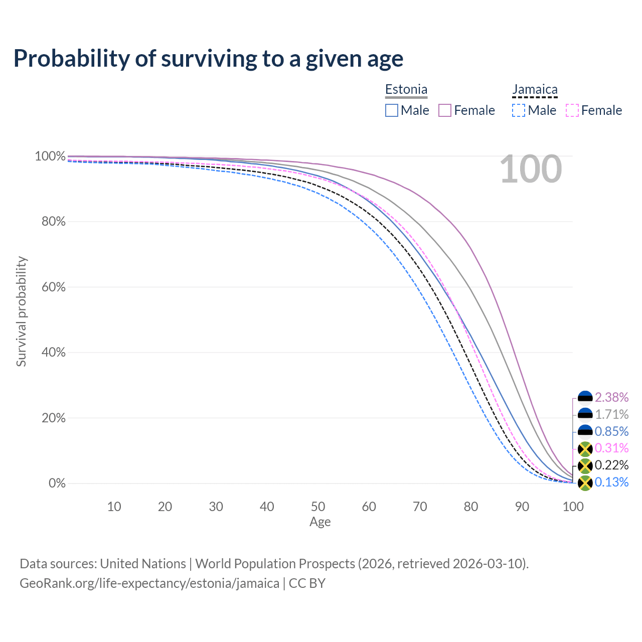 This life expectancy calculator shows the odds of living to 100, 95, 90, and below based on current age for both males and females in Estonia and Jamaica, along with mean and median age of death. The calculations are based on the 2026 life tables (actuarial tables) from the UN World Population Prospects.