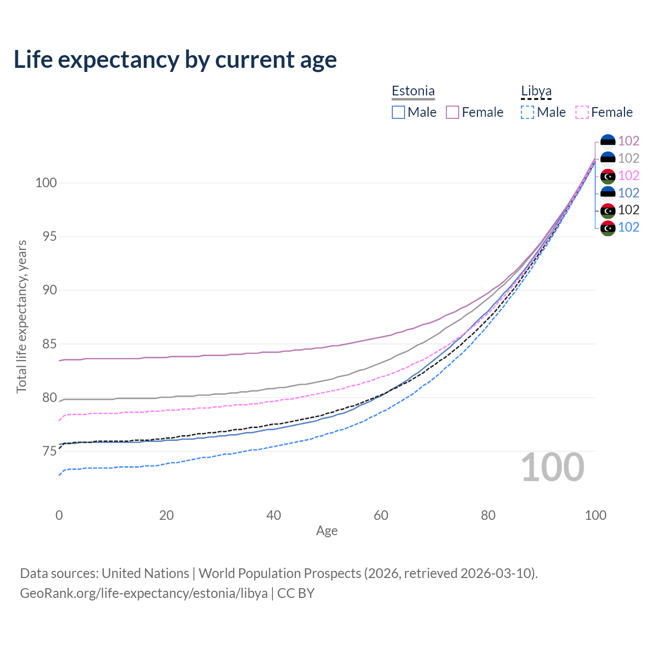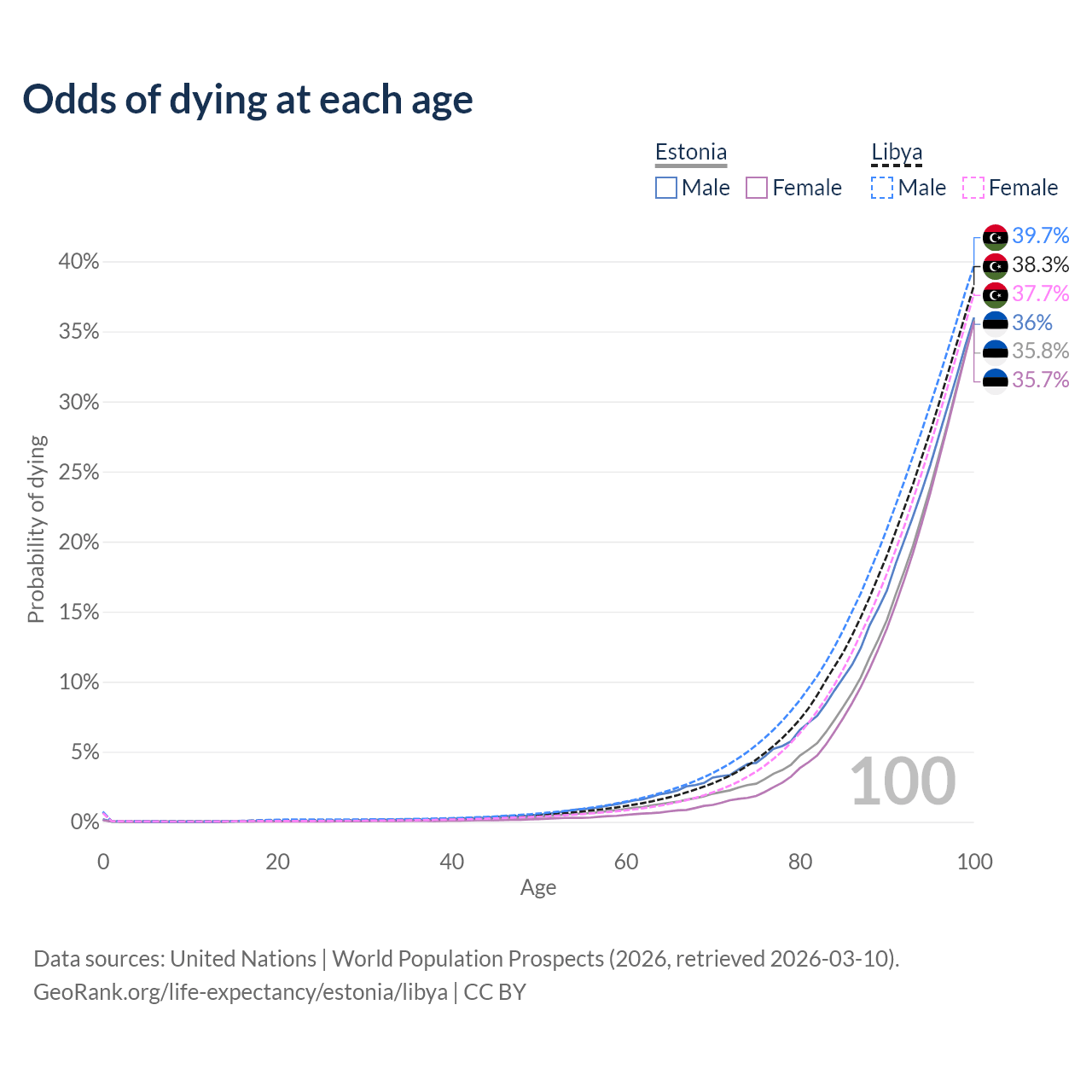 This life expectancy calculator shows the odds of living to 100, 95, 90, and below based on current age for both males and females in Estonia and Libya, along with mean and median age of death. The calculations are based on the 2026 life tables (actuarial tables) from the UN World Population Prospects.