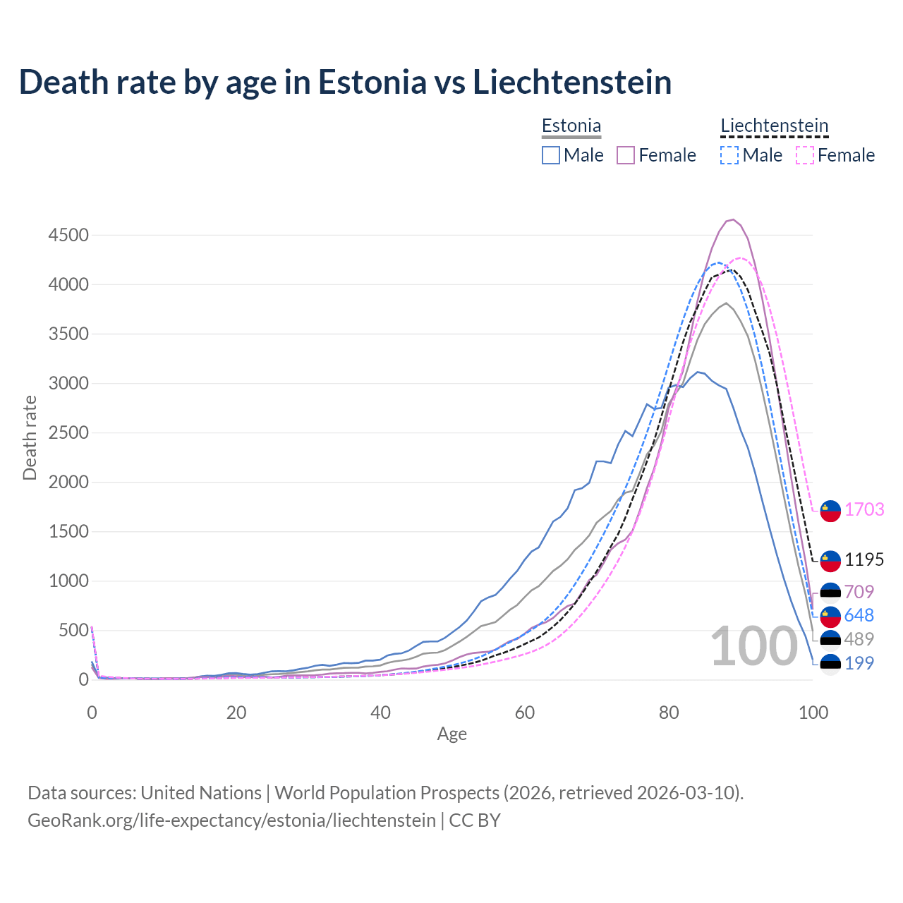 In Estonia, the most common age of death is 88, compared to 89 in Liechtenstein. The median age of death is 83.1 in Estonia and 86.3 in Liechtenstein, meaning only half of each cohort is expected to live past that age.