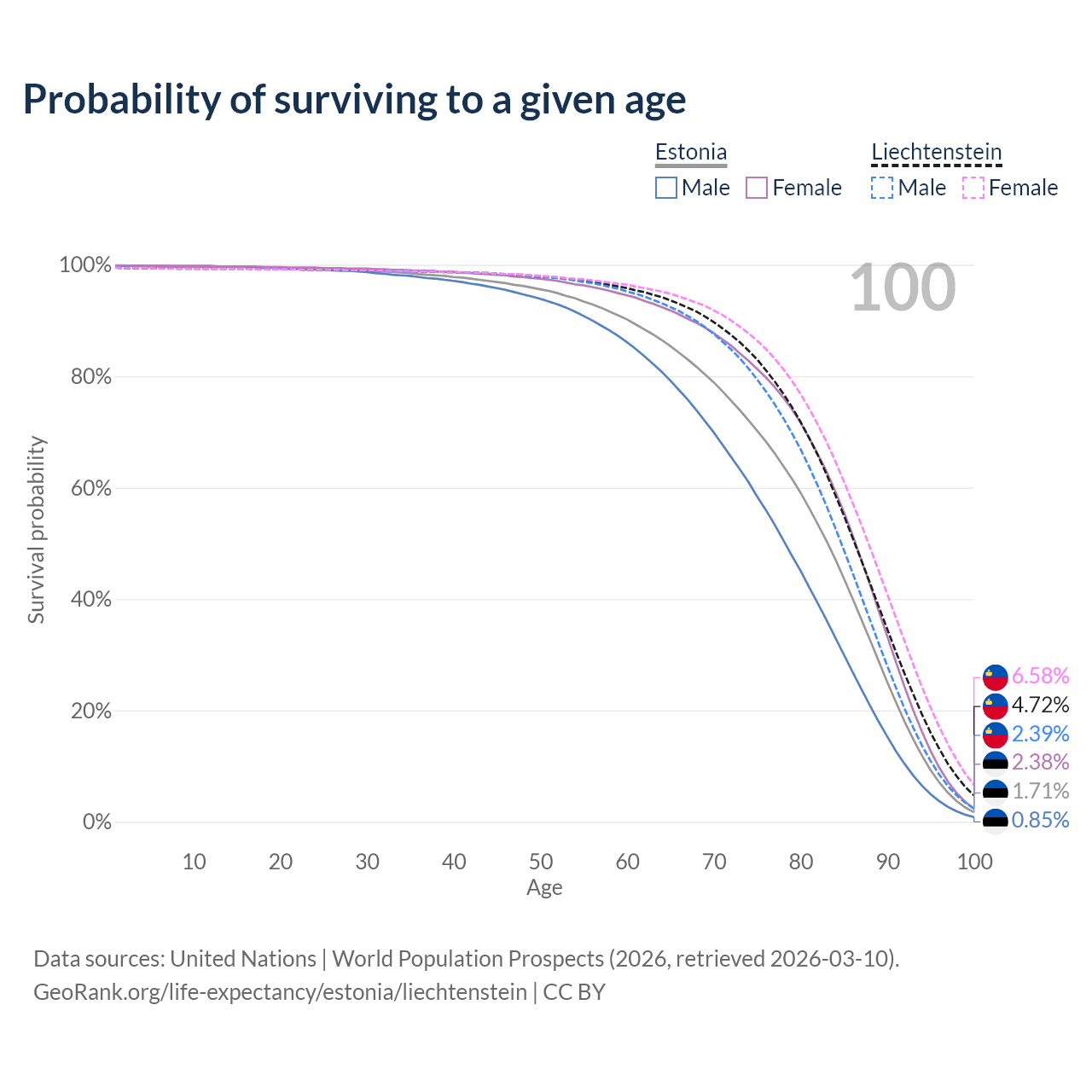 This life expectancy calculator shows the odds of living to 100, 95, 90, and below based on current age for both males and females in Estonia and Liechtenstein, along with mean and median age of death. The calculations are based on the 2026 life tables (actuarial tables) from the UN World Population Prospects.