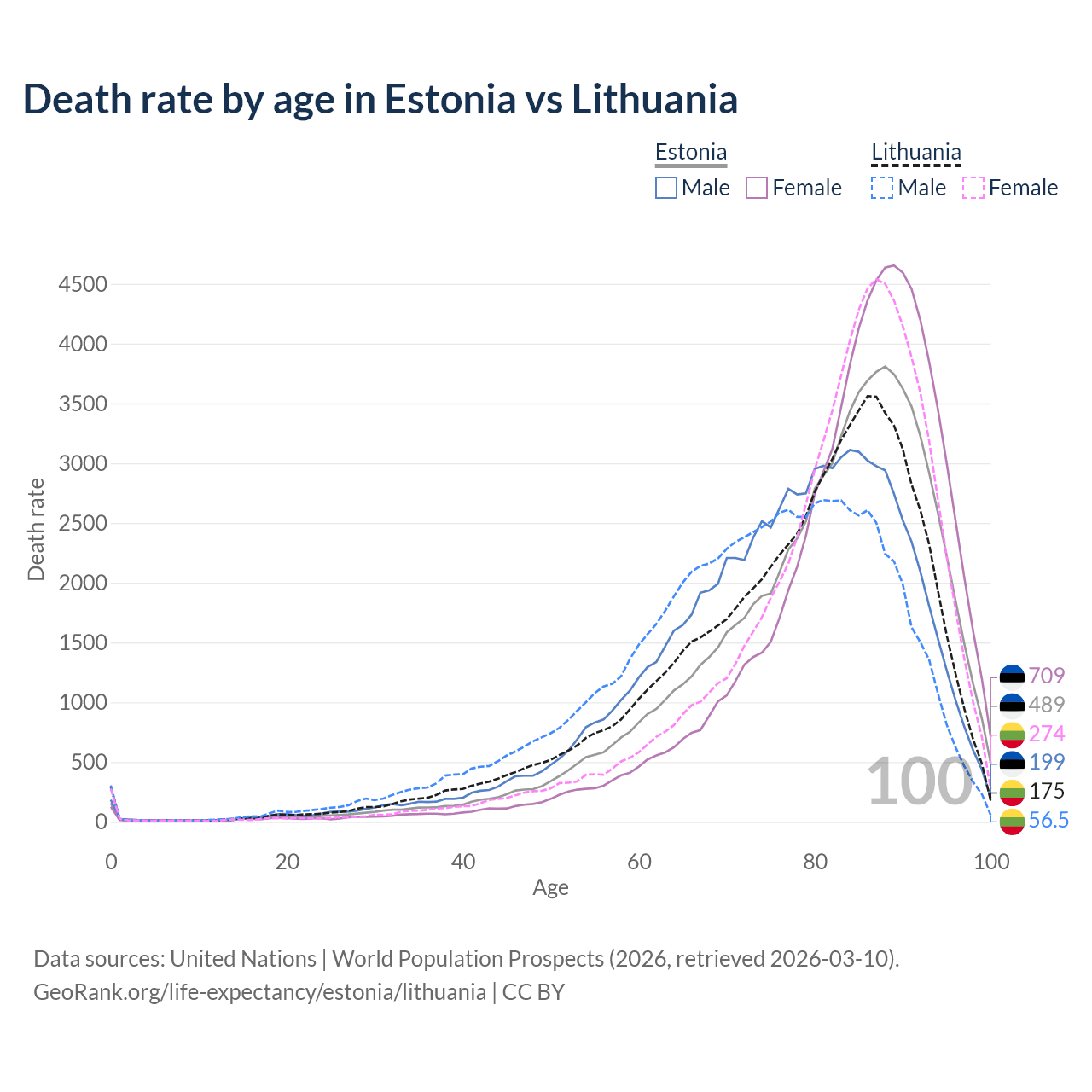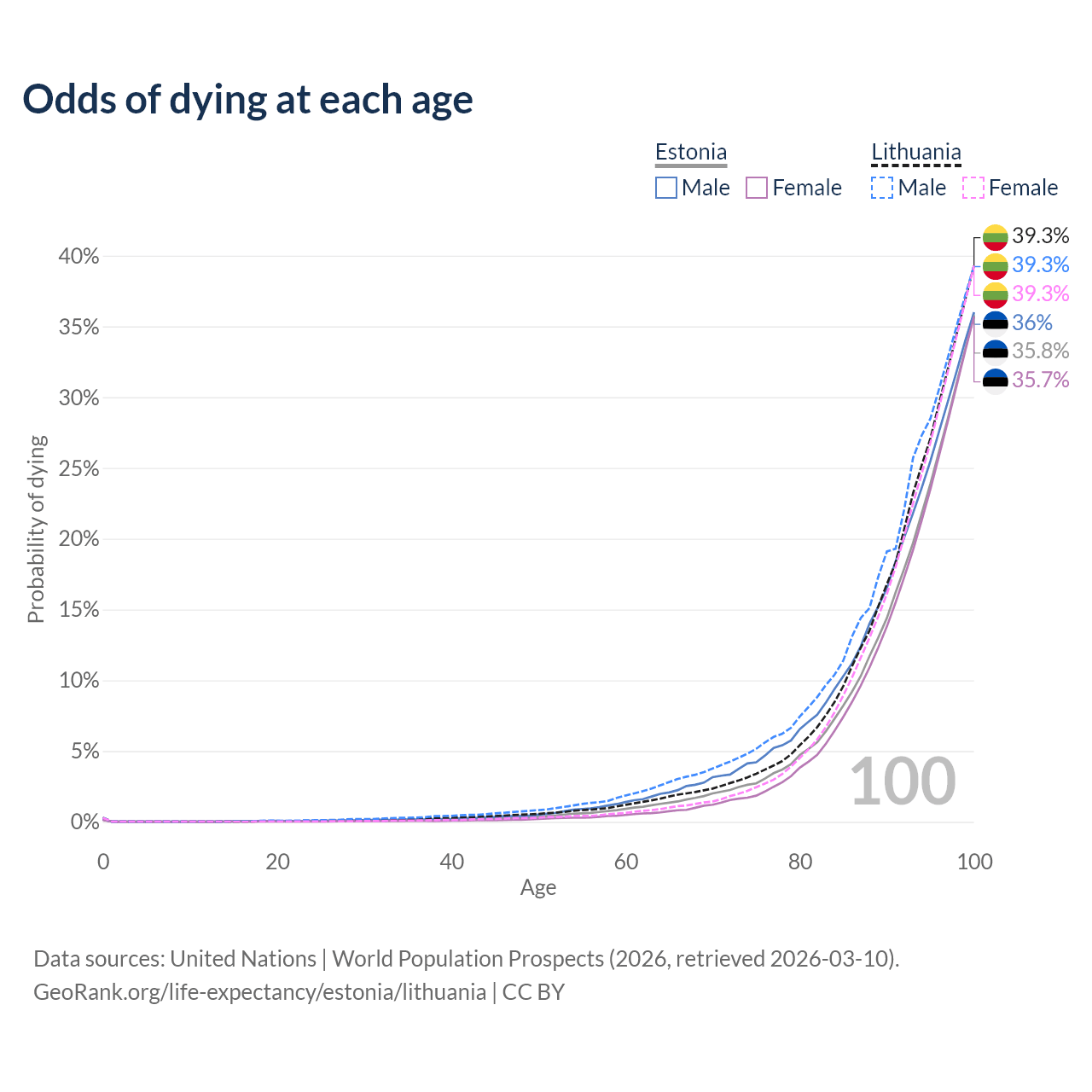 This life expectancy calculator shows the odds of living to 100, 95, 90, and below based on current age for both males and females in Estonia and Lithuania, along with mean and median age of death. The calculations are based on the 2026 life tables (actuarial tables) from the UN World Population Prospects.
