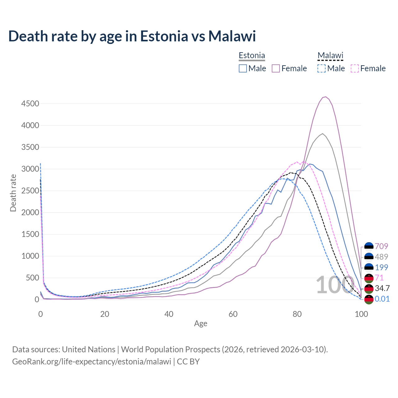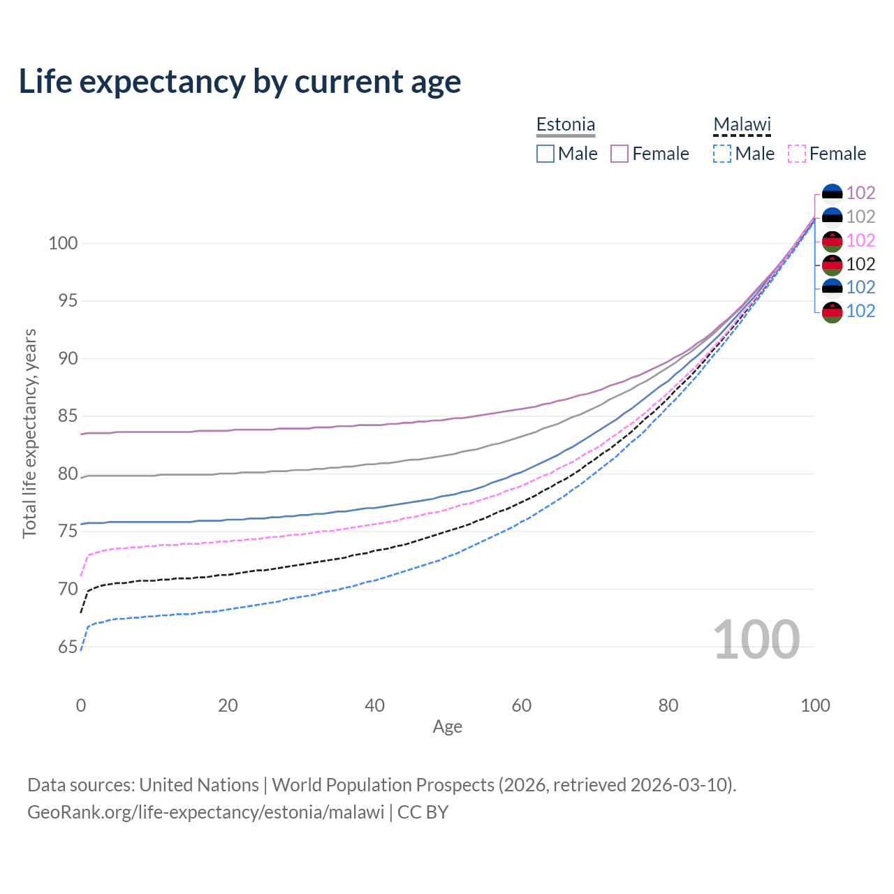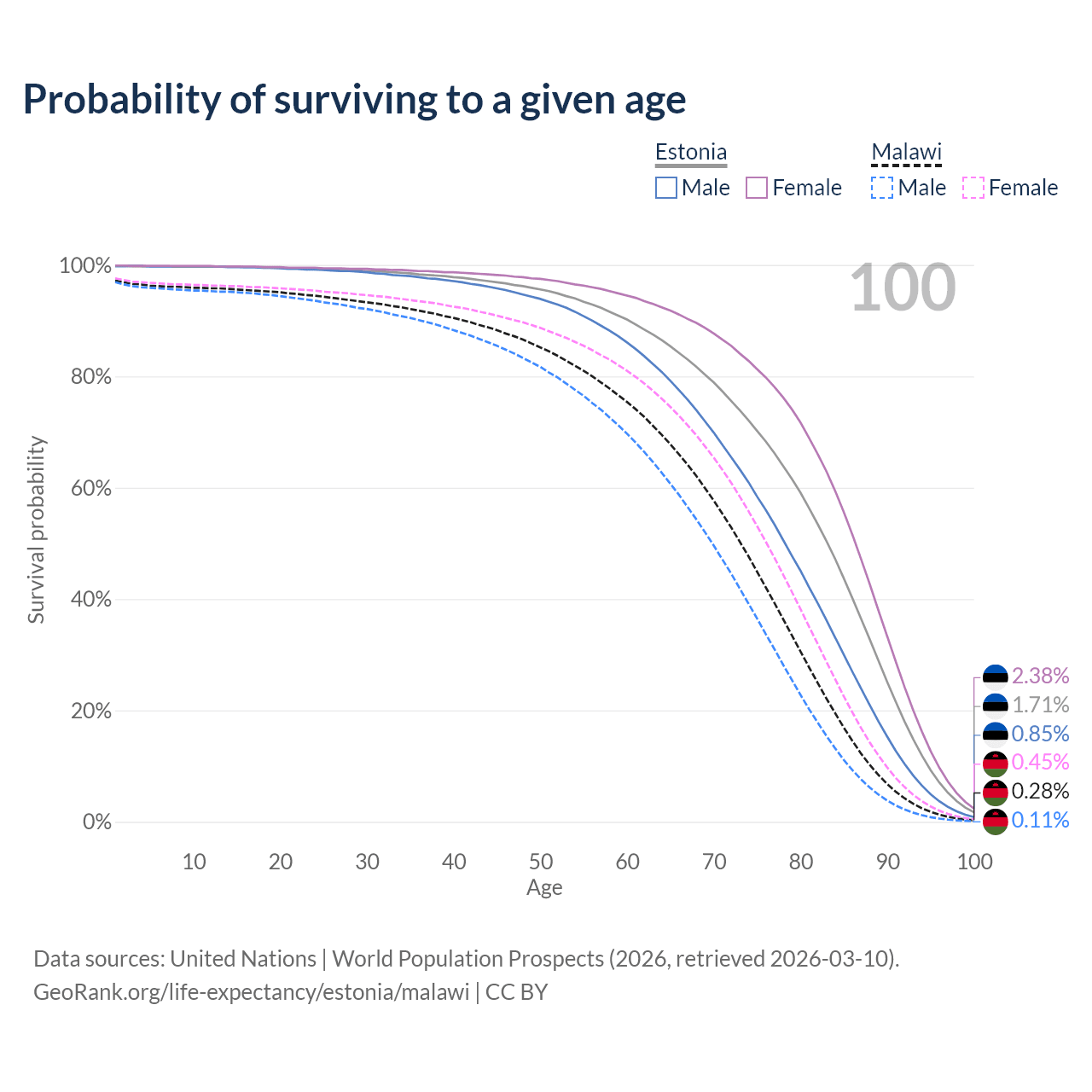 This life expectancy calculator shows the odds of living to 100, 95, 90, and below based on current age for both males and females in Estonia and Malawi, along with mean and median age of death. The calculations are based on the 2026 life tables (actuarial tables) from the UN World Population Prospects.