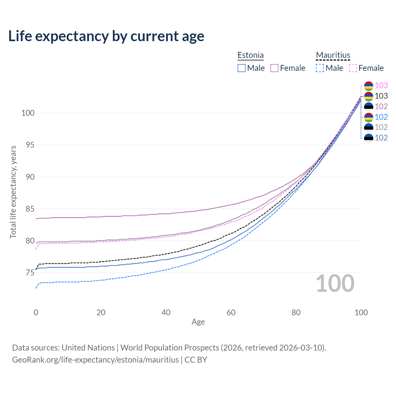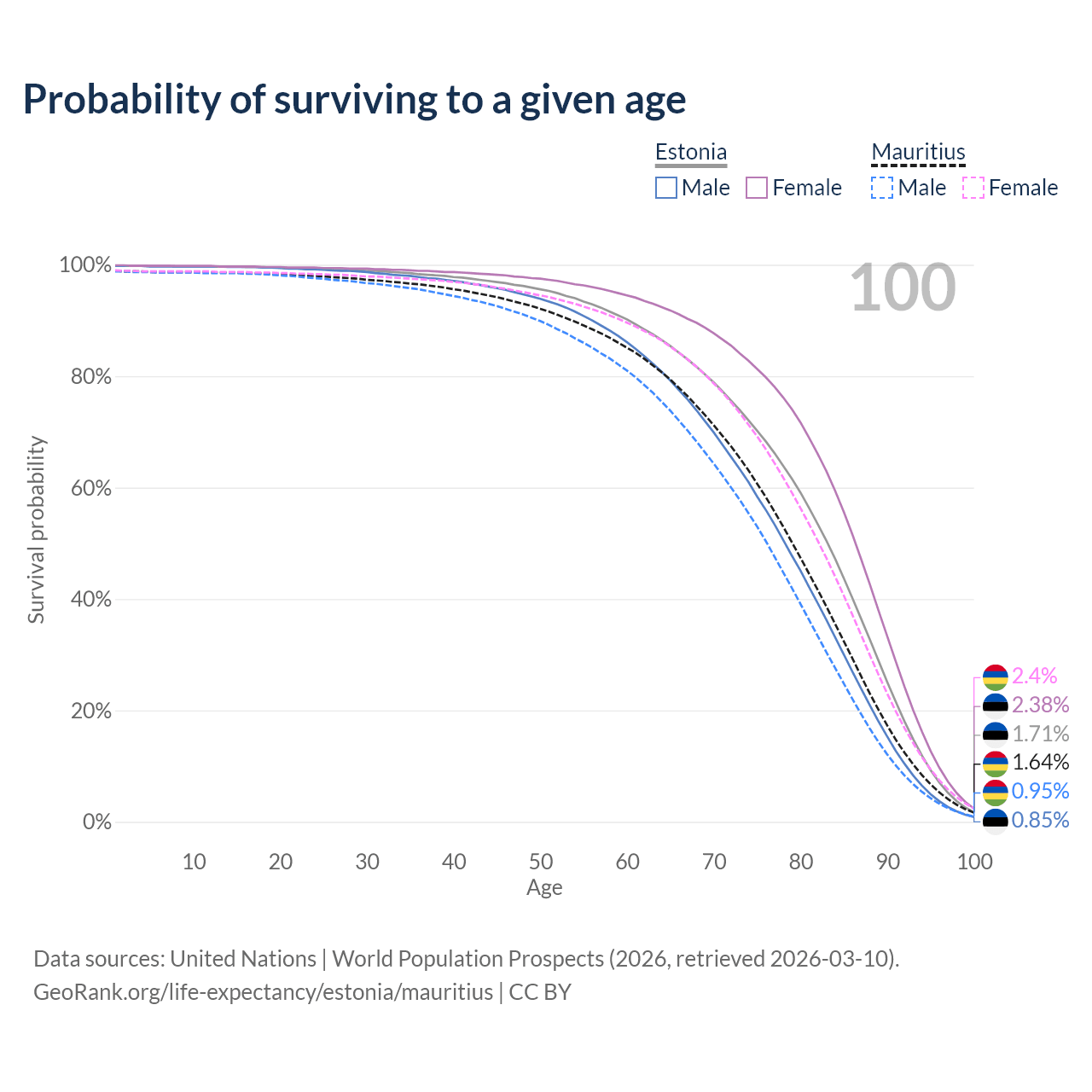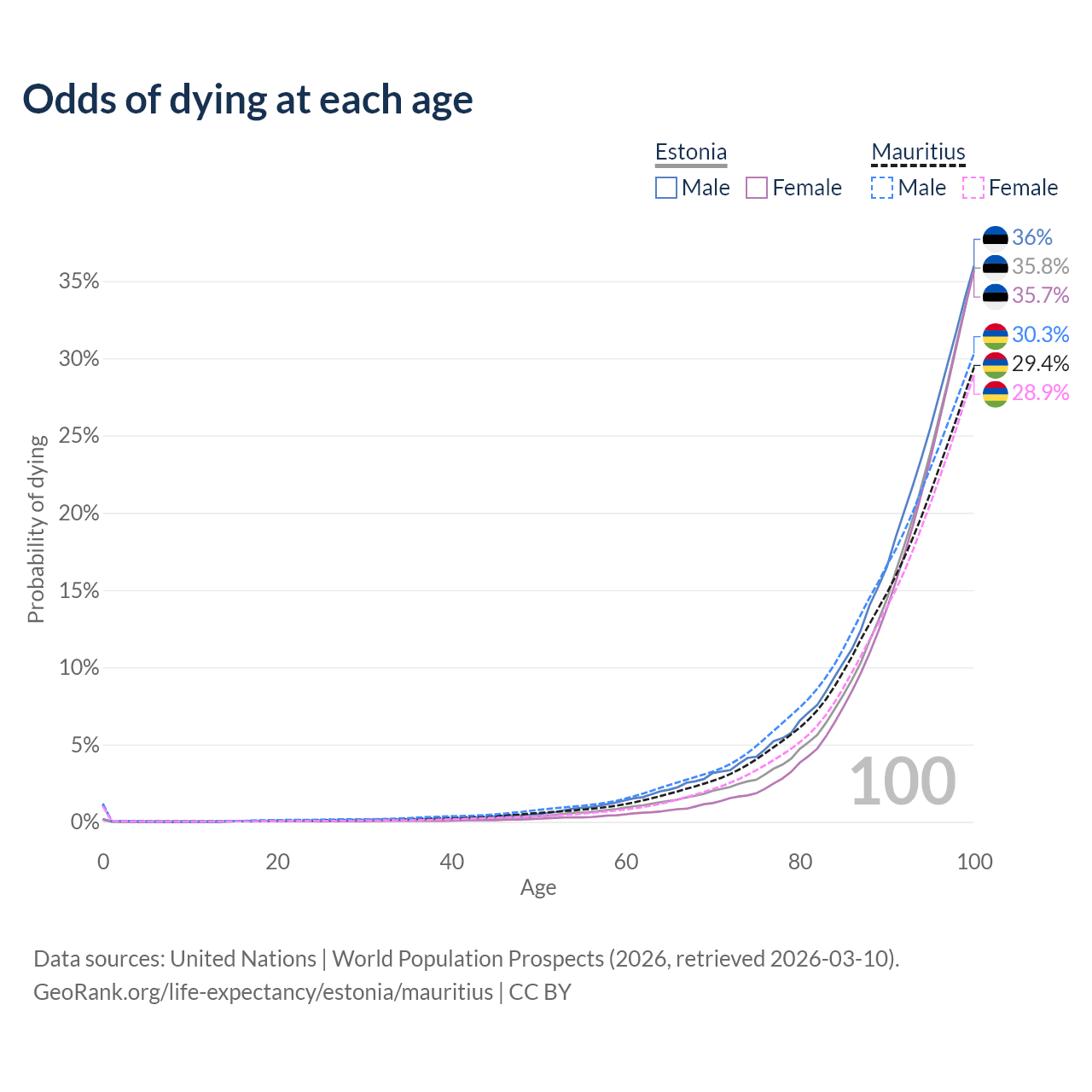 This life expectancy calculator shows the odds of living to 100, 95, 90, and below based on current age for both males and females in Estonia and Mauritius, along with mean and median age of death. The calculations are based on the 2026 life tables (actuarial tables) from the UN World Population Prospects.