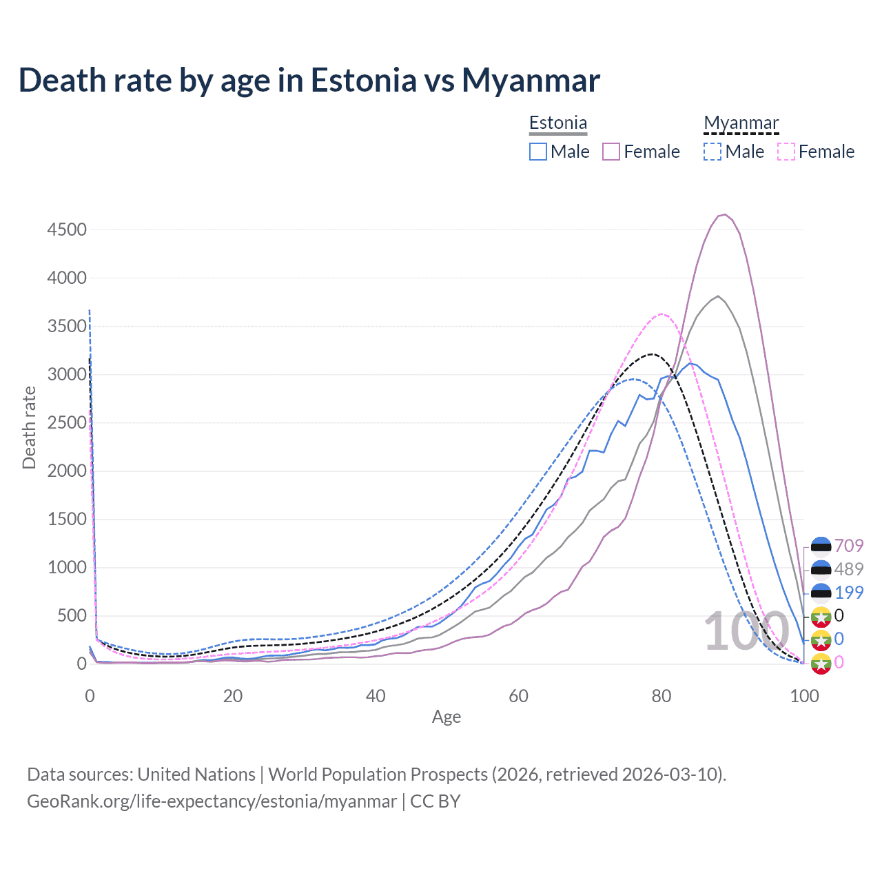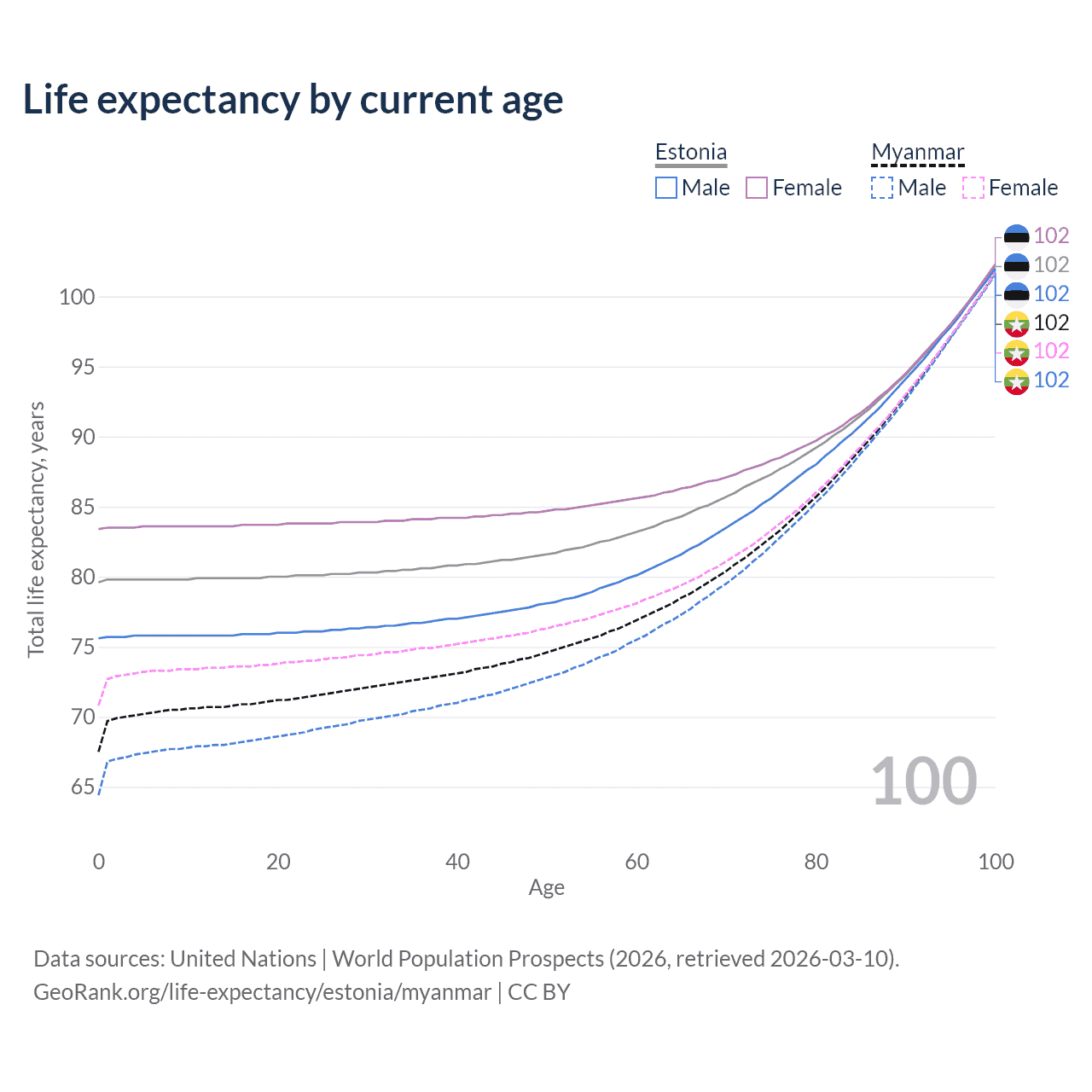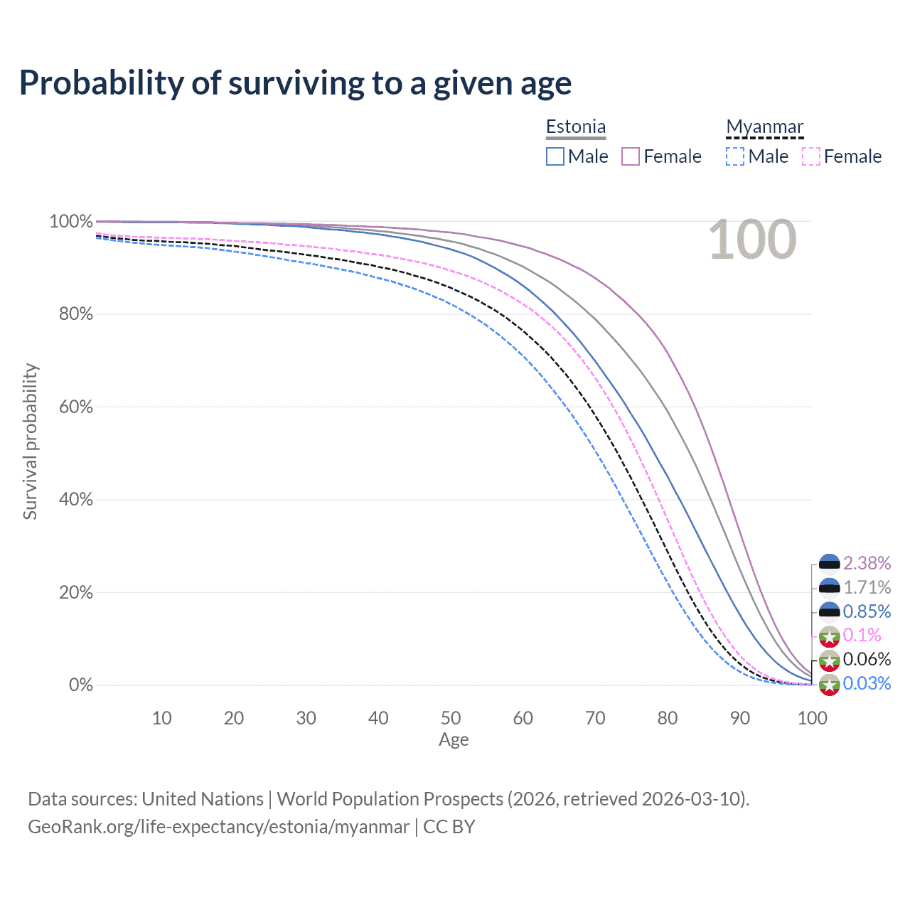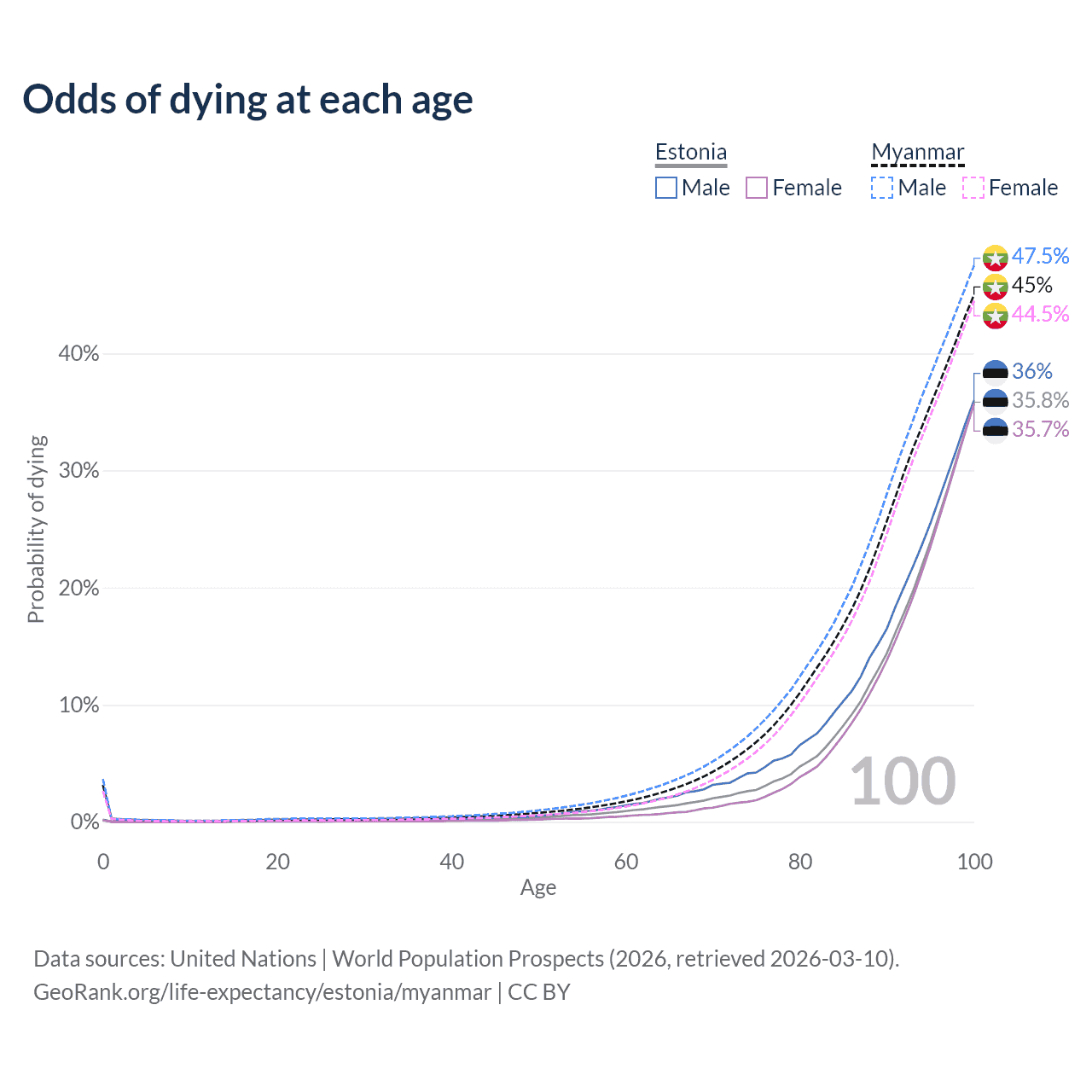This life expectancy calculator shows the odds of living to 100, 95, 90, and below based on current age for both males and females in Estonia and Myanmar, along with mean and median age of death. The calculations are based on the 2026 life tables (actuarial tables) from the UN World Population Prospects.