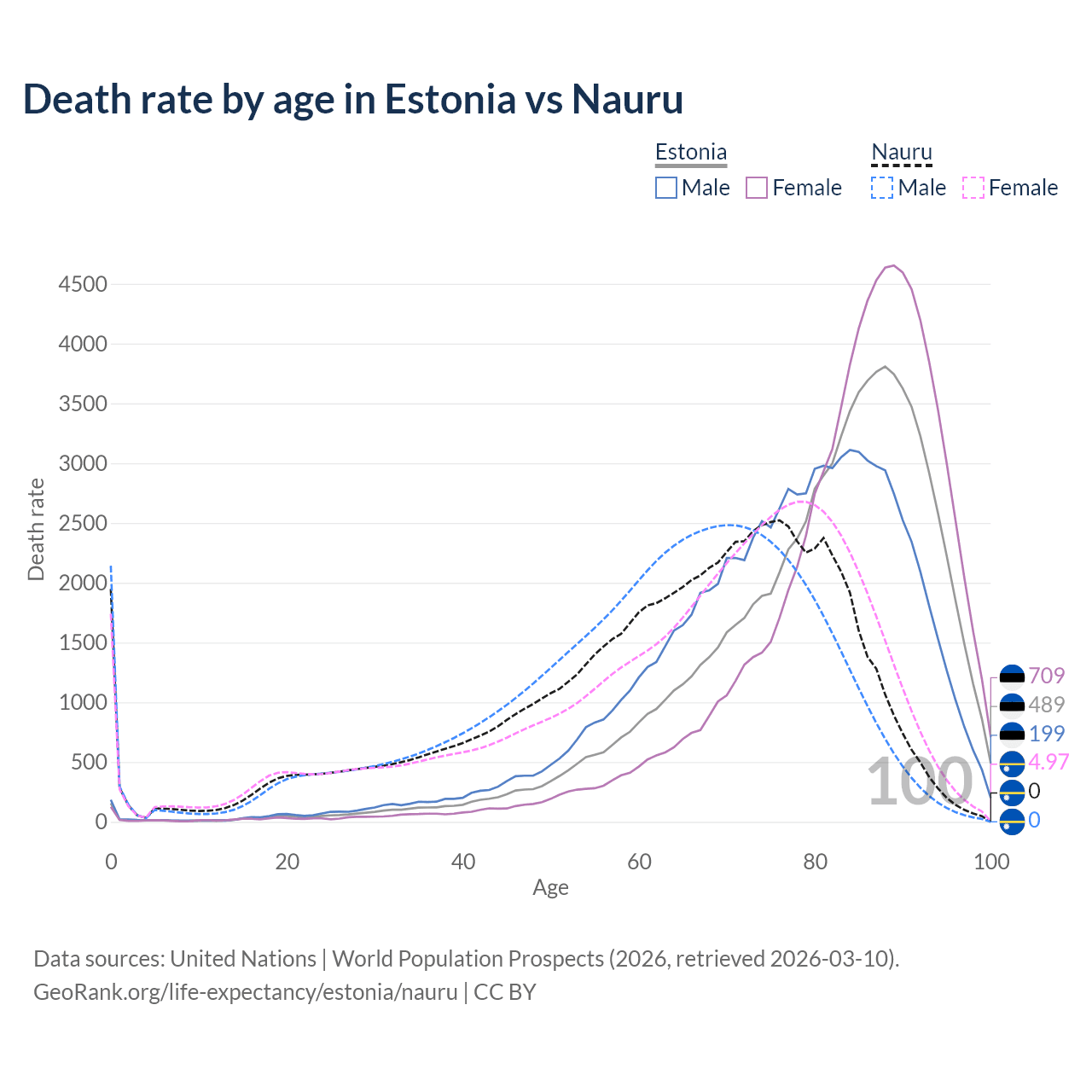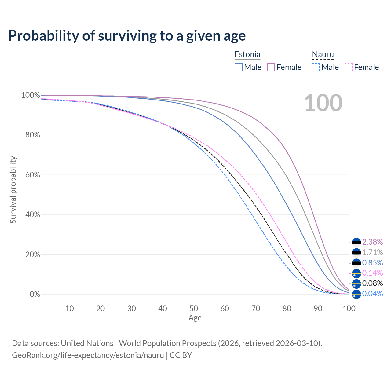 This life expectancy calculator shows the odds of living to 100, 95, 90, and below based on current age for both males and females in Estonia and Nauru, along with mean and median age of death. The calculations are based on the 2026 life tables (actuarial tables) from the UN World Population Prospects.