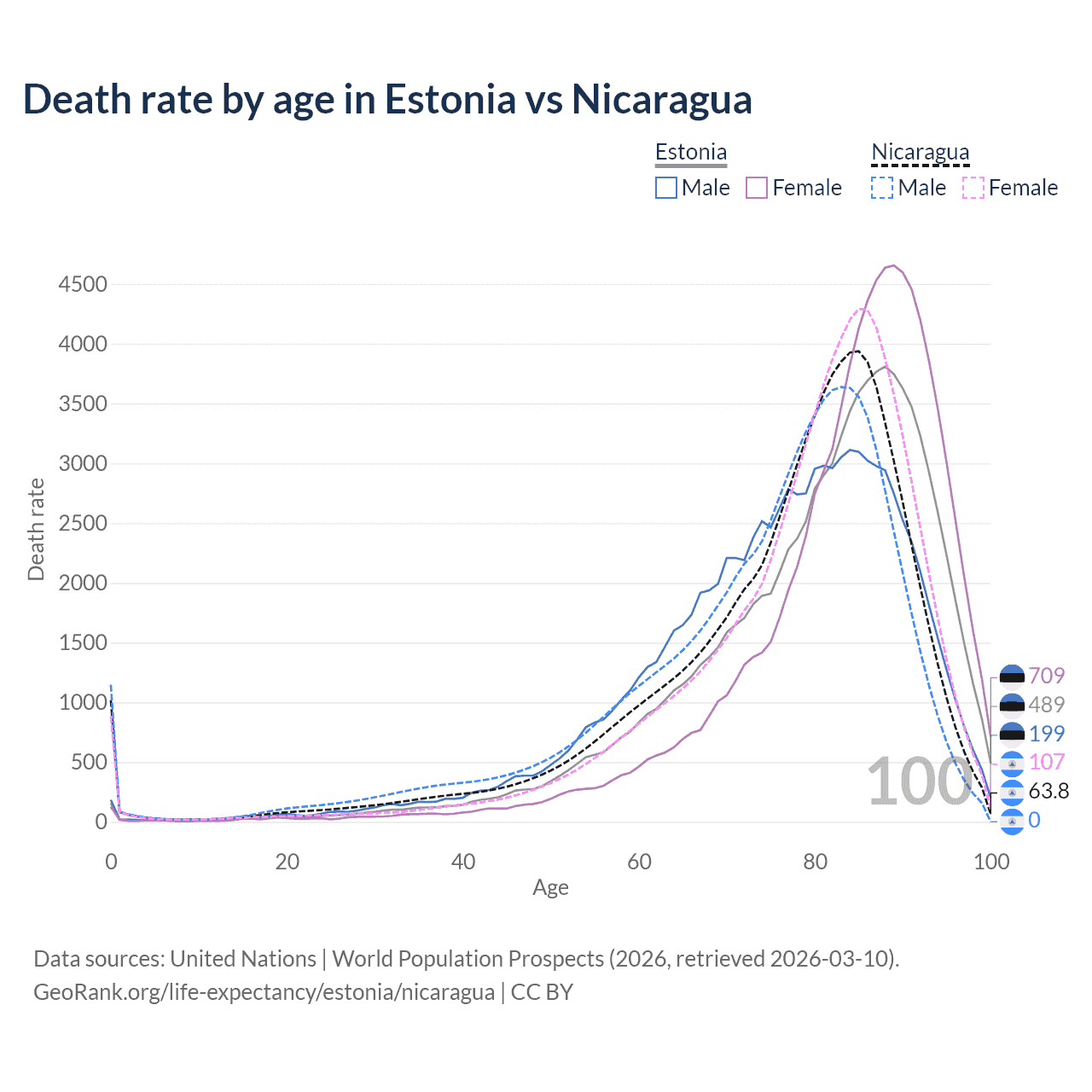 In Estonia, the most common age of death is 88, compared to 85 in Nicaragua. The median age of death is 83.1 in Estonia and 79.9 in Nicaragua, meaning only half of each cohort is expected to live past that age.