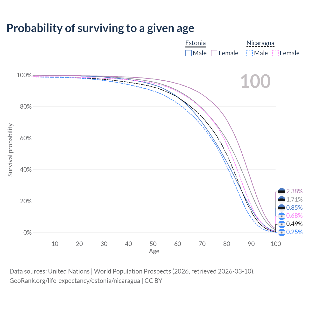 This life expectancy calculator shows the odds of living to 100, 95, 90, and below based on current age for both males and females in Estonia and Nicaragua, along with mean and median age of death. The calculations are based on the 2026 life tables (actuarial tables) from the UN World Population Prospects.