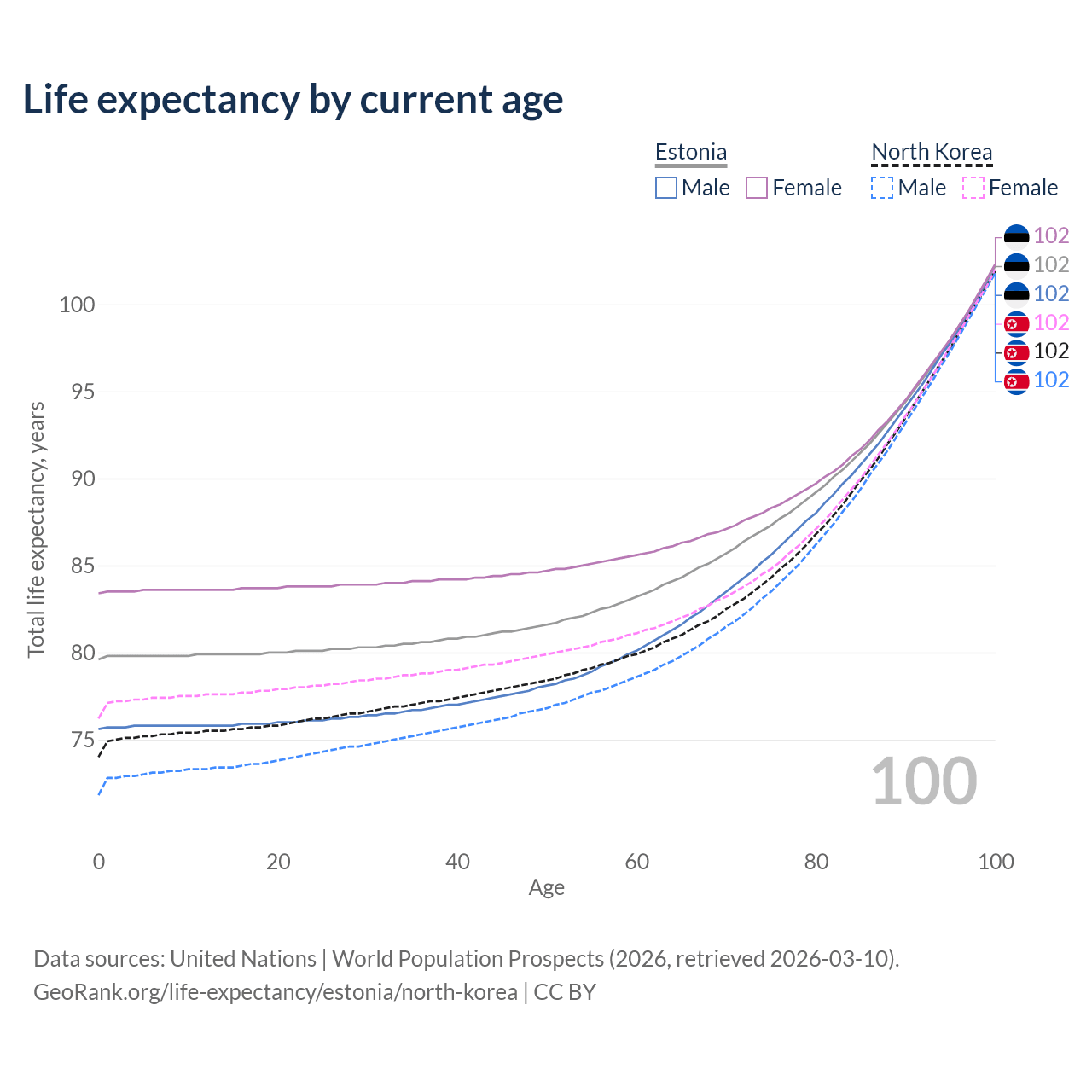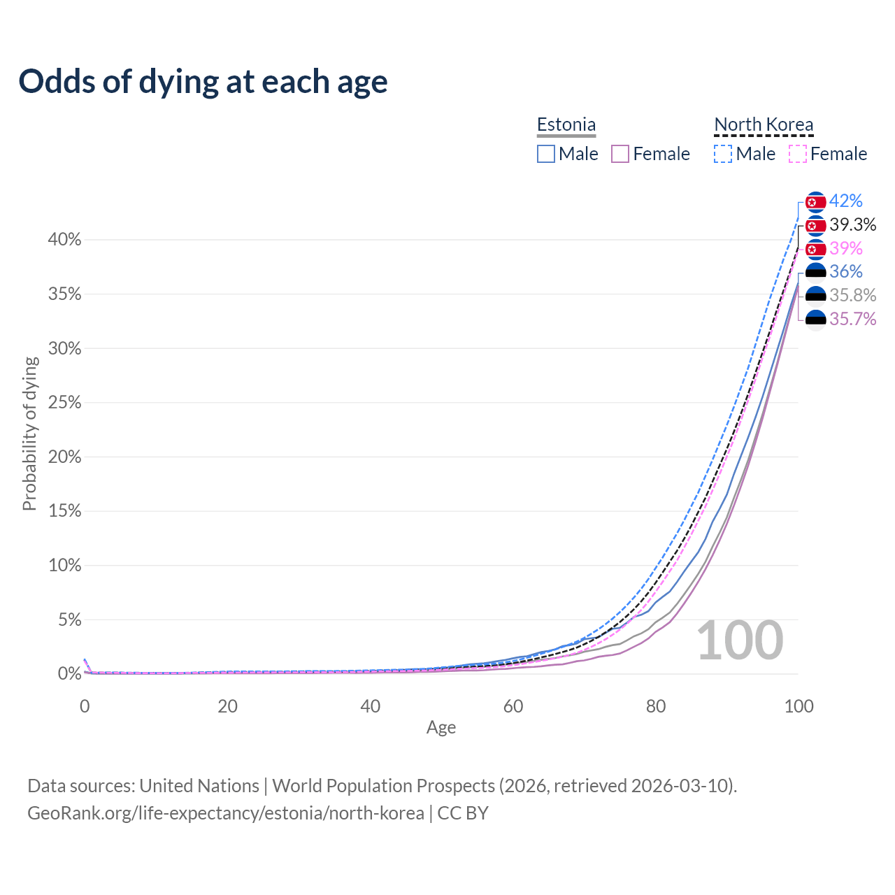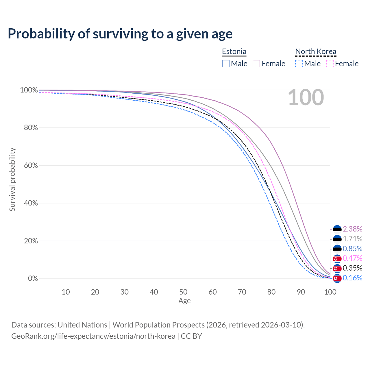 This life expectancy calculator shows the odds of living to 100, 95, 90, and below based on current age for both males and females in Estonia and North Korea, along with mean and median age of death. The calculations are based on the 2026 life tables (actuarial tables) from the UN World Population Prospects.