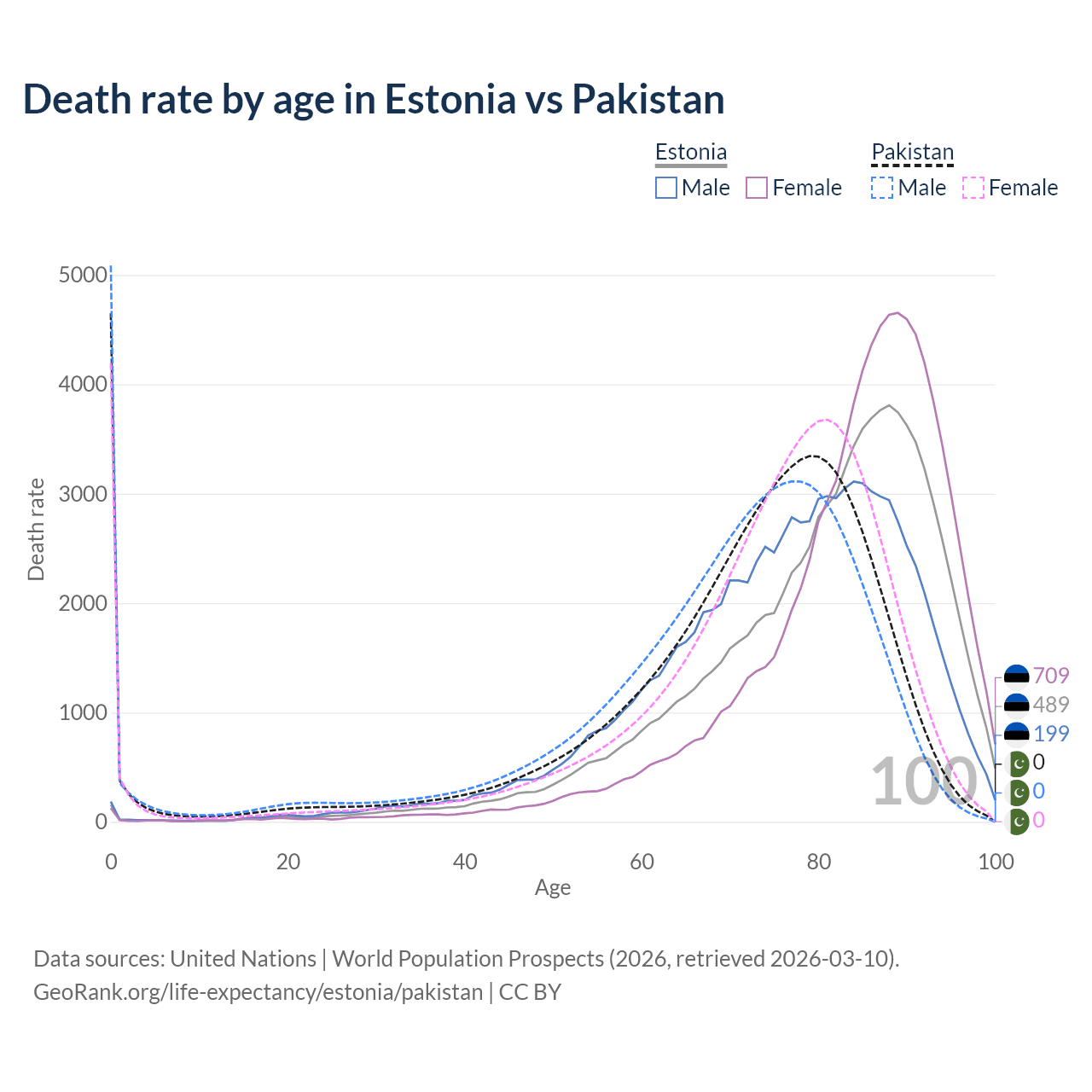 In Estonia, the most common age of death is 88, compared to 0 in Pakistan. The median age of death is 83.1 in Estonia and 74.3 in Pakistan, meaning only half of each cohort is expected to live past that age.
