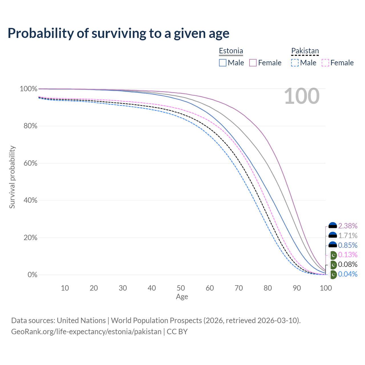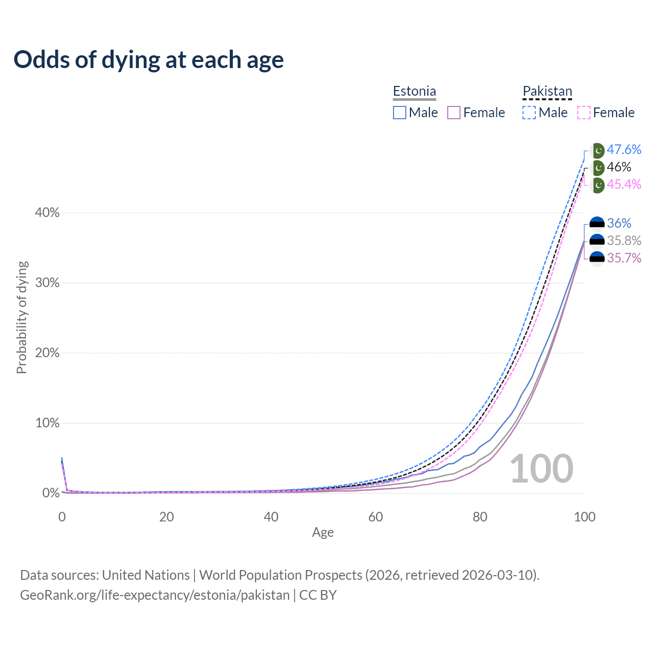 This life expectancy calculator shows the odds of living to 100, 95, 90, and below based on current age for both males and females in Estonia and Pakistan, along with mean and median age of death. The calculations are based on the 2026 life tables (actuarial tables) from the UN World Population Prospects.