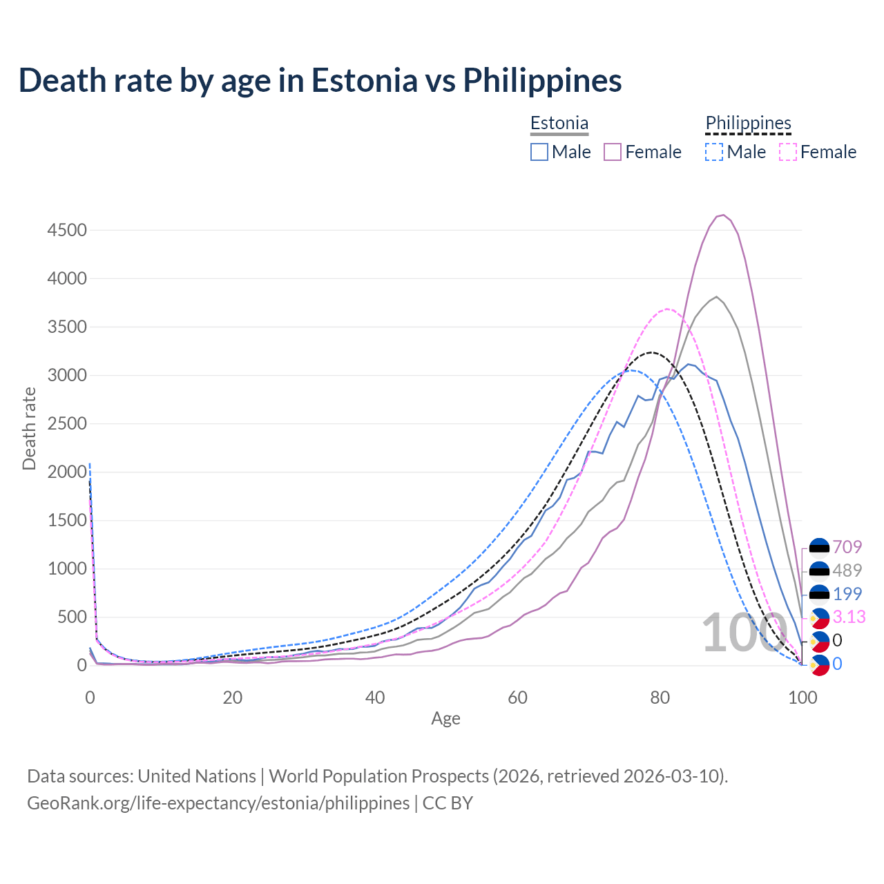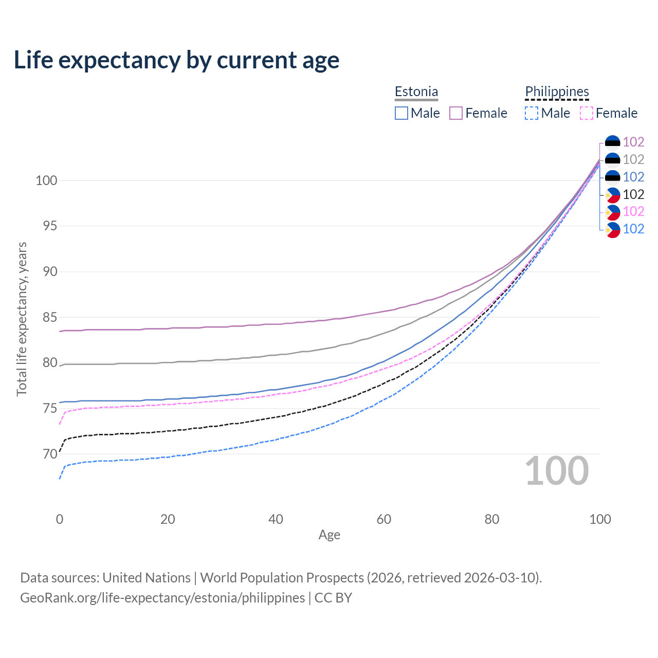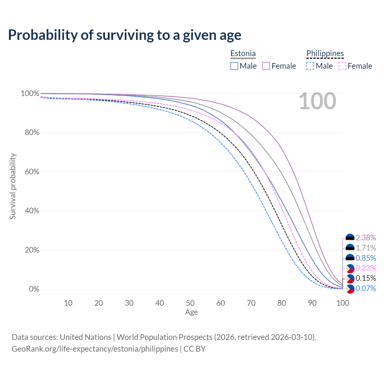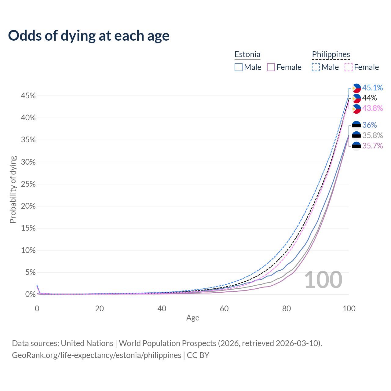 This life expectancy calculator shows the odds of living to 100, 95, 90, and below based on current age for both males and females in Estonia and the Philippines, along with mean and median age of death. The calculations are based on the 2026 life tables (actuarial tables) from the UN World Population Prospects.