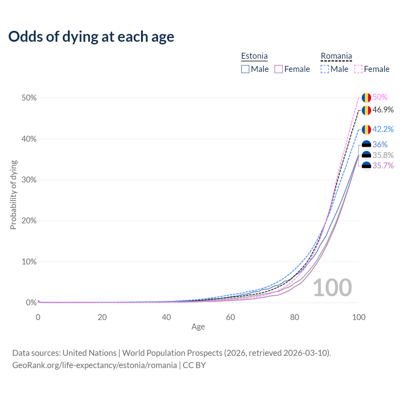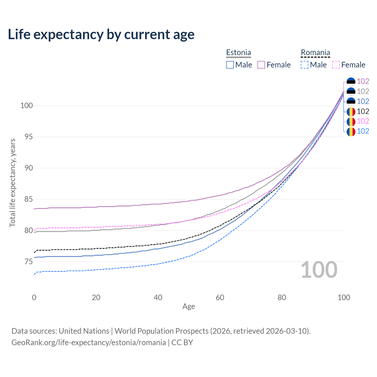 This life expectancy calculator shows the odds of living to 100, 95, 90, and below based on current age for both males and females in Estonia and Romania, along with mean and median age of death. The calculations are based on the 2026 life tables (actuarial tables) from the UN World Population Prospects.