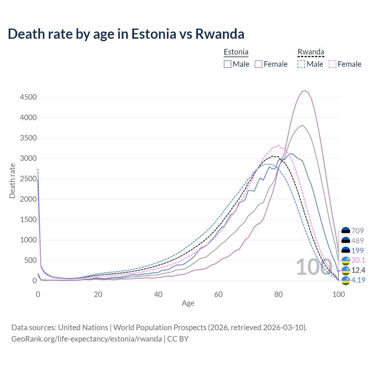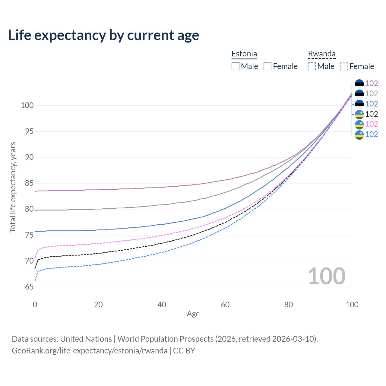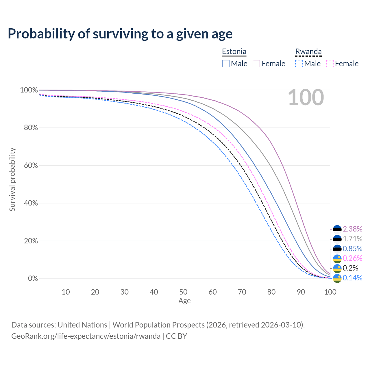 This life expectancy calculator shows the odds of living to 100, 95, 90, and below based on current age for both males and females in Estonia and Rwanda, along with mean and median age of death. The calculations are based on the 2026 life tables (actuarial tables) from the UN World Population Prospects.