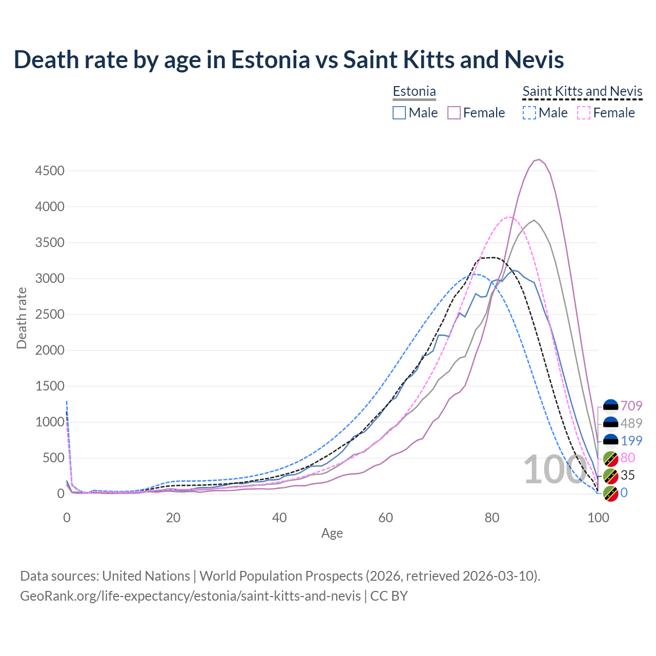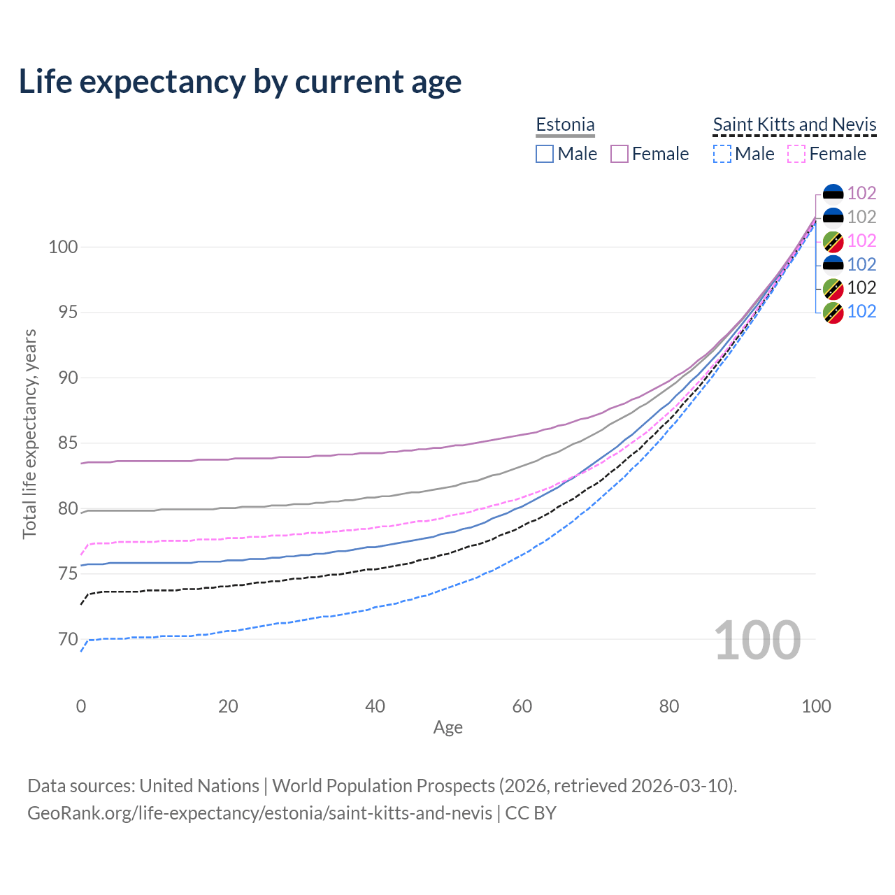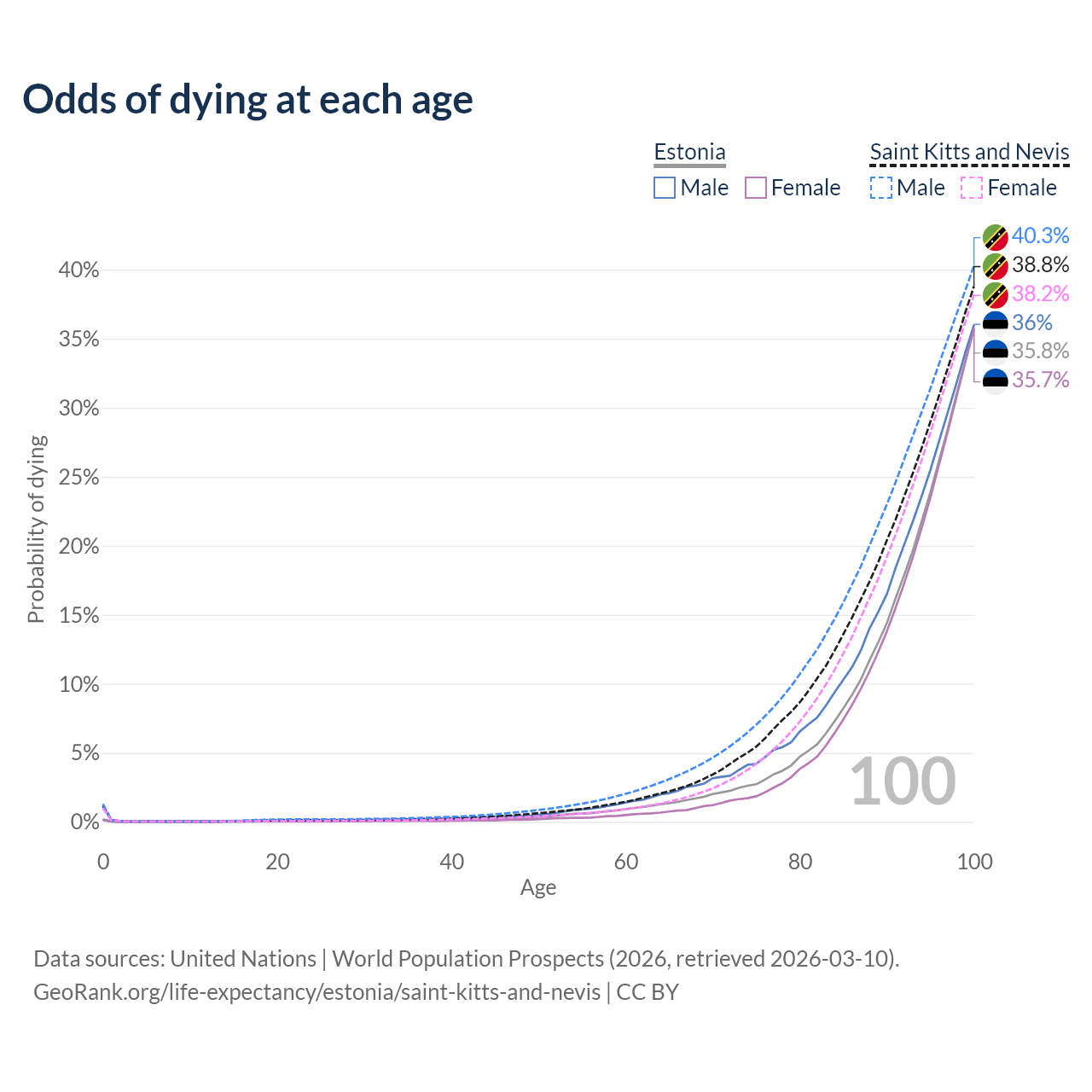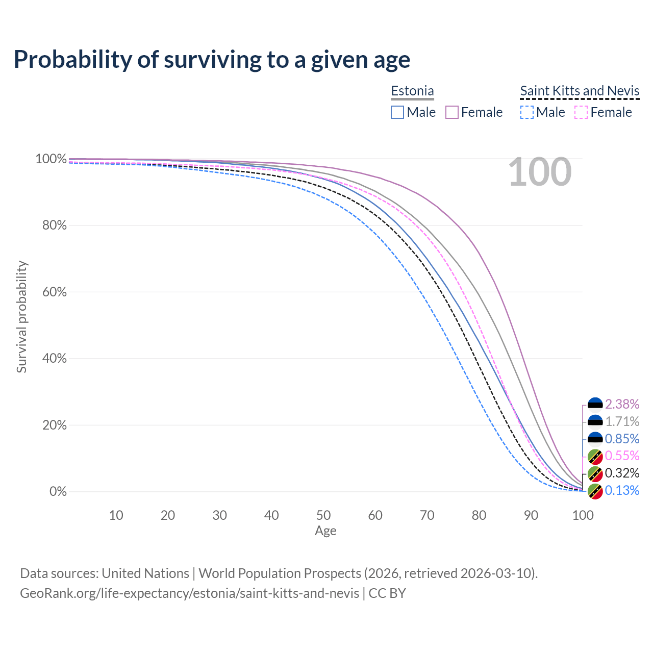 This life expectancy calculator shows the odds of living to 100, 95, 90, and below based on current age for both males and females in Estonia and Saint Kitts and Nevis, along with mean and median age of death. The calculations are based on the 2026 life tables (actuarial tables) from the UN World Population Prospects.