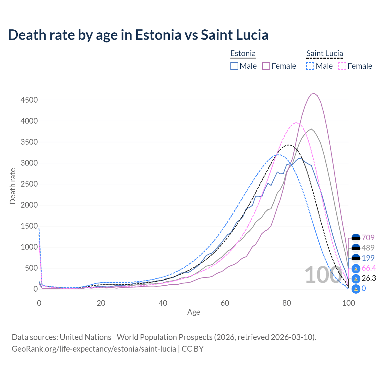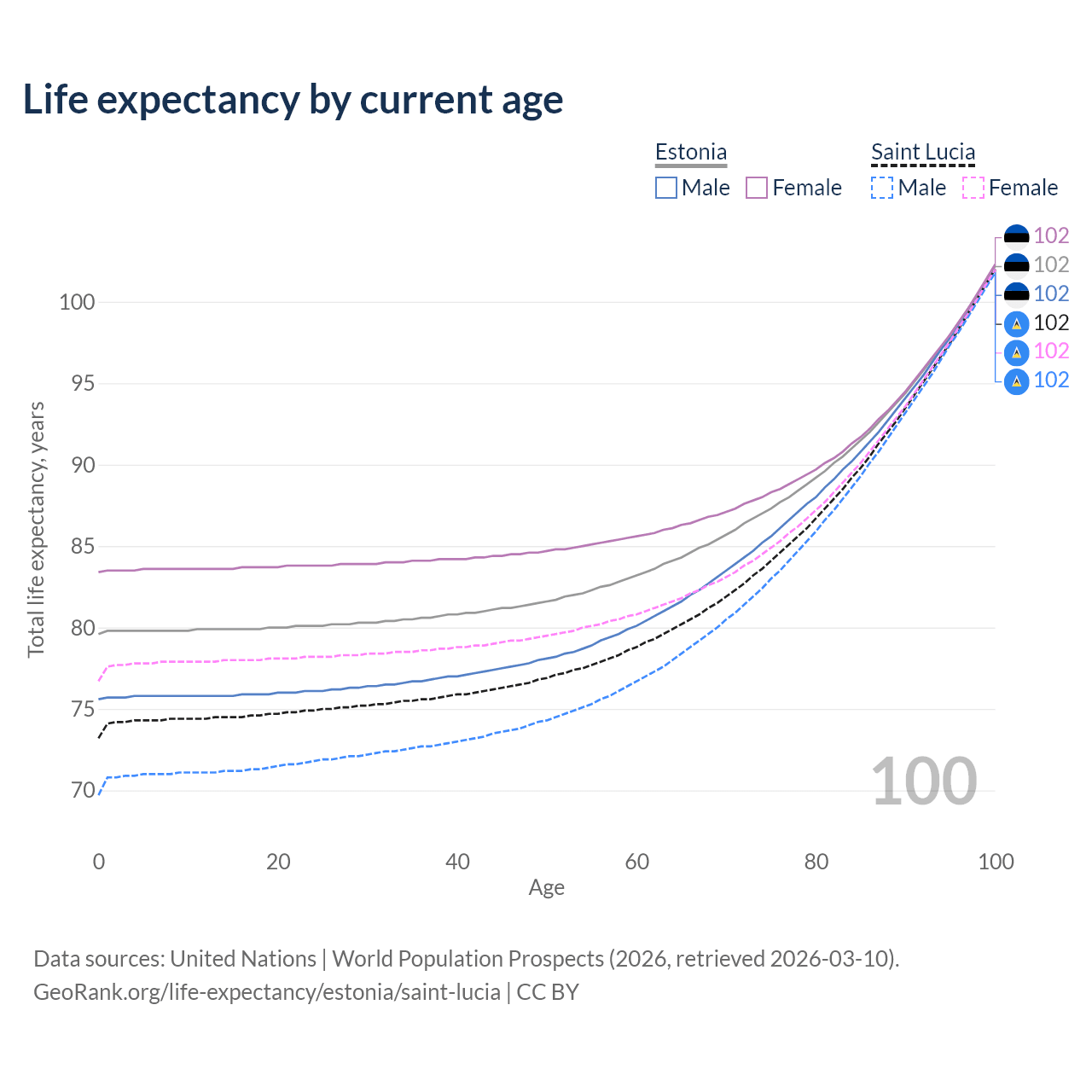 This life expectancy calculator shows the odds of living to 100, 95, 90, and below based on current age for both males and females in Estonia and Saint Lucia, along with mean and median age of death. The calculations are based on the 2026 life tables (actuarial tables) from the UN World Population Prospects.
