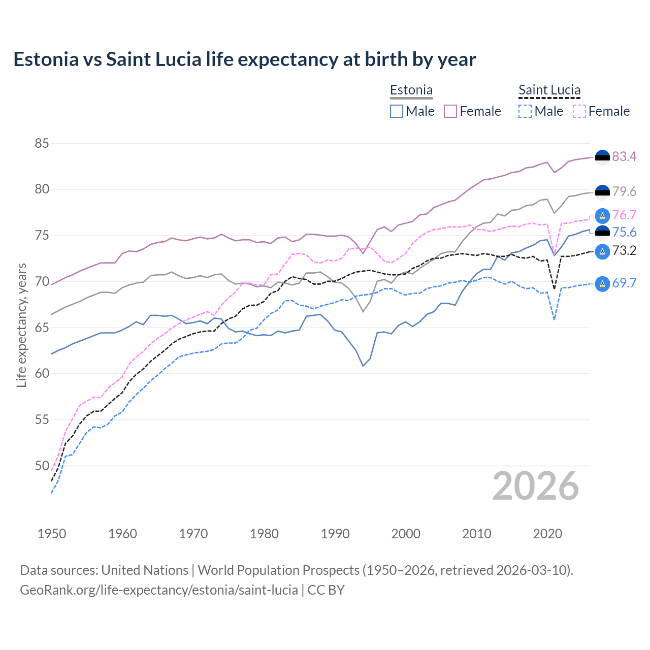 GeoRank.org/life-expectancy/estonia/saint-lucia | CC BY