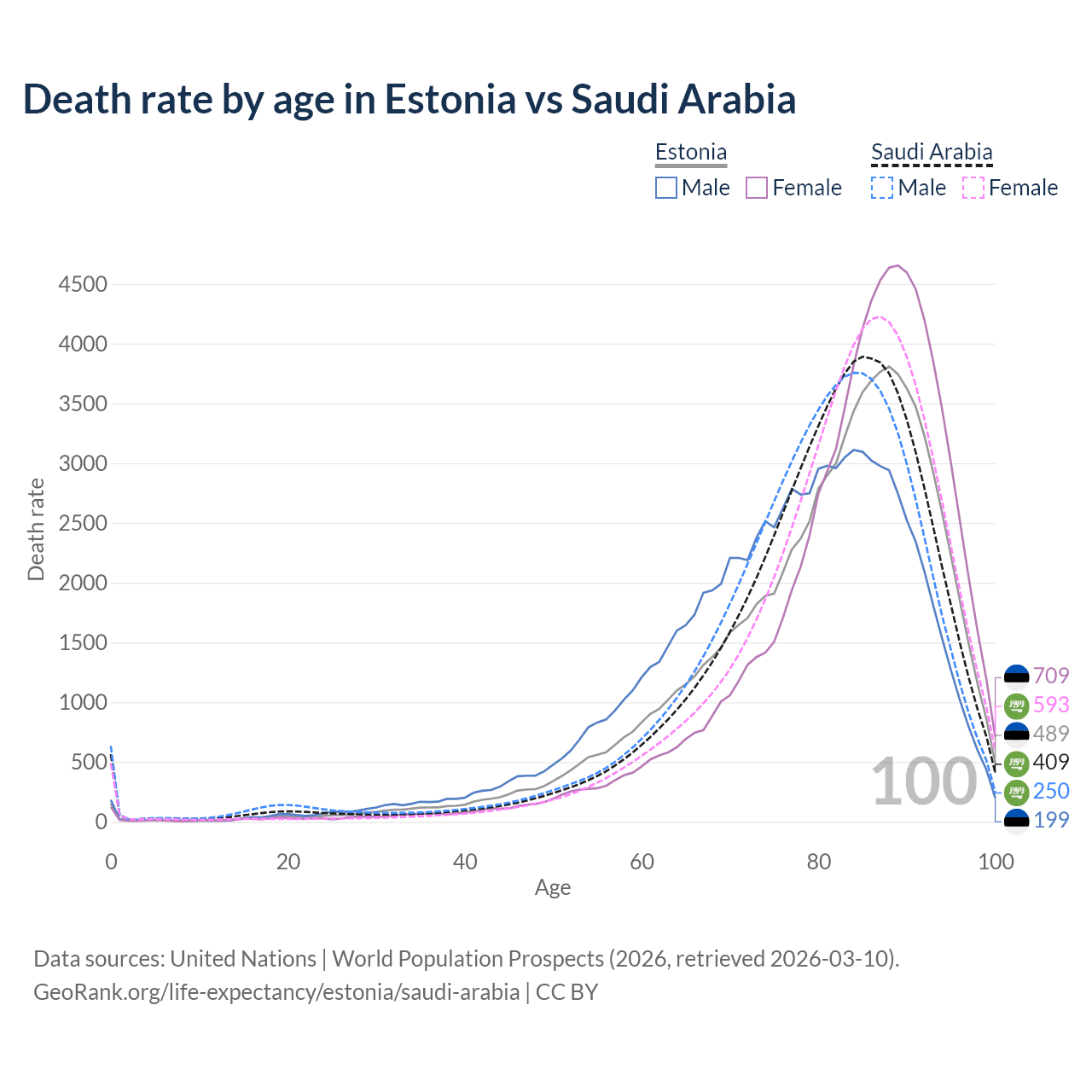 In Estonia, the most common age of death is 88, compared to 85 in Saudi Arabia. The median age of death is 83.1 in Estonia and 82.5 in Saudi Arabia, meaning only half of each cohort is expected to live past that age.
